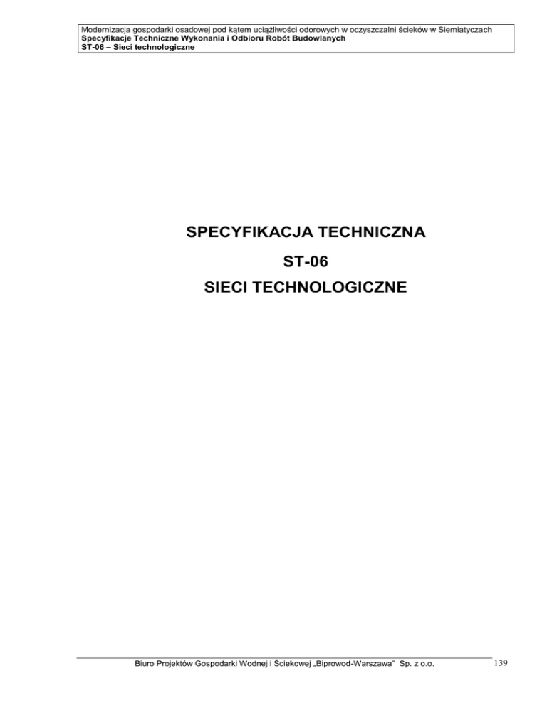 Modernizacja gospodarki osadowej pod kątem uciążliwości odorowych w oczyszczalni ścieków w Siemiatyczach Specyfikacje Techniczne Wykonania i Odbioru Robót Budowlanych ST-06 – Sieci technologiczne SPECYFIKACJA TECHNICZNA ST-06 SIECI TECHNOLOGICZNE Biuro Projektów Gospodarki Wodnej i Ściekowej „Biprowod-Warszawa” Sp. z o.o. 139 Modernizacja gospodarki osadowej pod kątem uciążliwości odorowych w oczyszczalni ścieków w Siemiatyczach Specyfikacje Techniczne Wykonania i Odbioru Robót Budowlanych ST-06 – Sieci technologiczne Spis treści 1. WSTĘP ............................................................................................................................... 141 1.1. Przedmiot Specyfikacji Technicznej ........................................................................ 141 1.2. Zakres stosowania ST .............................................................................................. 141 1.3. Zakres Robót objętych ST ........................................................................................ 141 1.4. Określenia podstawowe ........................................................................................... 142 1.5. Ogólne wymagania dotyczące robót ....................................................................... 142 2. MATERIAŁY - WYMAGANIA I STANDARDY .................................................................... 142 2.1. Armatura .................................................................................................................... 142 2.1.1. Zasuwy nożowe ................................................................................................... 142 2.1.2. Zawory odcinające kulowe ................................................................................... 143 2.2. Rury i kształtki........................................................................................................... 143 2.2.1. Rury ze stali kwasoodpornej ................................................................................ 144 2.2.2. Rury z PEHD ....................................................................................................... 144 2.2.3. Rury z PVC .......................................................................................................... 144 2.3. Hydranty .................................................................................................................... 144 2.4. Studzienki betonowe D 1,2 ....................................................................................... 145 2.5. Złącza mechaniczne.................................................................................................. 145 2.5.1. Uniwersalna opaska do nawiercania .................................................................... 145 2.5.2. Połączenia kołnierzowe ....................................................................................... 145 3. SPRZĘT ............................................................................................................................. 146 4. TRANSPORT I SKŁADOWANIE ........................................................................................ 146 5. WYKONANIE ROBÓT........................................................................................................ 147 5.1. Roboty ziemne .......................................................................................................... 147 5.1.1. Wykopy................................................................................................................ 147 5.1.2. Zasypki ................................................................................................................ 147 5.2. Montaż wodociągu .................................................................................................... 148 5.2.1. Zabezpieczenia antykorozyjne ............................................................................. 148 5.2.2. Płukanie i dezynfekcja wodociągów ..................................................................... 148 5.3. Rurociągi stalowe ..................................................................................................... 148 5.4. Rurociągi z PEHD ...................................................................................................... 149 5.5. Rurociągi z PVC ........................................................................................................ 149 5.6. Studzienki kanalizacyjne z kręgów żelbetowych .................................................... 151 5.7. Połączenia ................................................................................................................. 152 5.7.1. Połączenia spawane ............................................................................................ 152 5.7.2. Połączenia rozłączalne ........................................................................................ 152 6. KONTROLA JAKOŚCI ROBÓT ......................................................................................... 152 6.1. Bieżąca kontrola Inżyniera ....................................................................................... 152 6.2. Badanie i próba szczelności rurociągów. ............................................................... 153 6.3. Kontrola wykonania zgrzewu czołowego i elektrooporowego............................... 153 6.4. Sprawdzenie zagęszczenia gruntów ........................................................................ 154 6.5. Bieżąca kontrola Wykonawcy .................................................................................. 154 7. OBMIAR ROBÓT ............................................................................................................... 154 8. ODBIÓR ROBÓT ............................................................................................................... 154 8.1. Wymagania ogólne .................................