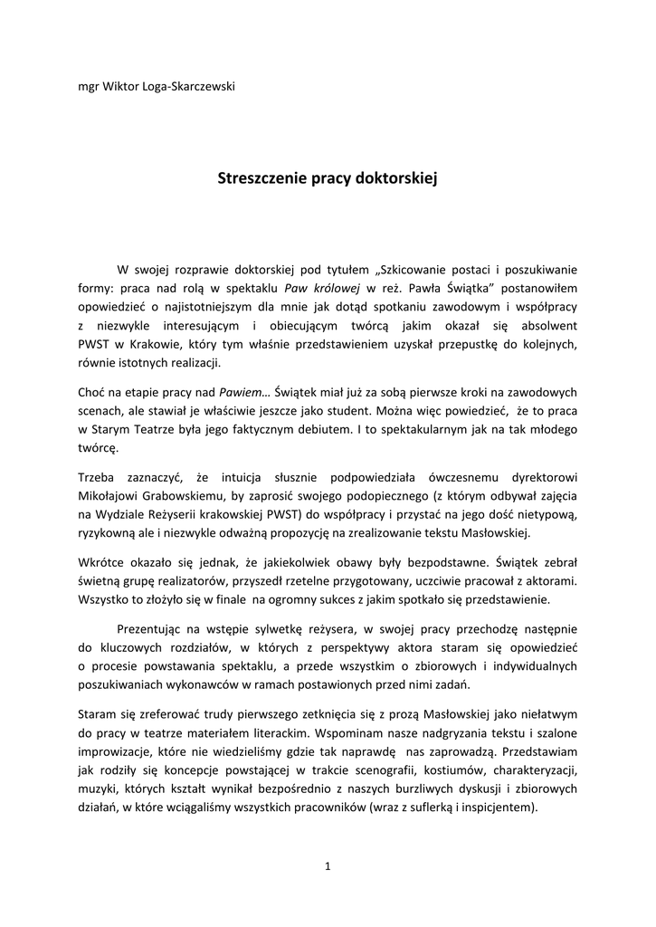 mgr Wiktor Loga-Skarczewski Streszczenie pracy doktorskiej W swojej rozprawie doktorskiej pod tytułem „Szkicowanie postaci i poszukiwanie formy: praca nad rolą w spektaklu Paw królowej w reż. Pawła Świątka” postanowiłem opowiedzieć o najistotniejszym dla mnie jak dotąd spotkaniu zawodowym i współpracy z niezwykle interesującym i obiecującym twórcą jakim okazał się absolwent PWST w Krakowie, który tym właśnie przedstawieniem uzyskał przepustkę do kolejnych, równie istotnych realizacji. Choć na etapie pracy nad Pawiem… Świątek miał już za sobą pierwsze kroki na zawodowych scenach, ale stawiał je właściwie jeszcze jako student. Można więc powiedzieć, że to praca w Starym Teatrze była jego faktycznym debiutem. I to spektakularnym jak na tak młodego twórcę. Trzeba zaznaczyć, że intuicja słusznie podpowiedziała ówczesnemu dyrektorowi Mikołajowi Grabowskiemu, by zaprosić swojego podopiecznego (z którym odbywał zajęcia na Wydziale Reżyserii krakowskiej PWST) do współpracy i przystać na jego dość nietypową, ryzykowną ale i niezwykle odważną propozycję na zrealizowanie tekstu Masłowskiej. Wkrótce okazało się jednak, że jakiekolwiek obawy były bezpodstawne. Świątek zebrał świetną grupę realizatorów, przyszedł rzetelne przygotowany, uczciwie pracował z aktorami. Wszystko to złożyło się w finale na ogromny sukces z jakim spotkało się przedstawienie. Prezentując na wstępie sylwetkę reżysera, w swojej pracy przechodzę następnie do kluczowych rozdziałów, w których z perspektywy aktora staram się opowiedzieć o procesie powstawania spektaklu, a przede wszystkim o zbiorowych i indywidualnych poszukiwaniach wykonawców w ramach postawionych przed nimi zadań. Staram się zreferować trudy pierwszego zetknięcia się z prozą Masłowskiej jako niełatwym do pracy w teatrze materiałem literackim. Wspominam nasze nadgryzania tekstu i szalone improwizacje, które nie wiedzieliśmy gdzie tak naprawdę nas zaprowadzą. Przedstawiam jak rodziły się koncepcje powstającej w trakcie scenografii, kostiumów, charakteryzacji, muzyki, których kształt wynikał bezpośrednio z naszych burzliwych dyskusji i zbiorowych działań, w które wciągaliśmy wszystkich pracowników (wraz z suflerką i inspicjentem). 1 W największym stopniu zaś poświęcam tę pracę opowiedzeniu o moich inspiracjach metodami aktorskimi, które miały nas prowadzić do osiągnięcia pożądanych efektów. Skupiam się na tym temacie prowadzony myślą takich mistrzów jak Krystian Lupa. Sięgam po publikacje Michaiła Czechowa, niezwykle ostatnio popularną w Polsce książkę Prawda i fałsz Davida Mameta czy Szacunek dla aktorstwa Uty Hagen. Powołuję się na niesamowite odkrycia jakimi stały się dla mnie prace dyplomowe Oskara Hamerskiego pt. Improwizacja teatralna według Keitha Johnstone’a i Pawła Gędłka pt. Czy z kreskówek Walta Disney’a można uczyć się aktorstwa? Wreszcie w finale odnoszę się do prac amerykańskiego guru w dziedzinie sztuki aktorskiej czyli Lee Strasberga, którego metody pracy są dla mnie największą inspiracją zawodową spośród wszystkich dotychczas odkrytych. Następnie próbuję w jak najbardziej kompleksowy sposób przedstawić problematykę spektaklu. Raz jeszcze wracam do materiałów źródłowych z których korzystaliśmy w trakcie prób: wywiadów z profesorem Baumanem, filmów dokumentalnych jak również do własnych scenariuszowych notatek, zawierających osobiste spostrzeżenia dotyczące diagnozowanej w przedstawieniu rzeczywistości. Wszystko to ma w jak najbardziej przystępny sposób opowiedzieć o długiej drodze jaką przebyliśmy od pierwszych prób zanurzenia się w świat Masłowskiej po finał w postaci premiery. Ma przybliżyć nasze zbiorowe oraz indywidualne zmagania, zaprezentować podejście w myśleniu o realizacji poszczególnych zadań, a wreszcie wyjaśnić jak powstawał spektakl o tak wyraźnej konwencji, muzyczności i zabójczym tempie, które powodowało, że każdego wieczoru jego eksploatacji schodziliśmy ze sceny zlani potem i lżejsi o kilka kilogramów. 2