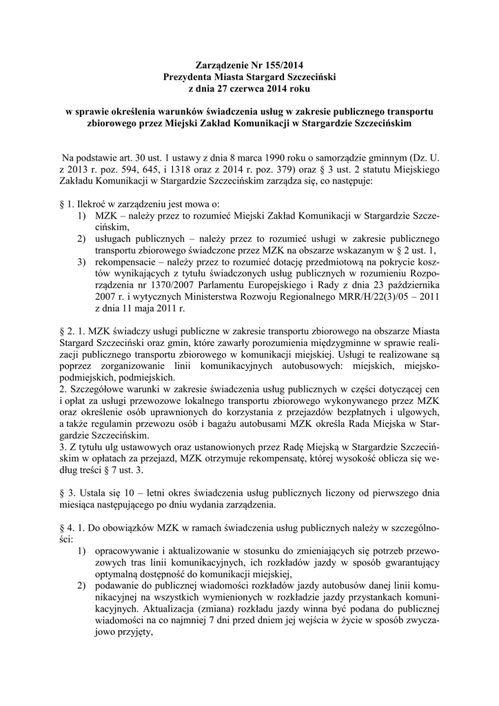 Zarządzenie Nr 155/2014 Prezydenta Miasta Stargard Szczeciński z dnia 27 czerwca 2014 roku w sprawie określenia warunków świadczenia usług w zakresie publicznego transportu zbiorowego przez Miejski Zakład Komunikacji w Stargardzie Szczecińskim Na podstawie art. 30 ust. 1 ustawy z dnia 8 marca 1990 roku o samorządzie gminnym (Dz. U. z 2013 r. poz. 594, 645, i 1318 oraz z 2014 r. poz. 379) oraz § 3 ust. 2 statutu Miejskiego Zakładu Komunikacji w Stargardzie Szczecińskim zarządza się, co następuje: § 1. Ilekroć w zarządzeniu jest mowa o: 1) MZK – należy przez to rozumieć Miejski Zakład Komunikacji w Stargardzie Szczecińskim, 2) usługach publicznych – należy przez to rozumieć usługi w zakresie publicznego transportu zbiorowego świadczone przez MZK na obszarze wskazanym w § 2 ust. 1, 3) rekompensacie – należy przez to rozumieć dotację przedmiotową na pokrycie kosztów wynikających z tytułu świadczonych usług publicznych w rozumieniu Rozporządzenia nr 1370/2007 Parlamentu Europejskiego i Rady z dnia 23 października 2007 r. i wytycznych Ministerstwa Rozwoju Regionalnego MRR/H/22(3)/05 – 2011 z dnia 11 maja 2011 r. § 2. 1. MZK świadczy usługi publiczne w zakresie transportu zbiorowego na obszarze Miasta Stargard Szczeciński oraz gmin, które zawarły porozumienia międzygminne w sprawie realizacji publicznego transportu zbiorowego w komunikacji miejskiej. Usługi te realizowane są poprzez zorganizowanie linii komunikacyjnych autobusowych: miejskich, miejskopodmiejskich, podmiejskich. 2. Szczegółowe warunki w zakresie świadczenia usług publicznych w części dotyczącej cen i opłat za usługi przewozowe lokalnego transportu zbiorowego wykonywanego przez MZK oraz określenie osób uprawnionych do korzystania z przejazdów bezpłatnych i ulgowych, a także regulamin przewozu osób i bagażu autobusami MZK określa Rada Miejska w Stargardzie Szczecińskim. 3. Z tytułu ulg ustawowych oraz ustanowionych przez Radę Miejską w Stargardzie Szczecińskim w opłatach za przejazd, MZK otrzymuje rekompensatę, której wysokość oblicza się według treści § 7 ust. 3. § 3. Ustala się 10 – letni okres świadczenia usług publicznych liczony od pierwszego dnia miesiąca następującego po dniu wydania zarządzenia. § 4. 1. Do obowiązków MZK w ramach świadczenia usług publicznych należy w szczególności: 1) opracowywanie i aktualizowanie w stosunku do zmieniających się potrzeb przewozowych tras linii komunikacyjnych, ich rozkładów jazdy w sposób gwarantujący optymalną dostępność do komunikacji miejskiej, 2) podawanie do publicznej wiadomości rozkładów jazdy autobusów danej linii komunikacyjnej na wszystkich wymienionych w rozkładzie jazdy przystankach komunikacyjnych. Aktualizacja (zmiana) rozkładu jazdy winna być podana do publicznej wiadomości na co najmniej 7 dni przed dniem jej wejścia w życie w sposób zwyczajowo przyjęty, 3) kontrola biletów oraz windykacja należności za przejazd bez ważnego biletu, którą MZK może realizować samodzielnie albo przez inne podmioty zewnętrzne na własny koszt i ryzyko, 4) emisja i dystrybucja biletów komunikacji miejskiej. Emisję biletów MZK realizuje samodzielnie natomiast opracowanie ich szaty graficznej MZK realizuje samodzielnie albo przez inne podmioty zewnętrzne na własny koszt i ryzyko. Nominały biletów muszą być zgodne z aktualnie obowiązującą uchwałą Rady Miejskiej w Stargardzie Szczecińskim. Dystrybucję biletów MZK realizuje samodzielnie. MZK ma prawo do zawierania umów na dystrybucję biletów z innymi podmiotami na własny koszt i ryzyko, 5) okresowe przeprowadzanie badań popytu i podaży na usługi przewozowe oraz promowanie komunikacji miejskiej. 2. Wpływy z opłat za usługi świadczone w zakresie publicznego transportu zbiorowego przysługują MZK. § 5. Minimalne normy jakości usług świadczonych w zakresie publicznego transportu zbiorowego dla MZK: 1) udział w pracy przewozowej autobusów niskopodłogowych lub niskowejściowych – nie mniej niż 80 %, 2) sukcesywna wymiana taboru autobusowego na niskopodłogowy. Przy zakupie taboru używanego wymaga się spełnienia parametrów normy co najmniej EURO 4, 3) wskaźnik komfortu podróżowania określa się jako maksymalne, dopuszczalne napełnienie pojazdów wynoszące 75% pojemności określonej przez producenta pojazdu, 4) punktualność odjazdów z przystanków – przyśpieszenie nie większe niż 1 minuta oraz opóźnienie nie większe niż 3 minuty (z uwzględnieniem odstępstw w przypadku zjawiska kongestii transportowej), 5) częstotliwość kursowania autobusów w poszczególnych kierunkach powinna być adekwatna do wyników z analiz badań potokowości przewozów z uwzględnieniem pory doby i dni tygodnia (od poniedziałku do piątku, w soboty, niedziele i święta), 6) informacja pasażerska – co najmniej w formie strony internetowej i broszurowego rozkładu jazdy, 7) informacja pasażerska w pojazdach powinna zawierać: a) oznaczenie numeru linii komunikacyjnej i kierunku jazdy na wyświetlaczach zewnętrznych z przodu i z prawej strony pojazdu, b) oznaczenie numeru linii komunikacyjnej na wyświetlaczu zewnętrznym z tyłu pojazdu, c) informacje na temat taryfy biletowej, uprawnień do ulgowych przejazdów, regulaminu przewozów i zasad porządkowych, d) schemat tras wszystkich linii komunikacyjnych, e) system zapowiedzi fonicznych i wizualnych nazw przystanków na wewnętrznych tablicach elektronicznych prezentujących informacje o przystankach, kierunku jazdy etc. (w każdym fabrycznie nowym pojeździe wprowadzanym do eksploatacji), 8) przyjmowanie oraz rozpatrywanie skarg i reklamacji składanych przez pasażerów a także przyznawanie ewentualnych odszkodowań wynikających z realizacji usług należy rozpatrywać na bieżąco, jednak w terminie nie dłuższym jak do 30 dni od dnia ich złożenia, 9) nie dopuszcza się podwykonawstwa w realizacji usług świadczonych w