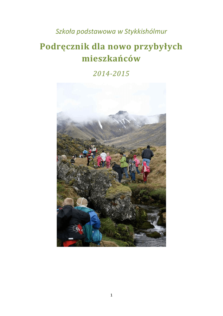 Szkoła podstawowa w Stykkishólmur Podręcznik dla nowo przybyłych mieszkańców 2014-2015 1 Spis treści Szkoła podstawowa w Stykkishólmur ..................................................................................................... 4 Adres, numery telefoniczne i email ..................................................................................................... 4 Biuro szkoły ......................................................................................................................................... 4 Informacje ogólne o działalności szkoły podstawowej w Stykkishólmur ............................................... 4 Edukacja na zewnątrz .......................................................................................................................... 4 Rozkład zajęć ....................................................................................................................................... 5 Zajęcia sportowe i pływanie ................................................................................................................ 5 Nauka tańca ......................................................................................................................................... 5 Oceny................................................................................................................................................... 5 Zasady dotyczące nieobecności dla uczniów 5 – 10 klas .................................................................... 5 Regulamin szkolny ............................................................................................................................... 6 Zezwolenia na nieobecność w szkole .................................................................................................. 6 Zajęcia społeczne uczniów .................................................................................................................. 6 Wycieczka do Búðardalur ............................................................................................................... 7 Wycieczka kulturowa....................................................................................................................... 7 Wyjazd na narty ............................................................................................................................... 7 Baraki szkolne .................................................................................................................................. 7 Wycieczka do Danii .......................................................................................................................... 7 Święta Bożego narodzenia .............................................................................................................. 7 Zdjęcia.............................................................................................................................................. 7 Współpraca między szkołą a rodzicami/ opiekunami uczniów ...................................................... 8 Stowarzyszenie rodziców ................................................................................................................ 8 Ośrodek usług społeczno-edukacyjnych (FSSF) ....................................................................................... 8 Porady psychologiczne ........................................................................................................................ 8 2 Logopeda ............................................................................................................................................. 8 Zespół ds. przeciwdziałania problemom mobbingu ............................................................................ 8 Zagadnienia zdrowotne ....................................................................................................................... 8 Mobbing .............................................................................................................................................. 9 Przerwy .................................................................................................................................................... 9 Godziny poranne w szkole....................................................................................................................... 9 Złe warunki pogodowe ............................................................................................................................ 9 Plan ewakuacyjny .................................................................................................................................... 9 Szkolenie przeciwpożarowe .................................................................................................................... 9 Jadalnia .................................................................................................................................................... 9 Prowiant do szkoły ................................................................................................................................ 10 Zajęcia całodzienne ............................................................................................................................... 10 Mentor................................................................................................................................................... 10 3 Szkoła podstawowa w Stykkishólmur Adres, numery telefoniczne i email Szkoła podstawowa w Stykkishólmur Borgarbraut 6, 340 Stykkishólmur tel: 433 8177 Gunnar Svanlaugsson, dyrektor szkoły. Tel. 433 8178, email: [email protected] Berglind Axelsdóttir, zastępca dyrektora szkoły. Tel. 433 8179, email: [email protected] Sesselja Kristinsdóttir, kierownik ds. kształcenia specjalnego. Tel. 433 8187, email: [email protected] Sala sportowa: 433 8150 Zajęcia całodzienne: 433 8185 Strona internetowa 