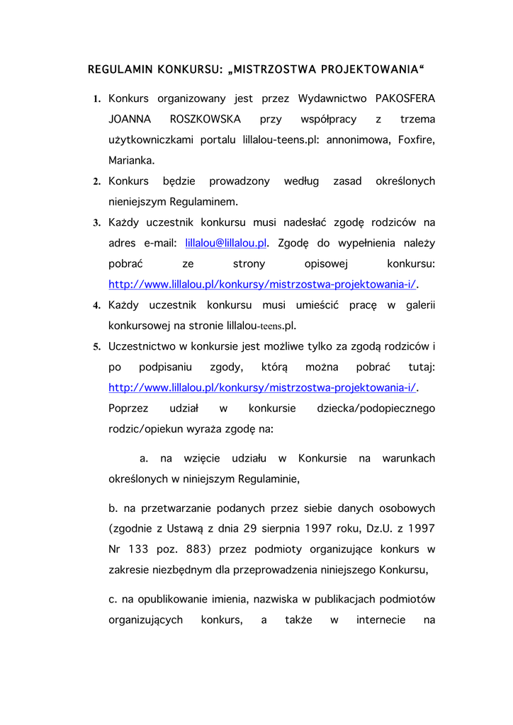 REGULAMIN KONKURSU: „MISTRZOSTWA PROJEKTOWANIA“ 1. Konkurs organizowany jest przez Wydawnictwo PAKOSFERA JOANNA ROSZKOWSKA przy współpracy z trzema użytkowniczkami portalu lillalou-teens.pl: annonimowa, Foxfire, Marianka. 2. Konkurs będzie prowadzony według zasad określonych nieniejszym Regulaminem. 3. Każdy uczestnik konkursu musi nadesłać zgodę rodziców na adres e-mail: [email protected]. Zgodę do wypełnienia należy pobrać ze strony opisowej konkursu: http://www.lillalou.pl/konkursy/mistrzostwa-projektowania-i/. 4. Każdy uczestnik konkursu musi umieścić pracę w galerii konkursowej na stronie lillalou-teens.pl. 5. Uczestnictwo w konkursie jest możliwe tylko za zgodą rodziców i po podpisaniu zgody, którą można pobrać tutaj: http://www.lillalou.pl/konkursy/mistrzostwa-projektowania-i/. Poprzez udział w konkursie dziecka/podopiecznego rodzic/opiekun wyraża zgodę na: a. na wzięcie udziału w Konkursie na warunkach określonych w niniejszym Regulaminie, b. na przetwarzanie podanych przez siebie danych osobowych (zgodnie z Ustawą z dnia 29 sierpnia 1997 roku, Dz.U. z 1997 Nr 133 poz. 883) przez podmioty organizujące konkurs w zakresie niezbędnym dla przeprowadzenia niniejszego Konkursu, c. na opublikowanie imienia, nazwiska w publikacjach podmiotów organizujących konkurs, a także w internecie na stronach www.lillalou.pl, oraz na stronach firmowych w portalu Facebook w przypadku, gdy jego praca wygra nagrodę. d. na bezpłatne wykorzystywanie przez podmioty organizujące konkurs nadesłanej pracy, według ich uznania, podczas ewentualnej reklamy, działań marketingowych lub promocyjnych związanych wyłącznie z niniejszym konkursem. e. na zamieszczenie pracy na stronach internetowych Lilla Lou, oraz blogach internetowych organizatorek konkursu. f. udzielenie Joannie Roszkowskiej prowadzącej działalność gospodarczą pod nazwą Roszkowska Joanna “Pakosfera” z siedzibą w Łomiankach (05-092) przy ul. Gościńcowej 128 niewyłącznej i nieodpłatnej wprowadzenie do licencji na obrotu zwielokrotnienie pracy i plastycznej dziecka/podopiecznego w formie papierowych szkicowników i zeszytów kreatywnych sygnowanych marką Lilla Lou. g. upoważnienie do udzielania sublicencji innym wydawcom szkicowników i zeszytów kreatywnych. Nadto, wyrażam zgodę na sporządzenie opracowania prac mojego dziecka/podopiecznego, a także nieodpłatne rozporządzanie i korzystanie z opracowania w papierowych szkicownikach i zeszytach kreatywnych sygnowanych marką Lilla Lou. 6. Przedmiotem konkursu są rysunki wykonane w dowolnej technice, będące oryginałami. Każda praca musi posiadać tło. Warunkiem uczestnictwa w konkursie jest wykonanie racy plastycznej polegającej na narysowaniu na dowolnym obrysie pracy plastycznej. Praca powinna być zeskanowana lub sfotografowana w stopniu umożliwiającym swobodne obejrzenie rysunku. 7. Konkurs trwa od 23.02.2015 do dnia 31.05.2015 północy czasu polskiego. 8. Prawa autorskie uczestników majątkowe konkursu do treści powinny nadesłanych należeć do przez uczestników konkursu. Uczestnicy konkursu ponoszą pełną odpowiedzialność wobec Organizatora w przypadku zgłoszenia przez osoby trzecie roszczeń z tytułu naruszenia ich praw wskutek wykorzystania przez Organizatora tekstów zgodnie z niniejszym Regulaminem. 9. Prawo Organizatora do dyskwalifikacji nie wygasa po rozwiązaniu konkursu. 10. Laureaci wyłonieni zostaną na podstawie głosowania wybranego jury, w którego skład wchodzą 3 projektantki ze stron ilillalouteens.pl (Marianka, FoxFire, annonimowa) oraz reprezentantka marki Lilla Lou (Joanna Roszkowska). 11. Regulamin jest dostępny na stronach: www.lillalou-teens.pl, lillalou.pl. 12. Wyniki zostaną ogłoszone 1.06.2015 facebook.com/lillalou.kreatywnie, na forum.lillalou.pl, lillalou.blogspot.com. lillalou- teens.pl, lillalou.pl 13. Nagrody zostaną wysłane do zwycięzców (do 12.06.2015 r.) przez fundatora zwycięzców. po otrzymaniu danych adresowych od