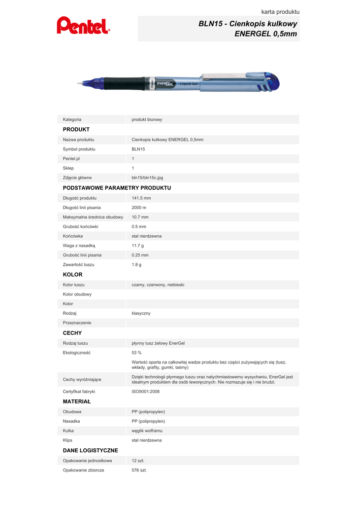 karta produktu BLN15 - Cienkopis kulkowy ENERGEL 0,5mm Kategoria produkt biurowy PRODUKT Nazwa produktu Cienkopis kulkowy ENERGEL 0,5mm Symbol produktu BLN15 Pentel.pl 1 Sklep 1 Zdjęcie główne bln15/bln15c.jpg PODSTAWOWE PARAMETRY PRODUKTU Długość produktu 141.5 mm Długość linii pisania 2000 m Maksymalna średnica obudowy 10.7 mm Grubość końcówki 0.5 mm Końcówka stal nierdzewna Waga z nasadką 11.7 g Grubość linii pisania 0.25 mm Zawartość tuszu 1.8 g KOLOR Kolor tuszu czarny, czerwony, niebieski Kolor obudowy Kolor Rodzaj klasyczny Przeznaczenie CECHY Rodzaj tuszu płynny tusz żelowy EnerGel Ekologiczność 53 % Wartość oparta na całkowitej wadze produktu bez części zużywających się (tusz, wkłady, grafity, gumki, taśmy) Cechy wyróżniające Dzięki technologii płynnego tuszu oraz natychmiastowemu wysychaniu, EnerGel jest idealnym produktem dla osób leworęcznych. Nie rozmazuje się i nie brudzi. Certyfikat fabryki ISO9001:2008 MATERIAŁ Obudowa PP (polipropylen) Nasadka PP (polipropylen) Kulka węglik wolframu Klips stal nierdzewna DANE LOGISTYCZNE Opakowanie jednostkowe 12 szt. Opakowanie zbiorcze 576 szt. Kod kreskowy data wygenerowania karty: 08.03.2017 BLN15-A 4902506064837 czarny BLN15-B 4902506064844 czerwony BLN15-C 4902506064851 niebieski