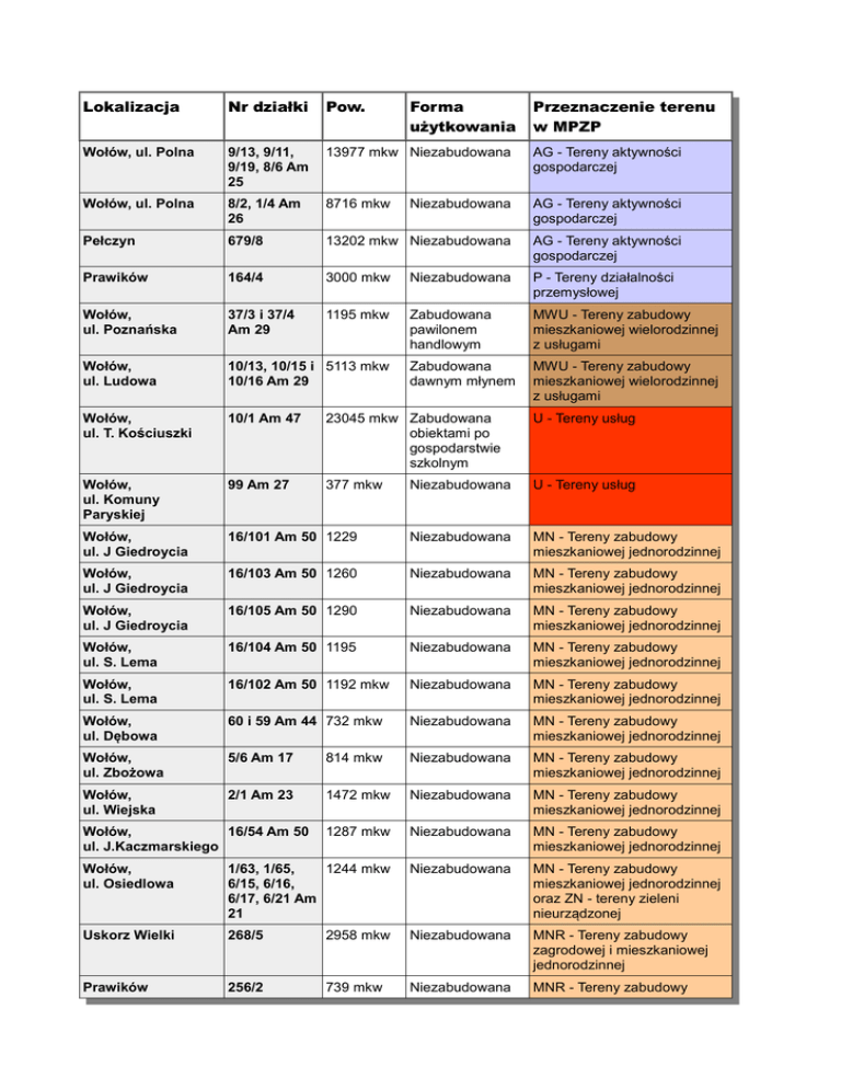 Lokalizacja Nr działki Pow. Wołów, ul. Polna 9/13, 9/11, 9/19, 8/6 Am 25 13977 mkw Niezabudowana AG - Tereny aktywności gospodarczej Wołów, ul. Polna 8/2, 1/4 Am 26 8716 mkw Niezabudowana AG - Tereny aktywności gospodarczej Pełczyn 679/8 13202 mkw Niezabudowana AG - Tereny aktywności gospodarczej Prawików 164/4 3000 mkw Niezabudowana P - Tereny działalności przemysłowej Wołów, ul. Poznańska 37/3 i 37/4 Am 29 1195 mkw Zabudowana pawilonem handlowym MWU - Tereny zabudowy mieszkaniowej wielorodzinnej z usługami Wołów, ul. Ludowa 10/13, 10/15 i 5113 mkw 10/16 Am 29 Zabudowana dawnym młynem MWU - Tereny zabudowy mieszkaniowej wielorodzinnej z usługami Wołów, ul. T. Kościuszki 10/1 Am 47 23045 mkw Zabudowana obiektami po gospodarstwie szkolnym U - Tereny usług Wołów, ul. Komuny Paryskiej 99 Am 27 377 mkw Niezabudowana U - Tereny usług Wołów, ul. J Giedroycia 16/101 Am 50 1229 Niezabudowana MN - Tereny zabudowy mieszkaniowej jednorodzinnej Wołów, ul. J Giedroycia 16/103 Am 50 1260 Niezabudowana MN - Tereny zabudowy mieszkaniowej jednorodzinnej Wołów, ul. J Giedroycia 16/105 Am 50 1290 Niezabudowana MN - Tereny zabudowy mieszkaniowej jednorodzinnej Wołów, ul. S. Lema 16/104 Am 50 1195 Niezabudowana MN - Tereny zabudowy mieszkaniowej jednorodzinnej Wołów, ul. S. Lema 16/102 Am 50 1192 mkw Niezabudowana MN - Tereny zabudowy mieszkaniowej jednorodzinnej Wołów, ul. Dębowa 60 i 59 Am 44 732 mkw Niezabudowana MN - Tereny zabudowy mieszkaniowej jednorodzinnej Wołów, ul. Zbożowa 5/6 Am 17 814 mkw Niezabudowana MN - Tereny zabudowy mieszkaniowej jednorodzinnej Wołów, ul. Wiejska 2/1 Am 23 1472 mkw Niezabudowana MN - Tereny zabudowy mieszkaniowej jednorodzinnej 1287 mkw Niezabudowana MN - Tereny zabudowy mieszkaniowej jednorodzinnej Wołów, ul. Osiedlowa 1/63, 1/65, 1244 mkw 6/15, 6/16, 6/17, 6/21 Am 21 Niezabudowana MN - Tereny zabudowy mieszkaniowej jednorodzinnej oraz ZN - tereny zieleni nieurządzonej Uskorz Wielki 268/5 2958 mkw Niezabudowana MNR - Tereny zabudowy zagrodowej i mieszkaniowej jednorodzinnej Prawików 256/2 739 mkw Niezabudowana MNR - Tereny zabudowy Wołów, 16/54 Am 50 ul. J.Kaczmarskiego Forma użytkowania Przeznaczenie terenu w MPZP zagrodowej i mieszkaniowej jednorodzinnej Prawików 160/11 1024 mkw Niezabudowana MNR - Tereny zabudowy zagrodowej i mieszkaniowej jednorodzinnej Krzydlina Mała 179 1578 mkw Niezabudowana MNR - Tereny zabudowy zagrodowej i mieszkaniowej jednorodzinnej Pełczyn 149/3 1560 mkw Niezabudowana MNR - Tereny zabudowy zagrodowej i mieszkaniowej jednorodzinnej Pełczyn 241/6 598 mkw Niezabudowana MNR - Tereny zabudowy zagrodowej i mieszkaniowej jednorodzinnej Siodłkowice 127/4 798 mkw Niezabudowana MNR - Tereny zabudowy zagrodowej i mieszkaniowej jednorodzinnej Gródek 62/6 1633 mkw Niezabudowana MNR - Tereny zabudowy zagrodowej i mieszkaniowej jednorodzinnej Pierusza 40/4 1300 mkw Niezabudowana MNR - Tereny zabudowy zagrodowej i mieszkaniowej jednorodzinnej Pierusza 40/5 1726 mkw Niezabudowana MNR - Tereny zabudowy zagrodowej i mieszkaniowej jednorodzinnej oraz Rz tereny rolnicze z dopuszczeniem zabudowy zagrodowej Rataje 179 4500 mkw Niezabudowana MNR - Tereny zabudowy zagrodowej i mieszkaniowej jednorodzinnej oraz WS tereny wód Stary Wołów 228/11 1275 mkw Niezabudowana MNR - Tereny zabudowy zagrodowej i mieszkaniowej jednorodzinnej Warzęgowo 95/1 1200 mkw Niezabudowana MNR - Tereny zabudowy zagrodowej i mieszkaniowej jednorodzinnej Wróblewo 27/7 819 mkw Niezabudowana MNR - Tereny zabudowy zagrodowej i mieszkaniowej jednorodzinnej Uskorz Wielki 217/1 3988 mkw Niezabudowana Rz- tereny rolnicze z dopuszczeniem zabudowy zagrodowej Nieszkowice 145/2 3595 mkw Niezabudowana RM- tereny zabudowy zagrodoweji i Rł- tereny rolnicze Wołów, ul. Wiejska 13/2 Am 9 3691 mkw Niezabudowana Tereny rolnicze – uprawy polowe Mojęcice 430 11000 mkw Niezabudowana Tereny rolnicze – uprawy polowe Gliniany 657/1 6100 mkw Tereny rolnicze – uprawy polo Niezabudowana