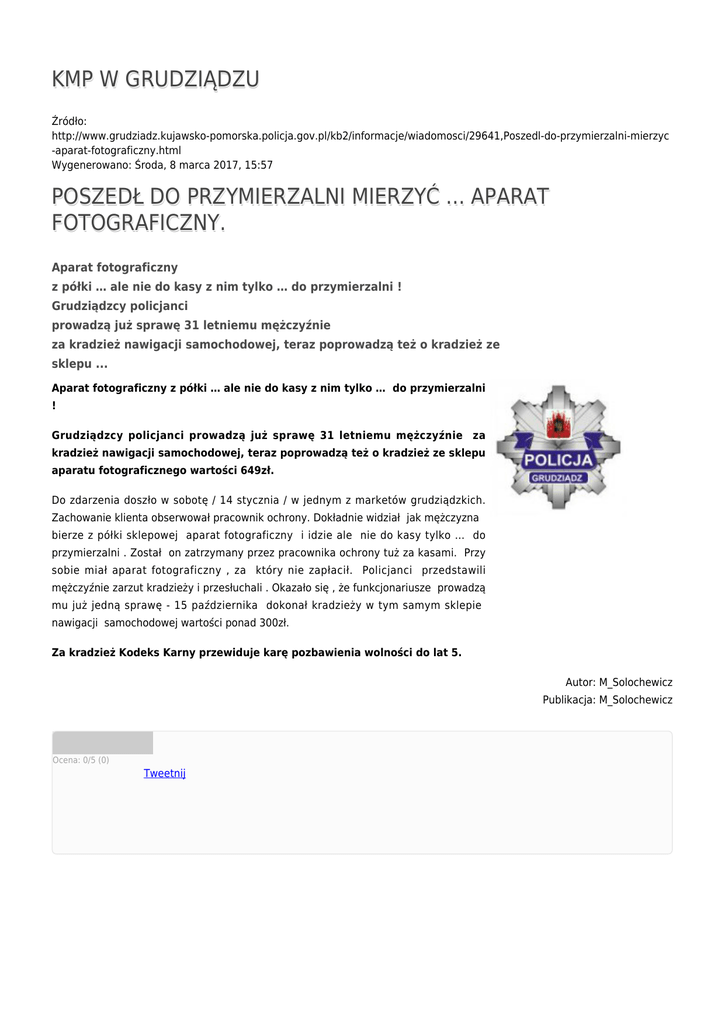 KMP W GRUDZIĄDZU Źródło: http://www.grudziadz.kujawsko-pomorska.policja.gov.pl/kb2/informacje/wiadomosci/29641,Poszedl-do-przymierzalni-mierzyc -aparat-fotograficzny.html Wygenerowano: Środa, 8 marca 2017, 15:57 POSZEDŁ DO PRZYMIERZALNI MIERZYĆ ... APARAT FOTOGRAFICZNY. Aparat fotograficzny z półki … ale nie do kasy z nim tylko … do przymierzalni ! Grudziądzcy policjanci prowadzą już sprawę 31 letniemu mężczyźnie za kradzież nawigacji samochodowej, teraz poprowadzą też o kradzież ze sklepu ... Aparat fotograficzny z półki … ale nie do kasy z nim tylko … do przymierzalni ! Grudziądzcy policjanci prowadzą już sprawę 31 letniemu mężczyźnie za kradzież nawigacji samochodowej, teraz poprowadzą też o kradzież ze sklepu aparatu fotograficznego wartości 649zł. Do zdarzenia doszło w sobotę / 14 stycznia / w jednym z marketów grudziądzkich. Zachowanie klienta obserwował pracownik ochrony. Dokładnie widział jak mężczyzna bierze z półki sklepowej aparat fotograficzny i idzie ale nie do kasy tylko … do przymierzalni . Został on zatrzymany przez pracownika ochrony tuż za kasami. Przy sobie miał aparat fotograficzny , za który nie zapłacił. Policjanci przedstawili mężczyźnie zarzut kradzieży i przesłuchali . Okazało się , że funkcjonariusze prowadzą mu już jedną sprawę - 15 października dokonał kradzieży w tym samym sklepie nawigacji samochodowej wartości ponad 300zł. Za kradzież Kodeks Karny przewiduje karę pozbawienia wolności do lat 5. Autor: M_Solochewicz Publikacja: M_Solochewicz Ocena: 0/5 (0) Tweetnij