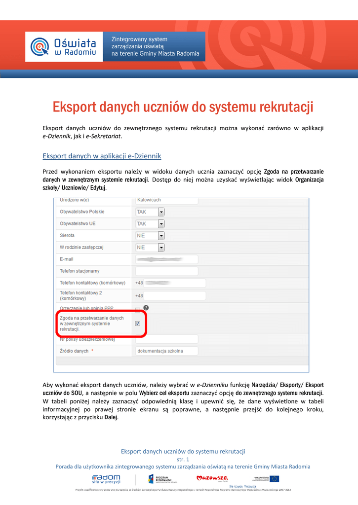Eksport danych uczniów do systemu rekrutacji Eksport danych uczniów do zewnętrznego systemu rekrutacji można wykonać zarówno w aplikacji e-Dziennik, jak i e-Sekretariat. Eksport danych w aplikacji e-Dziennik Przed wykonaniem eksportu należy w widoku danych ucznia zaznaczyć opcję Zgoda na przetwarzanie danych w zewnętrznym systemie rekrutacji. Dostęp do niej można uzyskać wyświetlając widok Organizacja szkoły/ Uczniowie/ Edytuj. Aby wykonać eksport danych uczniów, należy wybrać w e-Dzienniku funkcję Narzędzia/ Eksporty/ Eksport uczniów do SOU, a następnie w polu Wybierz cel eksportu zaznaczyć opcję do zewnętrznego systemu rekrutacji. W tabeli poniżej należy zaznaczyć odpowiednią klasę i upewnić się, że dane wyświetlone w tabeli informacyjnej po prawej stronie ekranu są poprawne, a następnie przejść do kolejnego kroku, korzystając z przycisku Dalej. Eksport danych uczniów do systemu rekrutacji str. 1 Porada dla użytkownika zintegrowanego systemu zarządzania oświatą na terenie Gminy Miasta Radomia Nowo wyświetlony widok zawiera listę wszystkich uczniów wybranej klasy. W kolumnie Ostrzeżenia wyświetlone zostaną informacje o nieuzupełnionych polach dla każdej osoby. Uczniowie, dla których nie zaznaczono opcji Zgoda na przetwarzanie danych w zewnętrznym systemie rekrutacji, nie są wyświetlani na liście i nie można ich wyeksportować. Po upewnieniu się, że wszystkie dane są poprawnie wprowadzone do systemu, należy zatwierdzić eksport i zakończyć proces, korzystając z przycisku Zapisz. Eksport danych w aplikacji e-Sekretariat Dane uczniów można również wyeksportować korzystając z aplikacji e-Sekretariat. Przed wykonaniem eksportu należy zaznaczyć opcję Zgoda na przetwarzanie danych w zewnętrznym systemie rekrutacji w widoku danych ucznia. Dostęp do niego można uzyskać po wyświetleniu Księgi ucznia, a następnie przechodząc do edycji danych wybranej osoby (przycisk Edytuj w górnym menu lub dwukrotne kliknięcie na wybranego ucznia). Eksport danych uczniów do systemu rekrutacji str. 2 Porada dla użytkownika zintegrowanego systemu zarządzania oświatą na terenie Gminy Miasta Radomia Aby wykonać eksport, należy wybrać z górnego menu pozycję Dane/ Eksporty/ Eksportuj dane uczniów do zewnętrznego systemu rekrutacji. W nowo otwartym oknie należy zaznaczyć jedną z klas oraz uzupełnić wszystkie informacje po prawej stronie okna i zatwierdzić przyciskiem Dalej. Eksport danych uczniów do systemu rekrutacji str. 3 Porada dla użytkownika zintegrowanego systemu zarządzania oświatą na terenie Gminy Miasta Radomia Po przejściu do kolejnego widoku aplikacja wyświetli listę uczniów wraz z brakującymi danymi dla każdej osoby. Uczniowie, dla których nie zaznaczono opcji Zgoda na przetwarzanie danych w zewnętrznym systemie rekrutacji, będą nadal wyświetlani na liście, ale nie będzie można wyeksportować ich danych. W kolumnie Ostrzeżenia wyświetlone zostaną informacje o nieuzupełnionych polach dla każdej osoby. Po upewnieniu się, że wszystkie dane są poprawnie wprowadzone do systemu, należy zaznaczyć wybrane osoby, a następnie skorzystać z przycisku Zapisz, aby przesłać dane do systemu rekrutacji. Eksport danych uczniów do systemu rekrutacji str. 4 Porada dla użytkownika zintegrowanego systemu zarządzania oświatą na terenie Gminy Miasta Radomia