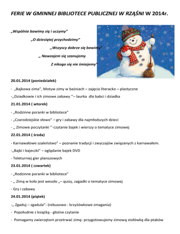 FERIE W GMINNEJ BIBLIOTECE PUBLICZNEJ W RZĄŚNI W 2014r. „Wspólnie bawimy się i uczymy” „O dziesiątej przychodzimy” ,,Wszyscy dobrze się bawimy” ,, Nawzajem się szanujemy Z nikogo się nie śmiejemy” 20.01.2014 (poniedziałek) - „Bajkowa zima”, Motyw zimy w baśniach – zajęcia literacko – plastyczne -,,Dziadkowie i ich zimowe zabawy ‘’– laurka dla babci i dziadka 21.01.2014 ( wtorek) - „Rodzinne poranki w bibliotece” - „Czarodziejskie słowo” – gry i zabawy dla najmłodszych dzieci - ,, Zimowe poczytanki ‘’-czytanie bajek i wierszy o tematyce zimowej 22.01.2014 ( środa) - Karnawałowe szaleństwo” – poznanie tradycji i zwyczajów związanych z karnawałem. -„Bajki i bajeczki” – oglądanie bajek DVD - Teleturniej gier planszowych 23.01.2014 ( czwartek) - „Rodzinne poranki w bibliotece” - ,, Zimą w koło jest wesoło „– quizy, zagadki o tematyce zimowej - Gry i zabawy 24.01.2014 (piątek) -,, Zgaduj – zgadula”- (rebusowo - krzyżówkowe zmagania) - Popołudnie z książką - głośne czytanie - Pomagamy zwierzętom przetrwać zimę- przygotowujemy zimową stołówkę dla ptaków 27.01.2014 (poniedziałek) - ,, Hej ho, na sanki by się szło” -„Kartka dla przyjaciela” - kartka z życzeniami - gry i zabawy 28.01.2014 (wtorek) - „Hu hu ha nasza zima zła” - pejzaże zimowe - Gry i zabawy edukacyjne - "Wierszomania"-głośne czytanie poezji 29.01.2014 ( środa) - .,, Obyczaje towarzyskie na wesoło „– zajęcia literacko – plastyczne na podstawie książki „Bon czy ton – czyli savoir-vivre dla dzieci” G. Kasdepke -.,, Przysłowie prawdę ci powie” – konkurs ze znajomości powiedzeń i przysłów -„Bohaterowie książek na ekranie” - projekcje filmowe 30.01.2014 (czwartek) -,, Hej ho, na sanki by się szło” - Zabawy na powietrzu, ognisko. -„Zima na wesoło” 31.01.2014 (piątek) - „Bujać w obłokach” – turniej gier -,, Odrobina ruchu na śniegowym puchu”- zajęcia na powietrzu - Przegląd prasy - spotkanie przy herbatce Zapraszamy od poniedziałku do piątku w godzinach od 10.00 do 16.00!