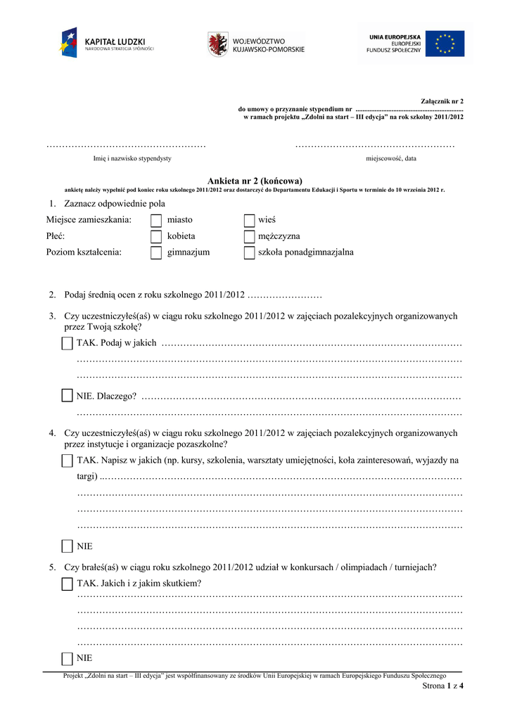 Załącznik nr 2 do umowy o przyznanie stypendium nr ............................................................... w ramach projektu „Zdolni na start – III edycja” na rok szkolny 2011/2012 …………………………………………… …………………………………………… Imię i nazwisko stypendysty miejscowość, data Ankieta nr 2 (końcowa) ankietę należy wypełnić pod koniec roku szkolnego 2011/2012 oraz dostarczyć do Departamentu Edukacji i Sportu w terminie do 10 września 2012 r. 1. Zaznacz odpowiednie pola Miejsce zamieszkania: miasto wieś Płeć: kobieta mężczyzna Poziom kształcenia: gimnazjum szkoła ponadgimnazjalna 2. Podaj średnią ocen z roku szkolnego 2011/2012 …………………… 3. Czy uczestniczyłeś(aś) w ciągu roku szkolnego 2011/2012 w zajęciach pozalekcyjnych organizowanych przez Twoją szkołę? TAK. Podaj w jakich …………………………………………………………………………………… …………………………………………………………………………………………………………… …………………………………………………………………………………………………………… NIE. Dlaczego? ………………………………………………………………………………………… …………………………………………………………………………………………………………… 4. Czy uczestniczyłeś(aś) w ciągu roku szkolnego 2011/2012 w zajęciach pozalekcyjnych organizowanych przez instytucje i organizacje pozaszkolne? TAK. Napisz w jakich (np. kursy, szkolenia, warsztaty umiejętności, koła zainteresowań, wyjazdy na targi) ..…………………………………………………………………………………………………… …………………………………………………………………………………………………………… …………………………………………………………………………………………………………… …………………………………………………………………………………………………………… NIE 5. Czy brałeś(aś) w ciągu roku szkolnego 2011/2012 udział w konkursach / olimpiadach / turniejach? TAK. Jakich i z jakim skutkiem? …………………………………………………………………………………………………………… …………………………………………………………………………………………………………… …………………………………………………………………………………………………………… …………………………………………………………………………………………………………… NIE Projekt „Zdolni na start – III edycja” jest współfinansowany ze środków Unii Europejskiej w ramach Europejskiego Funduszu Społecznego Strona 1 z 4 6. W skali od 1 do 10 (1-brak zainteresowania, 10-największe zainteresowanie) oceń swoje obecne zainteresowanie niżej wymienionymi przedmiotami: Przedmioty Punkty Matematyka Fizyka Astronomia Chemia Przyroda/Biologia Geografia Informatyka Technika przedmioty techniczno-zawodowe ujęte w programie nauczania (wymień) …………………………………………………………………… …………………………………… …………………………………………………………………… …………………………………… …………………………………………………………………… …………………………………… …………………………………………………………………… …………………………………… …………………………………………………………………… …………………………………… …………………………………………………………………… …………………………………… 7. Z jakich pomocy naukowych i środków technicznych nauczania korzystasz? Jeśli korzystasz, napisz gdzie: komputer, gdzie: ………………………………………………………………………………………… specjalistyczne oprogramowanie komputerowe, gdzie: ………………………………………………... Internet, gdzie: ………………………………………………………………………………………….. encyklopedie, słowniki, atlasy , gdzie: …………………………………………………………………. literatura fachowa, gdzie: ………………………………………………………………………………. czasopisma, gdzie: ………………………………………………………………………………………. inne (wymień i podaj gdzie)……………………………………………………………………………... ………………………………………………….………………………………………………………... ………………………………………………….………………………………………………………... 8. Co dla Ciebie stanowi obecnie przeszkodę w Twoim rozwoju indywidualnym? (np. utrudniony dojazd na zajęcia pozaszkolne, bariera finansowa, trudna sytuacja rodzinna, zły stan zdrowia ucznia, inne) …………………………………………………………………………………………………………………… …………………………………………………………………………………………………………………… …………………………………………………………………………………………………………………… …………………………………………………………………………………………………………………