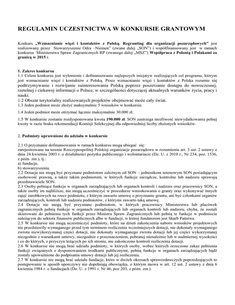REGULAMIN UCZESTNICTWA W KONKURSIE GRANTOWYM Konkurs „Wzmacnianie więzi i kontaktów z Polską. Regranting dla organizacji pozarządowych” jest realizowany przez Stowarzyszenie Odra –Niemen” (zwane dalej „SON”) i współfinansowany jest w ramach konkursu Ministerstwa Spraw Zagranicznych RP (zwanego dalej „MSZ”) Współpraca z Polonią i Polakami za granicą w 2015 r. 1. Zakres konkursu 1.1 Celem konkursu jest wyłonienie i dofinansowanie najlepszych inicjatyw realizujących cel programu, którym jest wzmacnianie więzi i kontaktów z Polską. Przez wzmacnianie więzi i kontaktów z Polska rozumie się podtrzymywanie i rozwijanie zainteresowania Polską poprzez poszerzanie dostępu do nowoczesnej, rzetelnej i ciekawej informacji o Polsce, w szczególności dotyczącej aktualnych warunków życia, pracy i nauki. 1.2 Obszar terytorialny realizowanych projektów obejmować może cały świat. 1.3 Jeden podmiot może złożyć maksymalnie 5 wniosków w konkursie. 1.4 Jeden podmiot może otrzymać łącznie maksymalnie 30.000 zł. 1.5 W konkursie zostanie rozdysponowana kwota 190.000 zł. SON zastrzega możliwość niewydatkowania pełnej kwoty w razie braku rekomendacji Komisji Selekcyjnej dla odpowiedniej liczby złożonych wniosków. 2. Podmioty uprawnione do udziału w konkursie 2.1 O przyznanie dofinansowania w ramach konkursu mogą ubiegać się: zarejestrowane na terenie Rzeczypospolitej Polskiej organizacje pozarządowe w rozumieniu art. 3 ust. 2 ustawy z dnia 24 kwietnia 2003 r. o działalności pożytku publicznego i wolontariacie (Dz. U. z 2010 r., Nr 234, poz. 1536, z późn. zm.), tj.: a) fundacje, b) stowarzyszenia. 2.2 Dotacje nie mogą być przyznane podmiotom zależnym od SON – jednostkom terenowym SON posiadającym osobowość prawną, a także takim podmiotom, w których funkcje zarządcze, kontrolne lub nadzoru sprawują przedstawiciele SON. 2.3 Osoby pełniące funkcje w organach zarządzających lub organach kontroli i nadzoru oraz pracownicy SON, a także osoby im najbliższe, nie mogą uczestniczyć w procedurze wnioskowania o granty oraz wykonywać innych zajęć zarobkowych na rzecz podmiotu, z którym zawarto umowę o przyznanie grantu, ani być członkami organów zarządzających, kontroli lub nadzoru podmiotów, z którymi zawarto taką umowę. 2.4 Dotacje nie mogą być przyznane podmiotom, w których pracownicy Ministerstwa lub placówek zagranicznych pełnią funkcje w organach zarządzających lub organach kontroli lub nadzoru, chyba, że zostali skierowani do pełnienia tych funkcji przez Ministra Spraw Zagranicznych lub pełnią te funkcje w podmiocie należącym do sektora finansów publicznych albo w fundacji, w której fundatorem jest Skarb Państwa. 2.5 W konkursie nie mogą uczestniczyć podmioty, które na dzień zakończenia naboru wniosków projektowych nie przedstawiły wymaganego przed tym terminem rozliczenia wcześniejszych dotacji, nie dokonały wymaganego zwrotu niewykorzystanej części dotacji, nie dokonały wymaganego zwrotu dotacji lub jej części wykorzystanej niezgodnie z warunkami umowy, niezgodnie z przeznaczeniem, pobranej nienależnie lub w nadmiernej wysokości i co do których, z przyczyn leżących po ich stronie, nie zakończono kontroli rozliczenia dotacji. 2.6 W konkursie nie mogą brać udziału podmioty, w których osoby, wobec których orzeczono zakaz pełnienia funkcji związanych z dysponowaniem środkami publicznymi, pełnią funkcje w organach zarządzających bądź zostały upoważnione do podpisania umowy dotacji lub jej rozliczenia. 2.7 W konkursie nie mogą brać udziału fundacje, które w dwóch okresach sprawozdawczych poprzedzających to postępowanie w sposób uporczywy nie dopełniają obowiązku, o którym mowa w art. 12 ust. 2 ustawy z dnia 6 kwietnia 1984 r. o fundacjach (Dz. U. z 1991 r. Nr 46, poz 203, z późn. zm.). 3. Komponent informacyjno-doradczy dla organizacji składających wnioski w konkursie. Organizacje posiadające niewielkie doświadczenie w realizacji działań z zakresu prowadzenia projektów, o których mowa w punktach 1.1 i 1.2 mogą uzyskać wsparcie zespołu projektu w przygotowaniu wniosku i następnie w realizacji projektu. W ramach komponentu oferowane będą następujące typy wsparcia: 3.1. Spotkanie informacyjno-konsultacyjne 3.2. Seminarium metodyczne (jedno ok. 4-godzinne spotkanie) 3.3. Seminarium tematyczne (jedno ok. 4-godzinne spotkanie) 3.4. Help-desk - wirtualne forum problemowe Szczegółowe informacje dot. oferty komponentu informacyjno-doradczego oraz zasad zgłaszania się do udziału dostępne są na stronie www.odraniemen.org/regranting-konkurs-projektow-polonijnych 4. Harmonogram konkursu 4.1 Termin składania wniosków upływa do dnia 30-04-2015r. 4.2 Ogłoszenie wyników konkursu nastąpi do dnia 14-06-2015r. 4.3 Terminy realizacji projektów: 4.3.1 rozpoczęcie nie prędzej niż od dnia 01-05-2015 r. 4.3.2 zakończenie do dnia 31-10-2015r. 4.4 Dostarczenie sprawozdania z realizacji projektu do biura SON do 15-11-2014 r. do godziny 16:00. 5. Grupy docelowe 5.1 Projekty powinny być skierowane do Polaków mieszkających poza granicami Polski - z jednego lub większej liczby krajów. 6. Sposób składania wniosków 6.1 Formularz wniosku należy wypełnić w języku polskim, a następnie wysłać na adres: Stowarzyszenie Odra-Niemen ul. Kościuszki 35F, 50-011 Wrocław z dopiskiem na kopercie: „Małe granty dla Polonii 2015 – Wzmacnianie więzi i kontaktów z Polską” 6.2 O przyjęciu wniosku w terminie decyduje data nadania (stempla pocztowego) – nie późniejsza niż 30 kwietnia 2015 r. 6.3 Do wniosku należy obowiązkowo dołączyć statut (lub akt równorzędny) oraz dokumenty potwierdzające status oferenta i umocowanie osób go reprezentujących (KRS). 7. Wymogi merytoryczne dotyczące wniosków 7.1 Działania niekwalifikowane to: 7.1.1 bezpośrednia promocja wnioskodawcy; 7.1.2 zbiórki rzeczowe i pieniężne; 7.1.3 granty nie mogą