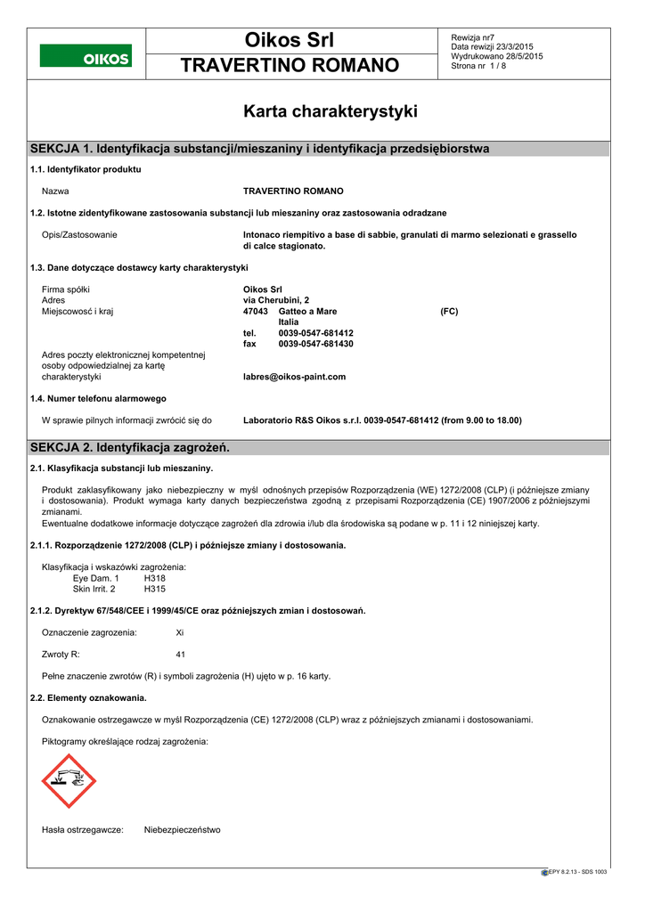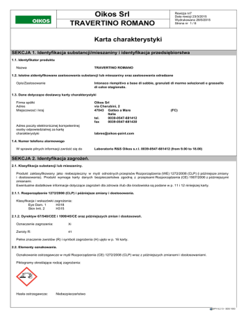 Oikos Srl Rewizja nr7 Data rewizji 23/3/2015 Wydrukowano 28/5/2015 Strona nr 1 / 8 TRAVERTINO ROMANO Karta charakterystyki SEKCJA 1. Identyfikacja substancji/mieszaniny i identyfikacja przedsiębiorstwa 1.1. Identyfikator produktu Nazwa TRAVERTINO ROMANO 1.2. Istotne zidentyfikowane zastosowania substancji lub mieszaniny oraz zastosowania odradzane Opis/Zastosowanie Intonaco riempitivo a base di sabbie, granulati di marmo selezionati e grassello di calce stagionato. 1.3. Dane dotyczące dostawcy karty charakterystyki Firma spółki Adres Miejscowosć i kraj Oikos Srl via Cherubini, 2 47043 Gatteo a Mare Italia tel. 0039-0547-681412 fax 0039-0547-681430 Adres poczty elektronicznej kompetentnej osoby odpowiedzialnej za kartę charakterystyki (FC) [email protected] 1.4. Numer telefonu alarmowego W sprawie pilnych informacji zwrócić się do Laboratorio R&S Oikos s.r.l. 0039-0547-681412 (from 9.00 to 18.00) SEKCJA 2. Identyfikacja zagrożeń. 2.1. Klasyfikacja substancji lub mieszaniny. Produkt zaklasyfikowany jako niebezpieczny w myśl odnośnych przepisów Rozporządzenia (WE) 1272/2008 (CLP) (i późniejsze zmiany i dostosowania). Produkt wymaga karty danych bezpieczeństwa zgodną z przepisami Rozporządzenia (CE) 1907/2006 z późniejszymi zmianami. Ewentualne dodatkowe informacje dotyczące zagrożeń dla zdrowia i/lub dla środowiska są podane w p. 11 i 12 niniejszej karty. 2.1.1. Rozporządzenie 1272/2008 (CLP) i późniejsze zmiany i dostosowania. Klasyfikacja i wskazówki zagrożenia: Eye Dam. 1 H318 Skin Irrit. 2 H315 2.1.2. Dyrektyw 67/548/CEE i 1999/45/CE oraz późniejszych zmian i dostosowań. Oznaczenie zagrozenia: Xi Zwroty R: 41 Pełne znaczenie zwrotów (R) i symboli zagrożenia (H) ujęto w p. 16 karty. 2.2. Elementy oznakowania. Oznakowanie ostrzegawcze w myśl Rozporządzenia (CE) 1272/2008 (CLP) wraz z późniejszych zmianami i dostosowaniami. Piktogramy określające rodzaj zagrożenia: Hasła ostrzegawcze: Niebezpieczeństwo EPY 8.2.13 - SDS 1003 Oikos Srl TRAVERTINO ROMANO SEKCJA 2. Identyfikacja zagrożeń. Rewizja nr7 Data rewizji 23/3/2015 Wydrukowano 28/5/2015 Strona nr 2 / 8 ... / >> Zwroty wskazujące rodzaj zagrożenia: H318 Powoduje poważne uszkodzenie oczu. H315 Działa drażniąco na skórę. EUH208 Zawiera: Miscela di: 5-cloro-2-metil-2H-isotiazol-3-one [EC no. 247-500-7]; 2-metil-2H-isotiazol-3-one [EC no. 220-239-6] (3:1) Moze wywołać reakcję alergiczną. Zwroty wskazujące środki ostrożności: P102 Chronić przed dziećmi. P280 Stosować rękawice ochronne / odzież ochronną / ochronę oczu / ochronę twarzy. P312 W przypadku złego samopoczucia skontaktować się z OŚRODKIEM ZATRUĆ lub z lekarzem. P351 Ostrożnie płukać wodą przez kilka minut. P501 Zawartość / pojemnik usuwać do . . . Zawiera: WAPNO HYDRATYZOWANE 2.3. Inne zagrożenia. Brak. SEKCJA 3. Skład/informacja o składnikach. 3.1. Substancje. Nie dotyczy. 3.2. Mieszaniny. Zawiera: Identyfikacja. Stęż. %. Klasyfikacja 67/548/CEE. Klasyfikacja 1272/2008 (CLP). WAPNO HYDRATYZOWANE Xi R37/38, Xi R41 Eye Dam. 1 H318, Skin Irrit. 2 H315, STOT SE 3 H335 CAS. 1305-62-0 17 - 19 WE. 215-137-3 INDEX. Miscela di: 5-cloro-2-metil-2H-isotiazol-3-one [EC no. 247-500-7]; 2-metil-2H-isotiazol-3-one [EC no. 220-239-6] (3:1) Acute Tox. 3 H301, Acute Tox. 3 H311, Acute Tox. 3 H331, CAS. 55965-84-9 0,00015 - 0,002 T R23/24/25, C R34, Xi R43, N R50/53 Skin Corr. 1A H314, Skin Sens. 1 H317, WE. Aquatic Acute 1 H400 M=1, Aquatic Chronic 1 H410, EUH208 611-341-5 INDEX. 613-167-00-5 Uwaga: Górna wartość zakresu nie wliczana. Pełne znaczenie zwrotów (R) i symboli zagrożenia (H) ujęto w p. 16 karty. T+ = Bardzo Toksyczny(T+), T = Toksyczny(T), Xn = Szkodliwy(Xn), C = Żracy(C), Xi = Drażniący(Xi), O = Utleniający(O), E = Wybuchowy(E), F+ = Skrajnie Łatwopalny(F+), F = Wysoce Łatwopalny(F), N = Niebezpieczny dla Środowiska(N) SEKCJA 4. Środki pierwszej pomocy. 4.1. Opis środków pierwszej pomocy. OCZY: Wyjąć soczewki kontaktowe, jeżeli są. Natychmiast płukać, przytrzymując odchylone powieki, dużą ilością wody przez przynajmniej 30/60 minut. Natychmiast zasięgnąć porady lekarza. SKORA: Zdjąć zanieczyszczone ubranie. Natychmiast spłukać skórę pod prysznicem. Natychmiast zasięgnąć porady lekarza. SPOZYCIE: Podać do picia jak nawiększej ilości wody. Natychmiast zasięgnąć porady lekarza. Wywołać wymioty tylko za wskazaniem lekarza. INHALACJA: Natychmiast wezwać lekarza. Wynieść poszkodowanego na świeże powietrze, z daleka od miejsca wypadku. Jeżeli poszkodowany nie oddycha, podjąć resuscytację. Stosować odpowiednie środki ochronne dla ratownika. 4.2. Najważniejsze ostre i opóźnione objawy oraz skutki narażenia. W przypadku pojawiających się symptomów i oddziaływań odnośnie do zawartych substancji, zob. roz. 11. 4.3. Wskazania dotyczące wszelkiej natychmiastowej pomocy lekarskiej i szczególnego postępowania z poszkodowanym. Brak. EPY 8.2.13 - SDS 1003 Oikos Srl TRAVERTINO ROMANO Rewizja nr7 Data rewizji 23/3/2015 Wydrukowano 28/5/2015 Strona nr 3 / 8 SEKCJA 5. Postępowanie w przypadku pożaru. 5.1. Środki gaśnicze. ZALECANE ŚRODKI GAŚNICZE Polecane środki gaśnicze: ditlenek węgla, proszki gaśnicze. Stosowanie mgły chłodziwej do rozpraszania palnych par pochodzących z rozlanego produktu chroni osoby biorące udział w tamowaniu uwolnienia. NIE ZALECANE ŚRODKI GAŚNICZE Nie stosować strumieni wody. Woda nie jest skuteczna do gaszenia pożaru jednak można ją stosować do chłodzenia zamkniętych pojemników narażonych na działanie ognia zapobiegając wybuchy i eksplozje. 5.2. Szczególne zagrożenia związane z substancją lub mieszaniną. ZAGROŻENIA ZWIĄZANE Z EKSPOZYCJĄ NA POŻAR Produkt w dużych ilościach może rozprzestrzenić pożar. Unikać wdychania produktów rozkładu. 5.3. Informacje dla straży pożarnej. WSKAZÓWKI OGÓLNE W przypadku pożaru bezzwłocznie schładzać pojemniki, aby zapobiec zagrożeniu eksp