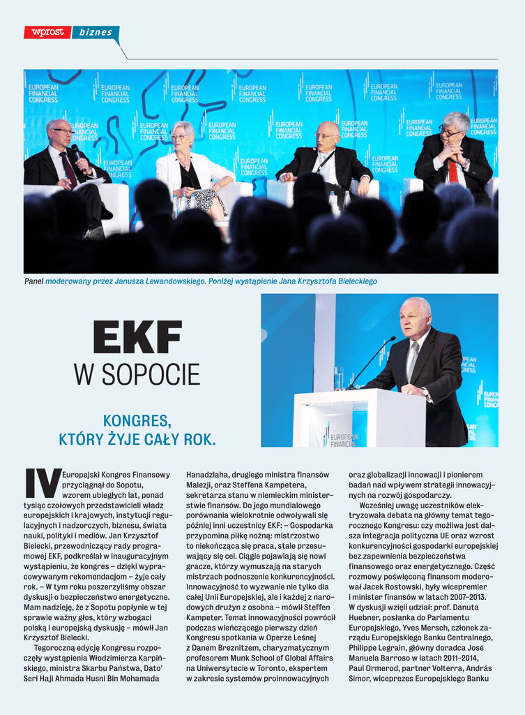 Panel moderowany przez Janusza Lewandowskiego. Poniżej wystąpienie Jana Krzysztofa Bieleckiego EKF W SOPOCIE KONGRES, KTÓRY ŻYJE CAŁY ROK. IV Europejski Kongres Finansowy przyciągnął do Sopotu, wzorem ubiegłych lat, ponad tysiąc czołowych przedstawicieli władz europejskich i krajowych, instytucji regulacyjnych i nadzorczych, biznesu, świata nauki, polityki i mediów. Jan Krzysztof Bielecki, przewodniczący rady programowej EKF, podkreślał w inauguracyjnym wystąpieniu, że kongres – dzięki wypracowywanym rekomendacjom – żyje cały rok. – W tym roku poszerzyliśmy obszar dyskusji o bezpieczeństwo energetyczne. Mam nadzieję, że z Sopotu popłynie w tej sprawie ważny głos, który wzbogaci polską i europejską dyskusję – mówił Jan Krzysztof Bielecki. Tegoroczną edycję Kongresu rozpoczęły wystąpienia Włodzimierza Karpińskiego, ministra Skarbu Państwa, Dato’ Seri Haji Ahmada Husni Bin Mohamada Hanadzlaha, drugiego ministra finansów Malezji, oraz Steffena Kampetera, sekretarza stanu w niemieckim ministerstwie finansów. Do jego mundialowego porównania wielokrotnie odwoływali się później inni uczestnicy EKF: – Gospodarka przypomina piłkę nożną: mistrzostwo to niekończąca się praca, stale przesuwający się cel. Ciągle pojawiają się nowi gracze, którzy wymuszają na starych mistrzach podnoszenie konkurencyjności. Innowacyjność to wyzwanie nie tylko dla całej Unii Europejskiej, ale i każdej z narodowych drużyn z osobna – mówił Steffen Kampeter. Temat innowacyjności powrócił podczas wieńczącego pierwszy dzień Kongresu spotkania w Operze Leśnej z Danem Breznitzem, charyzmatycznym profesorem Munk School of Global Affairs na Uniwersytecie w Toronto, ekspertem w zakresie systemów proinnowacyjnych oraz globalizacji innowacji i pionierem badań nad wpływem strategii innowacyjnych na rozwój gospodarczy. Wcześniej uwagę uczestników elektryzowała debata na główny temat tegorocznego Kongresu: czy możliwa jest dalsza integracja polityczna UE oraz wzrost konkurencyjności gospodarki europejskiej bez zapewnienia bezpieczeństwa finansowego oraz energetycznego. Część rozmowy poświęconą finansom moderował Jacek Rostowski, były wicepremier i minister finansów w latach 2007-2013. W dyskusji wzięli udział: prof. Danuta Huebner, posłanka do Parlamentu Europejskiego, Yves Mersch, członek zarządu Europejskiego Banku Centralnego, Philippe Legrain, główny doradca José Manuela Barroso w latach 2011-2014, Paul Ormerod, partner Volterra, András Simor, wiceprezes Europejskiego Banku 17 FOT. MAT. PRAS. Odbudowy i Rozwoju, prof. Hans-Werner Sinn, prezes Ifo Institute for Economic Research, Rolf Wenzel, gubernator Banku Rozwoju Rady Europy, oraz Zbigniew Jagiełło, prezes PKO Banku Polskiego. Panel poświęcony bezpieczeństwu energetycznemu został podzielony na część europejską i krajową. W pierwszej wizją energetycznej przyszłości Europy podzielili się: Joschka Fischer, wicekanclerz i minister spraw zagranicznych Niemiec w latach 1998-2005, Maria van der Hoeven, dyrektor wykonawczy Międzynarodowej Agencji Energetycznej (International Energy Agency), oraz Günter Verheugen, komisarz UE ds. rozszerzenia Unii w latach 1999-2004 oraz komisarz UE ds. przemysłu i przedsiębiorczości w latach 2004-2010. Dyskusję moderował Janusz Lewandowski, komisarz UE ds. budżetu i planowania finansowego. Drugą część debaty – skoncentrowaną na wyzwaniach stojących przed Polską - poprowadził Jan Krzysztof Bielecki. W panelu zasiedli: Jan Chadam, prezes zarządu Operatora Gazociągów Przesyłowych Gaz-System, Piotr Chełmiński, członek zarządu PKN ORLEN, Ireneusz Łazor, prezes zarządu Towarowa Giełda Energii, Henryk Majchrzak, prezes zarządu PSE, Marcin Moskalewicz, prezes zarządu PERN „Przyjaźń”, oraz Marek Woszczyk, prezes zarządu PGE Polska Grupa Energetyczna. Droga, którą Polska przebyła przez ostatnie 25 lat, pozostaje dla wielu zagranicznych gości inspiracją i punktem odniesienia. Wspominał o niej choćby minister finansów Malezji. Wiele miejsca Polsce i jej obecnemu znaczeniu na mapie Europy poświęcili goście także drugiego dnia Kongresu. – Polska rośnie dwukrotnie szybciej niż unijna średnia, a to oznacza, że w coraz większym stopniu będzie wpływać na dynamikę rozwoju całej europejskiej gospodarki – przekonywał Laszlo Baranyay, wiceprezes Europejskiego Banku Inwestycyjnego, jeden z gości drugiego dnia IV Europejskiego Kongresu Finansowego. Autor kolejnego wystąpienia, prof. Hans-Werner Sinn, prezes Ifo Institute for Economic Research, również wielokrotnie odwoływał się do przykładu Polski, która – w odróżnieniu od innych krajów, zwłaszcza peryferyjnych państw strefy euro - uniknęła kosztownych błędów, dzięki czemu poradziła sobie z kryzysem znacznie lepiej niż inne kraje Steffen Kampeter Parliamentary Secretary of State z Niemiec. Poniżej Yves Mersch, Hans-Werner Sinn i Paul Ormerod europejskie. Jego gorzka ocena kondycji i przyszłości strefy euro była jednym z najbardziej emocjonujących wystąpień podczas II dnia Europejskiego Kongresu Finansowego. Zdaniem prof. Sinna największym problemem strefy euro jest jej spoiwo, czyli wspólna waluta. Wyrwanie Unii Europejskiej z klinczu, w którym na własne życzenie się znalazła, wymaga odważnych, niepopularnych decyzji: - Ratunkiem dla strefy euro może być trwała redukcja długu najbardziej pogrążonych państw, ale połączona z mocnymi ograniczeniami budżetowymi, możliwością okresowego wychodzenia niekonkurencyjnych państw ze strefy euro i dopuszczaniem bankructwa państw członkowskich, tak by inwestorzy mogli realnie wyceniać ryzyko – uważa prof. Hans-Werner Sinn. Uczestnicy IV Europejskiego Kongresu Finansowego zidentyfikowali kluczowe wyzwania stojące przed Polską i Europą. Propozycje praktycznych rozwiązań tych problemów tradycyjnie przybrały już formę rekomenda