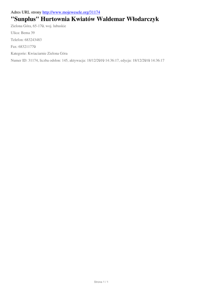 Adres URL strony http://www.mojewesele.org/31174 "Sunplus" Hurtownia Kwiatów Waldemar Włodarczyk Zielona Góra, 65-170, woj. lubuskie Ulica: Bema 39 Telefon: 683243483 Fax: 683211770 Kategorie: Kwiaciarnie Zielona Góra Numer ID: 31174, liczba odsłon: 145, aktywacja: 18/12/2010 14:36:17, edycja: 18/12/2010 14:36:17 Strona 1 / 1