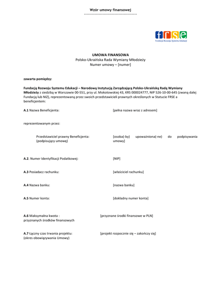 Wzór umowy finansowej ---------------------------------------- UMOWA FINANSOWA Polsko-‐Ukraińska Rada Wymiany Młodzieży Numer umowy – [numer] zawarta pomiędzy: Fundacją Rozwoju Systemu Edukacji – Narodową Instytucją Zarządzającą Polsko-‐Ukraińską Radą Wymiany Młodzieży z siedzibą w Warszawie 00-‐551, przy ul. Mokotowskiej 43, KRS 000024777, NIP 526-‐10-‐00-‐645 (zwaną dalej Fundacją lub NIZ), reprezentowaną przez swoich przedstawicieli prawnych określonych w Statucie FRSE a beneficjentem: A.1 Nazwa Beneficjenta: [pełna nazwa wraz z adresem] reprezentowanym przez: Przedstawiciel prawny Beneficjenta: (podpisujący umowę) [osoba(-‐by) umowy] upoważniona(-‐ne) [NIP] [właściciel rachunku] [nazwa banku] [dokładny numer konta] [przyznane środki finansowe w PLN] [projekt rozpocznie się – zakończy się] do A.2. Numer Identyfikacji Podatkowej: A.3 Posiadacz rachunku: A.4 Nazwa banku: A.5 Numer konta: A.6 Maksymalna kwota : przyznanych środków finansowych A.7 Łączny czas trwania projektu: (okres obowiązywania Umowy) podpisywania STRONY POSTANAWIAJĄ CO NASTĘPUJE: ARTYKUŁ 1 – PRZEDMIOT UMOWY I WARUNKI PRZYZNANIA DOTACJI 1.1 Niniejsza umowa określa zasady wykorzystywania środków finansowych przyznanych Beneficjentowi w ramach Polsko-‐Ukraińskiej Rady Wymiany Młodzieży na realizację przez Beneficjenta projektu pod nazwą: [tytuł projektu] (zwanego dalej projektem), o numerze referencyjnym: [numer projektu], którego opis wraz ze szczegółowym budżetem przedstawiono w załączniku I stanowiącym integralną część umowy. Beneficjent oświadcza, że przyjmuje do wiadomości i akceptuje te warunki. 1.2 Środki te nie stanowią należności finansowej będącej podstawą roszczeń w stosunku do Fundacji lub Ministerstwa Edukacji Narodowej Rzeczypospolitej Polskiej. W związku z tym w żadnym wypadku środki te nie mogą, ani w części ani w całości, zostać przekazane stronie trzeciej bądź stanowić przedmiotu zobowiązania lub roszczenia wobec strony trzeciej. 1.3 Wskazane środki finansowe pochodzą z dotacji przyznanej Fundacji na mocy umowy z dnia 16 czerwca 2016 r. pomiędzy Ministerstwem Edukacji Narodowej a Fundacją 1.4 Beneficjent przyjmuje środki finansowe i zobowiązuje się wykonać działania zgodnie z opisem znajdującym się w załączniku I, działając we własnym imieniu i na własną odpowiedzialność. ARTYKUŁ 2 – DATA WEJŚCIA W ŻYCIE I OKRES OBOWIĄZYWANIA 2.1 Niniejsza umowa wchodzi w życie po bezwarunkowym zaakceptowaniu i podpisaniu jej przez obie strony na okres podany w pozycji A.7. 2.2 Beneficjent zobowiązany jest odesłać listem poleconym do Fundacji, na adres podany w Artykule 15.1, należycie podpisaną umowę w ciągu 7 dni od dnia jej otrzymania. 2.3 Niedopełnienie obowiązku określonego w Artykule 2.2 może być potraktowane przez Fundację jako rezygnacja z przyznanych środków i skutkować unieważnieniem decyzji o ich przyznaniu. 2.4 Projekt oraz okres dopuszczalności zakwalifikowania kosztów jako podlegających zwrotowi rozpoczną się najwcześniej w pierwszym dniu obowiązywania umowy finansowej, zaś zakończą się nie później niż ostatniego dnia włącznie. Wszelkie koszty poniesione przed lub po terminie określonym w pozycji A.7. (data wystawienia dokumentu finansowego i data jego płatności mieści się w tym okresie) uznaje się za niekwalifikowane. ARTYKUŁ 3 – FINANSOWANIE I PŁATNOŚCI 3.1 Postanowienia ogólne Przyznane środki finansowe ograniczone będą do kwoty niezbędnej do zrównoważenia przychodów i kosztów z tytułu realizacji projektu, przewidzianych w budżecie projektu i nie mogą w żadnym wypadku przynieść Beneficjentowi jakiegokolwiek zysku. 2 z 10 3.2 Finansowanie Łączną wysokość przyznanych środków w ramach niniejszej umowy podano w pozycji A.6 na pierwszej stronie Umowy. Ostateczna wysokość przekazanych przez Fundację środków nie może w żadnym wypadku przekroczyć kwoty wskazanej w pozycji A.6. Jeżeli suma poniesionych i kwalifikowalnych kosztów będzie mniejsza niż kwota podana w pozycji A.6, ostatecznie przyznane środki zostaną ograniczone do kwoty kosztów kwalifikowalnych projektu. Ponadto, przyznane przez Fundację środki mogą zostać zmniejszone w przypadku, gdy: − łączny czas trwania projektu będzie krótszy niż zatwierdzony we wniosku o dofinansowanie; − liczba uczestników projektu będzie mniejsza; − zakres realizowanych działań będzie różnił się od zaplanowanych w zatwierdzonym wniosku o dofinansowanie; − koszty poniesione w ramach obowiązującej umowy nie będą zgodne z przepisami prawa krajowego. 3.3 Koszty kwalifikowalne Aby dane koszty zostały uznane za uprawnione koszty działania, muszą one spełniać poniższe kryteria ogólne: − muszą być powiązane z przedmiotem umowy oraz muszą zostać uwzględnione w dołączonym do niej budżecie szacunkowym; − muszą być nieodzowne do realizacji działania objętego umową; − muszą być uzasadnione oraz muszą odpowiadać zasadom właściwego zarządzania finansowego, szczególnie w zakresie stosunku wartości do ceny oraz opłacalności; − muszą zostać poniesione w okresie trwania projektu ustalonym pozycji A.7. umowy, to jest data wystawienia dokumentu finansowego i data jego płatności mieści się w tym okresie; − muszą one zostać rzeczywiście poniesione przez Beneficjenta, − zostały poniesione zgodnie z wymogami obowiązujących przepisów podatkowych i składek na ubezpieczenie społeczne, w zakresie którym będzie ich dotyczył; − są racjonalne, uzasadnione i zgodne z zasadami należytego zarządzania finansami, w szczególności oszczędności i efektywności; − będą poddawać się identyfikacji i weryfikacji, szczególnie będą zewidencjonowane w systemie księgowym organizacji Beneficjenta, zgodnie z obowiązującymi przepisami rachunkowości w tym zakresie właściwymi dla kraju, w którym Be