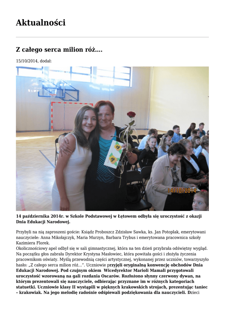 Aktualności Z całego serca milion róż…. 15/10/2014, dodał: 14 października 2014r. w Szkole Podstawowej w Łętowem odbyła się uroczystość z okazji Dnia Edukacji Narodowej. Przybyli na nią zaproszeni goście: Ksiądz Proboszcz Zdzisław Sawka, ks. Jan Potoplak, emerytowani nauczyciele: Anna Mikołajczyk, Maria Murzyn, Barbara Trybus i emerytowana pracownica szkoły Kazimiera Florek. Okolicznościowy apel odbył się w sali gimnastycznej, która na ten dzień przybrała odświętny wygląd. Na początku głos zabrała Dyrektor Krystyna Masłowiec, która powitała gości i złożyła życzenia pracownikom oświaty. Myślą przewodnią części artystycznej, wykonanej przez uczniów, towarzyszyło hasło: „Z całego serca milion róż…”. Uczniowie przyjęli oryginalną konwencję obchodów Dnia Edukacji Narodowej. Pod czujnym okiem Wicedyrektor Marioli Mamali przygotowali uroczystość wzorowaną na gali rozdania Oscarów. Rozłożono słynny czerwony dywan, na którym prezentowali się nauczyciele, odbierając przyznane im w różnych kategoriach statuetki. Uczniowie klasy II wystąpili w pięknych krakowskich strojach, prezentując taniec – krakowiak. Na jego melodię radośnie odśpiewali podziękowania dla nauczycieli. Dzieci złożyły życzenia pracownikom szkoły, wręczyły kwiaty i piękne laurki. Na ręce Dyrektor Przewodnicząca Rady Rodziców oraz sołtys Kazimierz Pajdo złożyli bukiety w podzięce za pedagogiczny i wychowawczy trud. Po części artystycznej zaproszono wszystkich gości i nauczycieli na poczęstunek przygotowany przez Radę Rodziców. Cała uroczystość przebiegała w miłej i radosnej atmosferze. red. Władysława Kozyra DZIEŃ KOMISJI EDUKACJI NARODOWEJ w Zespole Placówek Oświatowych w Kasince Małej Dwie uroczystości w Łostówce