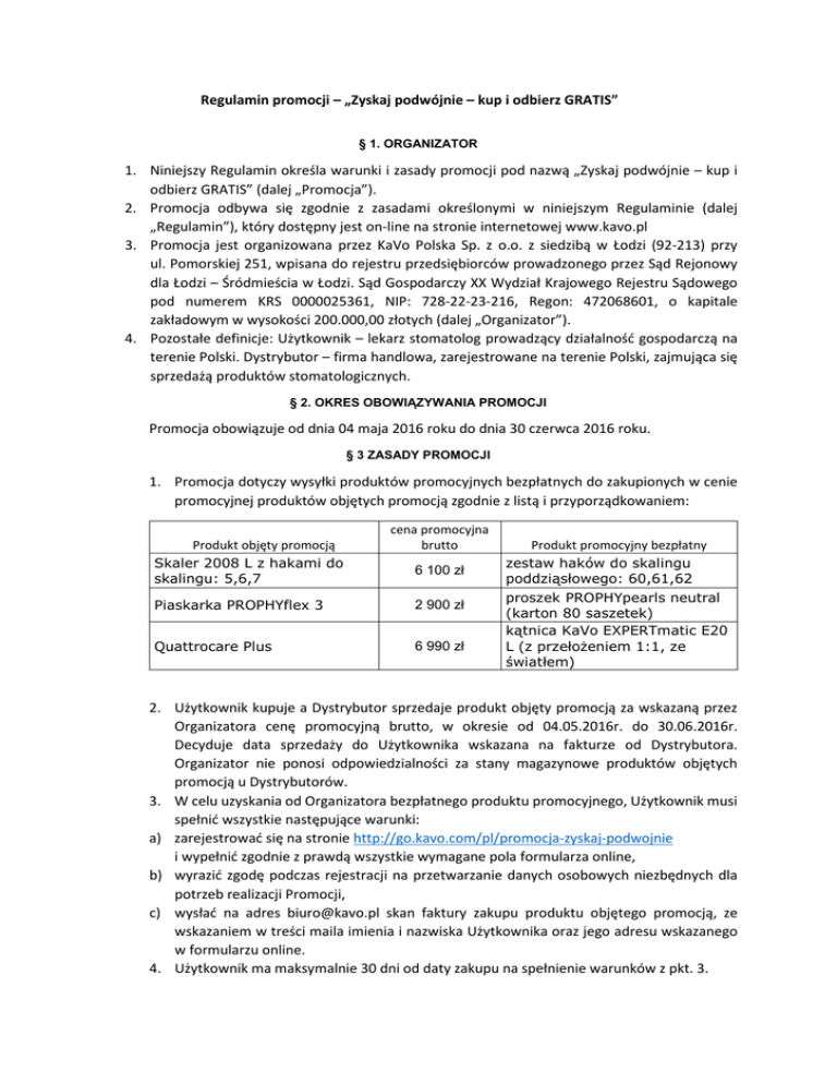 Regulamin promocji – „Zyskaj podwójnie – kup i odbierz GRATIS” § 1. ORGANIZATOR 1. Niniejszy Regulamin określa warunki i zasady promocji pod nazwą „Zyskaj podwójnie – kup i odbierz GRATIS” (dalej „Promocja”). 2. Promocja odbywa się zgodnie z zasadami określonymi w niniejszym Regulaminie (dalej „Regulamin”), który dostępny jest on-line na stronie internetowej www.kavo.pl 3. Promocja jest organizowana przez KaVo Polska Sp. z o.o. z siedzibą w Łodzi (92-213) przy ul. Pomorskiej 251, wpisana do rejestru przedsiębiorców prowadzonego przez Sąd Rejonowy dla Łodzi – Śródmieścia w Łodzi. Sąd Gospodarczy XX Wydział Krajowego Rejestru Sądowego pod numerem KRS 0000025361, NIP: 728-22-23-216, Regon: 472068601, o kapitale zakładowym w wysokości 200.000,00 złotych (dalej „Organizator”). 4. Pozostałe definicje: Użytkownik – lekarz stomatolog prowadzący działalność gospodarczą na terenie Polski. Dystrybutor – firma handlowa, zarejestrowane na terenie Polski, zajmująca się sprzedażą produktów stomatologicznych. § 2. OKRES OBOWIĄZYWANIA PROMOCJI Promocja obowiązuje od dnia 04 maja 2016 roku do dnia 30 czerwca 2016 roku. § 3 ZASADY PROMOCJI 1. Promocja dotyczy wysyłki produktów promocyjnych bezpłatnych do zakupionych w cenie promocyjnej produktów objętych promocją zgodnie z listą i przyporządkowaniem: Produkt objęty promocją Skaler 2008 L z hakami do skalingu: 5,6,7 cena promocyjna brutto 6 100 zł Piaskarka PROPHYflex 3 2 900 zł Quattrocare Plus 6 990 zł Produkt promocyjny bezpłatny zestaw haków do skalingu poddziąsłowego: 60,61,62 proszek PROPHYpearls neutral (karton 80 saszetek) kątnica KaVo EXPERTmatic E20 L (z przełożeniem 1:1, ze światłem) 2. Użytkownik kupuje a Dystrybutor sprzedaje produkt objęty promocją za wskazaną przez Organizatora cenę promocyjną brutto, w okresie od 04.05.2016r. do 30.06.2016r. Decyduje data sprzedaży do Użytkownika wskazana na fakturze od Dystrybutora. Organizator nie ponosi odpowiedzialności za stany magazynowe produktów objętych promocją u Dystrybutorów. 3. W celu uzyskania od Organizatora bezpłatnego produktu promocyjnego, Użytkownik musi spełnić wszystkie następujące warunki: a) zarejestrować się na stronie http://go.kavo.com/pl/promocja-zyskaj-podwojnie i wypełnić zgodnie z prawdą wszystkie wymagane pola formularza online, b) wyrazić zgodę podczas rejestracji na przetwarzanie danych osobowych niezbędnych dla potrzeb realizacji Promocji, c) wysłać na adres [email protected] skan faktury zakupu produktu objętego promocją, ze wskazaniem w treści maila imienia i nazwiska Użytkownika oraz jego adresu wskazanego w formularzu online. 4. Użytkownik ma maksymalnie 30 dni od daty zakupu na spełnienie warunków z pkt. 3. 5. Na podstawie danych przekazanych przez Użytkownika w formularzu online, Organizator wysyła Użytkownikowi nieodpłatny produkt promocyjny związany z produktem objętym promocją. 6. Do każdego produktu objętego promocją przysługuje jeden produkt promocyjny bezpłatny. Organizator dokonuje weryfikacji na podstawie numeru seryjnego zawartego w formularzu online. 7. W przypadku odsprzedaży przez Użytkownika produktu objętego promocją, użytkownik ma obowiązek poinformować nabywcę, iż otrzymał już produkt bezpłatny i Organizator wywiązał się już ze swojego zobowiązania związanego z Promocją. 8. W przypadku, gdy Organizator stwierdzi uchybienia lub nie potwierdzi spełnienia wszystkich warunków, nie dokona wysyłki produktu promocyjnego bezpłatnego i poinformuje Użytkownika o swojej odmownej decyzji w terminie 14 dni. 9. Odbiór przesyłki od kuriera pod adresem wskazanym w formularzu online, jest równoznaczny z odbiorem przez Użytkownika biorącego udział w promocji produktu promocyjnego bezpłatnego i Organizator nie ponosi odpowiedzialności za odbiór przesyłki pod wskazanym adresem przez osoby nieupoważnione. 10. Organizator zastrzega sobie prawo do weryfikowania u Dystrybutora przesłanych skanów faktur. 11. Promocja obowiązuje dla produktów wprowadzonych na rynek polski przez Certyfikowanych Dystrybutorów KaVo Polska. Ich lista dostępna jest na stronie www.kavo.pl. 12. Bezpłatne Produkty promocyjne nie podlegają zamianie na ekwiwalent pieniężny. Obowiązek podatkowy związany z otrzymanym Produktem Promocyjnym obciąża Uczestnika. § 4 POSTANOWIENIA KOŃCOWE 1. Udział w Promocji jest jednoznaczny z akceptacją niniejszego Regulaminu. 2. Regulamin został opublikowany w dniu 04.05.2016 r. 3. Wszelkie informacje związane z Promocją Uczestnicy mogą otrzymać kontaktując się z Organizatorem za pośrednictwem adresu e-mail: [email protected]