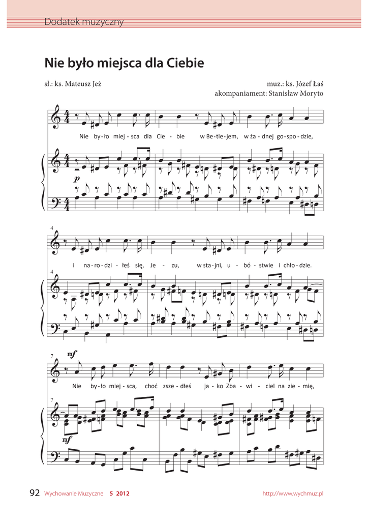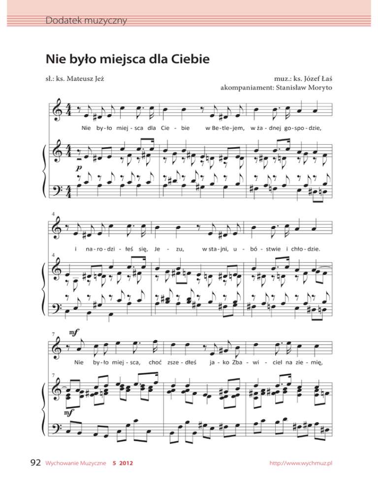 Dodatek muzyczny Nie było miejsca dla Ciebie sł.: ks. Mateusz Jeż 92 Wychowanie Muzyczne 5 2012 muz.: ks. Józef Łaś akompaniament: Stanisław Moryto http://www.wychmuz.pl Dodatek muzyczny 1. Nie było miejsca dla Ciebie w Betlejem, w żadnej gospodzie, i narodziłeś się, Jezu, w stajni, ubóstwie i chłodzie. Nie było miejsca, choć zszedłeś jako Zbawiciel na ziemię, by wyrwać z czarta niewoli nieszczęsne Adama plemię. 2. Nie było miejsca, choć chciałeś ludzkość przytulić do łona i podać z krzyża grzesznikom zbawcze, skrwawione ramiona. Nie było miejsca, choć szedłeś ogień miłości zapalić i przez swą Mękę najdroższą świat od zagłady ocalić. 3. Gdy liszki mają swe jamy i ptaszki swoje gniazdeczka, dla Ciebie brakło gospody, Tyś musiał szukać żłóbeczka. A dzisiaj czemu wśród ludzi tyle łez, jęków, katuszy? Bo nie ma miejsca dla Ciebie w niejednej człowieczej duszy! Opracowanie kolęd Wśród nocnej ciszy, Jezus malusieńki, Nie było miejsca dla Ciebie pochodzi ze Śpiewnika polskiego Marii Wacholc, wydanego w 2010 roku przez Wydawnictwo Impuls. Śpiewnik dostępny jest w naszej księgarni internetowej: www.wychmuz.pl/ksiegarnia_z_41.html. http://www.wychmuz.pl Wychowanie Muzyczne 5 2012 93