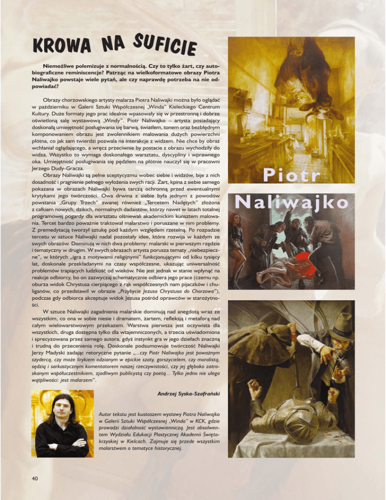 KROWA NA SUFICIE Niemo¿liwe polemizuje z normalnoœci¹. Czy to tylko ¿art, czy autobiograficzne reminiscencje? Patrz¹c na wielkoformatowe obrazy Piotra Naliwajko powstaje wiele pytañ, ale czy naprawdê potrzeba na nie odpowiadaæ? Obrazy chorzowskiego artysty malarza Piotra Naliwajki mo¿na by³o ogl¹daæ w paŸdzierniku w Galerii Sztuki Wspó³czesnej „Winda” Kieleckiego Centrum Kultury. Du¿e formaty jego prac idealnie wpasowa³y siê w przestronn¹ i dobrze oœwietlon¹ salê wystawow¹ „Windy”. Piotr Naliwajko – artysta posiadaj¹cy doskona³¹ umiejêtnoœæ pos³ugiwania siê barw¹, œwiat³em, tonem oraz bezb³êdnym komponowaniem obrazu jest zwolennikiem malowania du¿ych powierzchni p³ótna, co jak sam twierdzi pozwala na interakcje z widzem. Nie chce by obraz wch³ania³ ogl¹daj¹cego, a wrêcz przeciwnie by postacie z obrazu wychodzi³y do widza. Wszystko to wymaga doskona³ego warsztatu, dyscypliny i wprawnego oka. Umiejêtnoœæ pos³ugiwania siê pêdzlem na p³ótnie nauczy³ siê w pracowni Jerzego Dudy-Gracza. Obrazy Naliwajki s¹ pe³ne sceptycyzmu wobec siebie i widzów, bije z nich dosadnoœæ i pragnienie pe³nego wy³o¿enia swych racji. ¯art, kpina z siebie samego pokazana w obrazach Naliwajki bywa tarcz¹ ochronn¹ przed ewentualnymi krytykami jego twórczoœci. Owa drwina z siebie by³a jednym z powodów powstania „Grupy Trzech” zwanej równie¿ „Tercetem Nadêtych” z³o¿ona z ca³kiem nowych, dzikich, normalnych dadaistów, którzy nawet w latach totalnej programowej pogardy dla warsztatu olœniewali akademickim kunsztem malowania. Tercet bardzo powa¿nie traktowa³ malarstwo i poruszane w nim problemy. Z premedytacj¹ tworzy³ sztukê pod ka¿dym wzglêdem rzeteln¹. Po rozpadzie tercetu w sztuce Naliwajki nadal pozosta³y idee, które rozwija w ka¿dym ze swych obrazów. Dominuj¹ w nich dwa problemy: malarski w pierwszym rzêdzie i tematyczny w drugim. W swych obrazach artysta porusza tematy „niebezpieczne”, w których „igra z motywami religijnymi” funkcjonuj¹cymi od kilku tysiêcy lat, doskonale przek³adanymi na czasy wspó³czesne, ukazuj¹c uniwersalnoœæ problemów trapi¹cych ludzkoœæ od wieków. Nie jest jednak w stanie wp³yn¹æ na reakcje odbiorcy, bo on zazwyczaj schematycznie odbiera jego prace (czemu np. oburza widok Chrystusa cierpi¹cego z r¹k wspó³czesnych nam pijaczków i chuliganów, co przedstawi³ w obrazie „Przybycie Jezusa Chrystusa do Chorzowa”), podczas gdy odbiorca akceptuje widok Jezusa poœród oprawców w staro¿ytnoœci. W sztuce Naliwajki zagadnienia malarskie dominuj¹ nad anegdot¹ wraz ze wszystkim, co ona w sobie niesie i dramatem, ¿artem, refleksj¹ i metafor¹ nad ca³ym wielowarstwowym przekazem. Warstwa pierwsza jest oczywista dla wszystkich, druga dostêpna tylko dla wtajemniczonych, a trzecia uœwiadomiona i sprecyzowana przez samego autora, gdy¿ instynkt gra w jego dzie³ach znaczn¹ i trudn¹ do przecenienia rolê. Doskonale podsumowuje twórczoœæ Naliwajki Jerzy Madyski zadaj¹c retoryczne pytanie „...czy Piotr Naliwajko jest powa¿nym szyderc¹, czy mo¿e lirykiem odzianym w epickie szaty, gorszycielem, czy moralist¹, sêdzi¹ i sarkastycznym komentatorem naszej rzeczywistoœci, czy jej g³êboko zatroskanym wspó³uczestnikiem, zjadliwym publicyst¹ czy poet¹... Tylko jedno nie ulega w¹tpliwoœci: jest malarzem”. Andrzej Syska-Szafrañski Autor tekstu jest kustoszem wystawy Piotra Naliwajko w Galerii Sztuki Wspó³czesnej „Winda” w KCK, gdzie prowadzi dzia³alnoœæ wystawiennicz¹. Jest absolwentem Wydzia³u Edukacji Plastycznej Akademii Œwiêtokrzyskiej w Kielcach. Zajmuje siê przede wszystkim malarstwem o tematyce historycznej. 40 Piotr Naliwajko