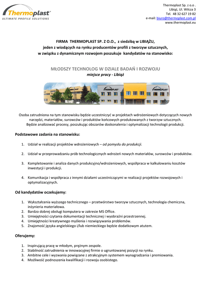 Thermoplast Sp. z o.o . Libiąż, Ul. Wilcza 3 Tel. 48 32 627 19 82 e‐mail: [email protected] www.thermoplast.eu FIRMA THERMOPLAST SP. Z O.O., z siedzibą w LIBIĄŻU, jeden z wiodących na rynku producentów profili z tworzyw sztucznych, w związku z dynamicznym rozwojem poszukuje kandydatów na stanowisko: MŁODSZY TECHNOLOG W DZIALE BADAŃ I ROZWOJU miejsce pracy ‐ Libiąż Osoba zatrudniona na tym stanowisku będzie uczestniczyć w projektach wdrożeniowych dotyczących nowych narzędzi, materiałów, surowców i produktów końcowych produkowanych z tworzyw sztucznych. Będzie analizować procesy, poszukując obszarów doskonalenia i optymalizacji technologii produkcji. Podstawowe zadania na stanowisku: 1. Udział w realizacji projektów wdrożeniowych – od pomysłu do produkcji. 2. Udział w przeprowadzaniu prób technologicznych wdrożeń nowych materiałów, surowców i produktów. 3. Kompletowanie i analiza danych produkcyjno/wdrożeniowych, współpraca w kalkulowaniu kosztów inwestycji i produkcji. 4. Komunikacja i współpraca z innymi działami uczestniczącymi w realizacji projektów rozwojowych i optymalizacyjnych. Od kandydatów oczekujemy: 1. Wykształcenia wyższego technicznego – przetwórstwo tworzyw sztucznych, technologia chemiczna, inżynieria materiałowa. 2. Bardzo dobrej obsługi komputera w zakresie MS Office. 3. Umiejętności czytania dokumentacji technicznej i wyobraźni przestrzennej. 4. Umiejętności kreatywnego myślenia i rozwiązywania problemów. 5. Znajomość języka angielskiego i/lub niemieckiego będzie dodatkowym atutem. Oferujemy: 1. 2. 3. 4. Inspirującą pracę w młodym, prężnym zespole. Stabilność zatrudnienia w innowacyjnej firmie o ugruntowanej pozycji na rynku. Ambitne cele i wyzwania powiązane z atrakcyjnym systemem wynagradzania i premiowania. Możliwość podnoszenia kwalifikacji i rozwoju osobistego.
