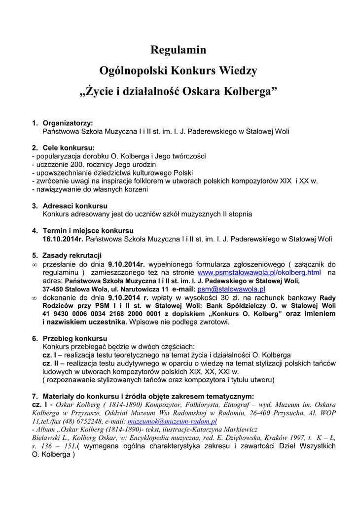 Regulamin Ogólnopolski Konkurs Wiedzy „Życie i działalność Oskara Kolberga” 1. Organizatorzy: Państwowa Szkoła Muzyczna I i II st. im. I. J. Paderewskiego w Stalowej Woli 2. Cele konkursu: - popularyzacja dorobku O. Kolberga i Jego twórczości - uczczenie 200. rocznicy Jego urodzin - upowszechnianie dziedzictwa kulturowego Polski - zwrócenie uwagi na inspiracje folklorem w utworach polskich kompozytorów XIX i XX w. - nawiązywanie do własnych korzeni 3. Adresaci konkursu Konkurs adresowany jest do uczniów szkół muzycznych II stopnia 4. Termin i miejsce konkursu 16.10.2014r. Państwowa Szkoła Muzyczna I i II st. im. I. J. Paderewskiego w Stalowej Woli 5. Zasady rekrutacji • przesłanie do dnia 9.10.2014r. wypełnionego formularza zgłoszeniowego ( załącznik do regulaminu ) zamieszczonego też na stronie www.psmstalowawola.pl/okolberg.html na adres: Państwowa Szkoła Muzyczna I i II st. im. I. J. Padewskiego w Stalowej Woli, 37-450 Stalowa Wola, ul. Narutowicza 11 e-mail: [email protected] • dokonanie do dnia 9.10.2014 r. wpłaty w wysokości 30 zł. na rachunek bankowy Rady Rodziców przy PSM I i II st. w Stalowej Woli: Bank Spółdzielczy O. w Stalowej Woli 41 9430 0006 0034 2168 2000 0001 z dopiskiem „Konkurs O. Kolberg” oraz imieniem i nazwiskiem uczestnika. Wpisowe nie podlega zwrotowi. 6. Przebieg konkursu Konkurs przebiegać będzie w dwóch częściach: cz. I – realizacja testu teoretycznego na temat życia i działalności O. Kolberga cz. II – realizacja testu audytywnego w oparciu o wiedzę na temat stylizacji polskich tańców ludowych w utworach kompozytorów polskich XIX, XX, XXI w. ( rozpoznawanie stylizowanych tańców oraz kompozytora i tytułu utworu) 7. Materiały do konkursu i źródła objęte zakresem tematycznym: cz. I - Oskar Kolberg ( 1814-1890) Kompozytor, Folklorysta, Etnograf – wyd. Muzeum im. Oskara Kolberga w Przysusze, Oddział Muzeum Wsi Radomskiej w Radomiu, 26-400 Przysucha, Al. WOP 11,tel./fax (48) 6752248, e-mail: [email protected] - Album „Oskar Kolberg (1814-1890)- tekst, ilustracje-Katarzyna Markiewicz Bielawski L., Kolberg Oskar, w: Encyklopedia muzyczna, red. E. Dziębowska, Kraków 1997, t. K – Ł, s. 136 – 151.( wymagana ogólna charakterystyka zakresu i zawartości Dzieł Wszystkich O. Kolberga ) cz. II - test audytywny oparty będzie na wybranych utworach z kanonu zawartego w Programie nauczania przedmiotu Literatura muzyczna w szkole muzycznej II st.-elementy folkloru polskiego autorstwa D. Kalinowskiej i R. Wilento: 1. F. Chopin, Rondo a`la Mazur F-dur op. 5 2. F. Chopin, Rondo a`la Krakowiak F-dur op.14 3. F. Chopin, Fantazja A-dur na tematy polskie A-dur op. 13 4. F. Chopin, Koncert fortepianowy e-moll op.11 cz. III 5. F. Chopin, Mazurki op. 33 6. F. Chopin, Polonez A-dur op. 40 nr 1 7. St. Moniuszko, opera Straszny dwór – Mazur z aktu IV 8. St. Moniuszko, opera Halka – Mazur z aktu I , Tańce góralskie z aktu III 9. St. Moniuszko, opera Hrabina – Polonez z aktu II 10. H. Wieniawski, Polonez A-dur op.21 11. H. Wieniawski, Kujawiak a-moll 12. Z. Noskowski, Polonez elegijny 13. I.J. Paderewski, Krakowiak fantastyczny 14. K. Szymanowski, Wariacje fortepianowe na polski temat ludowy op.10 15. K. Szymanowski, Cztery tańce polskie (Mazurek, Krakowiak, Oberek, Polonez) 16. K. Szymanowski, Mazurki op.50 nr 1,nr 13 17. K. Szymanowski, balet-pantomima Harnasie op. 55 ,taniec góralski 18. K. Szymanowski, 6 pieśni kurpiowskich na chór mieszany 19. L. Różycki, balet Pan Twardowski 20. A. Malawski, balet Wierchy 21. A. Malawski, cykl na fortepian Tryptyk góralski 22. G. Bacewicz, Oberek na skrzypce nr 1 23. W. Lutosławski, Mała suita 24. W. Lutosławski, Koncert na orkiestrę 25. W. Kilar, Krzesany 26. W. Kilar, Orawa • • • • Przed ogłoszeniem wyników odbędą się warsztaty dla uczestników konkursu i uczniów PSM w Stalowej Woli „Polskie tańce narodowe i regionu Lasowiaków” przy muzyce kapeli ( uczestnicy konkursu mogą zaprezentować folklor własnego regionu) ogłoszenie wyników i wręczenie nagród laureatom konkursu odbędzie się podczas koncertu na zakończenie imprezy zasady oceniania i przyznawania nagród ustala Jury Konkursu powołane przez Dyrektora Centrum Edukacji Artystycznej. Decyzje Jury są nieodwołalne każdy uczestnik otrzyma dyplom uczestnictwa a laureaci nagrody Informacje pozostałe • każda szkoła może wytypować 2 uczestników • organizator nie pokrywa kosztów przejazdów, wyżywienia, zakwaterowania • dane uczestników Konkursu będą przetwarzane zgodnie z postanowieniami ustawy o ochronie danych osobowych z dn. 29.08.1997 r.(Dz. U. z 2002, nr 101, poz. 926 ze zm.) • organizator zastrzega sobie prawo do podania do publicznej wiadomości danych osobowych ( imienia i nazwiska ,danych szkoły, które te osoby reprezentują) osób, które otrzymają nagrody i wyróżnienia w Konkursie • zgłoszenie udziału w Konkursie oznacza akceptację powyższego Regulaminu
