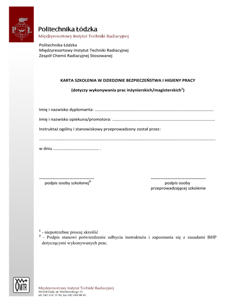 Politechnika Łódzka Międzyresortowy Instytut Techniki Radiacyjnej Zespół Chemii Radiacyjnej Stosowanej KARTA SZKOLENIA W DZIEDZINIE BEZPIECZEŃSTWA I HIGIENY PRACY (dotyczy wykonywania prac inżynierskich/magisterskich1) Imię i nazwisko dyplomanta: ………………………………………………………………………………………………. Imię i nazwisko opiekuna/promotora: ….……………………………………………………………………………… Instruktaż ogólny i stanowiskowy przeprowadzony został przez: ……………………………………………………………………………………………………………………………………………… w dniu …………………………………… . …………………………………………. podpis osoby szkolonej2 1 2 …………………………………………. podpis osoby przeprowadzającej szkolenie - niepotrzebne proszę skreślić - Podpis stanowi potwierdzenie odbycia instruktażu i zapoznania się z zasadami BHP dotyczącymi wykonywanych prac.