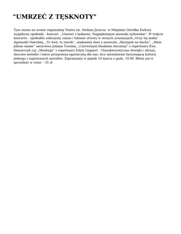 "UMRZEĆ Z TĘSKNOTY" Tym razem na scenie regionalnej Teatru im. Stefana Jaracza w Miejskim Ośrodku Kultury wyjątkowy spektakl – koncert „Umrzeć z tęsknoty. Najpiękniejsze piosenki żydowskie”. W trakcie koncertu - spektaklu usłyszymy znane i lubiane utwory w nowych aranżacjach.„Oczy tej małej” Agnieszki Osieckiej, „To świt, to zmrok”, znakomity duet z musicalu „Skrzypek na dachu”, „Mein jidisze mame” autorstwa Juliana Tuwima, „Czerwonym blaskiem otoczona” z repertuaru Ewy Demarczyk czy „Meshuge” z repertuaru Edyty Geppert. Charakterystyczne dźwięki i obrazy, skoczne melodie i tańce przypomną egzotyczną dla nas, lecz niezmiennie fascynującą kulturę jednego z najstarszych narodów. Zapraszamy w piątek 10 marca o godz. 19.00. Bilety już w sprzedaży w cenie – 35 zł.