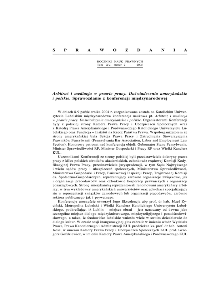 S P R A W O Z D A N I A ___________________________________________________________ ROCZNIKI NAUK PRAWNYCH Tom XV, numer 2 − 2005 Arbitraż i mediacja w prawie pracy. Doświadczenia amerykańskie i polskie. Sprawozdanie z konferencji mie˛dzynarodowej W dniach 8-9 października 2004 r. zorganizowana została na Katolickim Uniwersytecie Lubelskim mie˛dzynarodowa konferencja naukowa pt. Arbitraż i mediacja w prawie pracy. Doświadczenia amerykańskie i polskie. Organizatorami Konferencji były z polskiej strony Katedra Prawa Pracy i Ubezpieczeń Społecznych wraz z Katedra˛ Prawa Amerykańskiego i Porównawczego Katolickiego Uniwersytetu Lubelskiego oraz Fundacja – Instytut na Rzecz Państwa Prawa. Współorganizatorem ze strony amerykańskiej była Sekcja Prawa Pracy i Zatrudnienia Stowarzyszenia Prawników Pensylwanii (Pennsylvania Bar Association, Labor and Employment Law Section). Honorowy patronat nad konferencja˛ obje˛li: Gubernator Stanu Pensylwania, Minister Sprawiedliwości RP, Minister Gospodarki i Pracy RP oraz Wielki Kanclerz KUL. Uczestnikami Konferencji ze strony polskiej byli przedstawiciele doktryny prawa pracy z kilku polskich ośrodków akademickich, członkowie rzadowej ˛ Komisji Kodyfikacyjnej Prawa Pracy, przedstawiciele jurysprudencji, w tym Sadu ˛ Najwyższego i wielu sadów ˛ pracy i ubezpieczeń społecznych, Ministerstwa Sprawiedliwości, Ministerstwa Gospodarki i Pracy, Państwowej Inspekcji Pracy, Trójstronnej Komisji ds. Społeczno-Gospodarczych, reprezentujacy ˛ zarówno organizacje zwiazkowe, ˛ jak i organizacje pracodawców oraz członkowie korporacji prawniczych i organizacji pozarzadowych. ˛ Strone˛ amerykańska˛ reprezentowali renomowani amerykańscy arbitrzy, w tym wykładowcy amerykańskich uniwersytetów oraz adwokaci specjalizujacy ˛ sie˛ w reprezentacji zwiazków ˛ zawodowych lub organizacji pracodawców, zarówno sektora publicznego jak i prywatnego. Konferencje˛ uroczyście otworzył Jego Ekscelencja abp prof. dr hab. Józef Życiński, Metropolita Lubelski i Wielki Kanclerz Katolickiego Uniwersytetu Lubelskiego, podkreślajac, ˛ iż Lublin – miejsce obrad – jest uznawany od dawna jako szczególne miejsce dialogu mie˛dzykulturowego, mie˛dzyreligijnego i ponadśrodowiskowego, a także, iż środowisko lubelskie wniosło wiele w swoim dziedzictwie do dialogu kultur. W czasie sesji inauguracyjnej głos zabrali: w imieniu władz Wydziału Prawa, Prawa Kanonicznego i Administracji KUL prodziekan ks. prof. dr hab. Antoni Kość, w imieniu Katedry Prawa Pracy i Ubezpieczeń Społecznych KUL prof. Grzegorz Goździewicz, w imieniu Katedry Prawa Amerykańskiego i Porównawczego KUL 164 SPRAWOZDANIA prof. Delaine Swenson, w imieniu Fundacji – Instytutu na Rzecz Państwa Prawa dr Tomasz Sieniow. W imieniu strony amerykańskiej konferencje˛ otworzył Przewodniczacy ˛ Sekcji Prawa Pracy i Zatrudnienia Stowarzyszenia Prawników Pensylwanii adwokat Charles F. X. Szymański. W koncepcji organizatorów, konferencja miała stać sie˛ okazja˛ do zaprezentowania amerykańskich doświadczeń z zakresu rozwiazywania ˛ sporów zarówno indywidualnych, jak i zbiorowych w prawie pracy na drodze pozasadowego ˛ arbitrażu i mediacji, a także krytyczna refleksja nad stanem prawnym i praktyka˛ wykorzystywania obowiazuj ˛ acych ˛ procedur rozwiazywania ˛ sporów pracy w polskim systemie prawnym. W realizacji tego celu pomocne miało być kolejno przedstawienie stanu prawnego i praktyki alternatywnego rozwiazywania ˛ sporów pracy w Polsce i w stanie Pensylwania, a naste˛pnie dyskusja nad możliwościa˛ ewentualnego wykorzystania wzajemnych doświadczeń. Pierwszy dzień objał ˛ dwie sesje dotyczace ˛ polskiego systemu prawnego. W czasie sesji majacej ˛ charakter wprowadzajacy ˛ do przedmiotowej problematyki, której przewodniczył prof. Michał Seweryński (Uniwersytet Łódzki, przewodniczacy ˛ rzadowej ˛ Komisji Kodyfikacyjnej Prawa Pracy) wygłoszono trzy referaty. W referacie otwierajacym ˛ pt. Mediacja i arbitraż w rozwiazywaniu ˛ sporów pracy w Polsce, prof. Grzegorz Goździewicz (KUL, członek rzadowej ˛ Komisji Kodyfikacyjnej Prawa Pracy) przedstawił ogólna˛ problematyke˛ arbitrażu i mediacji w polskim prawie pracy przede wszystkim w aspekcie obowiazuj ˛ acego ˛ stanu prawnego. W polskim prawie pracy mediacja i arbitraż wyste˛puja˛ przede wszystkim jako formy prawne rozwiazywania ˛ sporów zbiorowych. Mediacyjny charakter maja˛ również komisje pojednawcze w sprawach indywidualnych ze stosunku pracy, których celem jest ugodowe załatwienie sporu. Ich działalność jest okazjonalna i sporadyczna. Referent wskazał na potrzebe˛ szerszego wykorzystania metody mediacyjnej w sporach indywidualnych, co w istotny sposób odciażyłoby ˛ działalność sadów ˛ pracy. Drugi referat zatytułowany Poste˛powanie pojednawcze w sprawach ze stosunku pracy został wygłoszony przez se˛dzie˛ Sadu ˛ Najwyższego Terese˛ Romer (Przewodniczac ˛ a˛ Stowarzyszenia Se˛dziów Polskich „Iustitia”). Referentka przybliżyła z punktu widzenia wieloletnich doświadczeń sadowych ˛ zarówno miniony, jak i aktualny stan praktyki w zakresie wykorzystywania procedur pojednawczych prowadzacych ˛ do rozwiazania ˛ indywidualnych sporów pracy. W opinii se˛dzi Romer każda˛ metode˛ negocjacji wykorzystywana˛ do rozwiazania ˛ sporu można ocenić za pomoca˛ trzech kryteriów: czy prowadzi do madrego ˛ porozumienia, czy jest efektywna oraz czy w efekcie zmierza do polepszenia stosunków mie˛dzy stronami, a przynajmniej nie niszczy ich, co w specyfice stosunków pracy jest niezwykle istotne. W konkluzji se˛dzia Romer postawiła m.in. teze˛, iż obecnie wykorzystywanie przez pracowników i pracodawców instytucji komisji pojednawczych do rozwiazania ˛ indywidualnych sporów pracy jest w zasadzie znikome, co świadczy o tym, iż w nowych warunkach ustrojowych obowiazuj ˛ ace ˛ w kodeksie pracy przepisy, dotyc