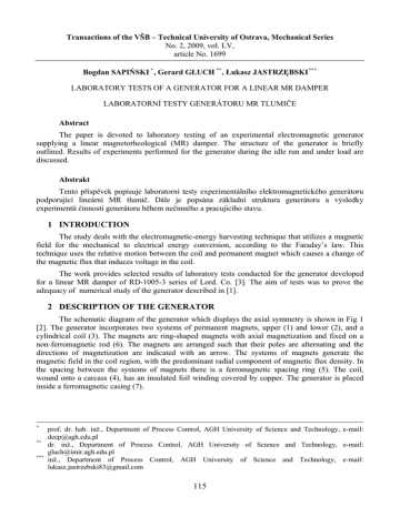 Transactions of the VŠB – Technical University of Ostrava, Mechanical Series No. 2, 2009, vol. LV, article No. 1699 Bogdan SAPIŃSKI * , Gerard GŁUCH ** , Łukasz JASTRZĘBSKI *** LABORATORY TESTS OF A GENERATOR FOR A LINEAR MR DAMPER LABORATORNÍ TESTY GENERÁTORU MR TLUMIČE Abstract The paper is devoted to laboratory testing of an experimental electromagnetic generator supplying a linear magnetorheological (MR) damper. The structure of the generator is briefly outlined. Results of experiments performed for the generator during the idle run and under load are discussed. Abstrakt Tento příspěvek popisuje laboratorní testy experimentálního elektromagnetického generátoru podporující lineární MR tlumič. Dále je popsána základní struktura generátoru a výsledky experimentů činnosti generátoru během nečinného a pracujícího stavu. 1 INTRODUCTION The study deals with the electromagnetic-energy harvesting technique that utilizes a magnetic field for the mechanical to electrical energy conversion, according to the Faraday’s law. This technique uses the relative motion between the coil and permanent magnet which causes a change of the magnetic flux that induces voltage in the coil. The work provides selected results of laboratory tests conducted for the generator developed for a linear MR damper of RD-1005-3 series of Lord. Co. [3]. The aim of tests was to prove the adequacy of numerical study of the generator described in [1]. 2 DESCRIPTION OF THE GENERATOR The schematic diagram of the generator which displays the axial symmetry is shown in Fig 1 [2]. The generator incorporates two systems of permanent magnets, upper (1) and lower (2), and a cylindrical coil (3). The magnets are ring-shaped magnets with axial magnetization and fixed on a non-ferromagnetic rod (6). The magnets are arranged such that their poles are alternating and the directions of magnetization are indicated with an arrow. The systems of magnets generate the magnetic field in the coil region, with the predominant radial component of magnetic flux density. In the spacing between the systems of magnets there is a ferromagnetic spacing ring (5). The coil, wound onto a carcass (4), has an insulated foil winding covered by copper. The generator is placed inside a ferromagnetic casing (7). * ** *** prof. dr. hab. inž., Department of Process Control, AGH University of Science and Technology, e-mail: [email protected] dr. inž., Department of Process Control, AGH University of Science and Technology, e-mail: [email protected] inž., Department of Process Control, AGH University of Science and Technology, e-mail: [email protected] 115 1 3 4 5 2 7 6 Fig. 1. Schematic diagram of the generator 3 RESULTS OF GENERATOR TESTING AND DISCUSSION The schematic diagram of the experimental setup in which the generator was tested is shown in Fig. 2. The generator and the RD-1005-3 damper were held in the testing machine (Model 835 Damper Test System) of MTS Systems Co. [4] by a special handle. The data acquisition system was based on a PC with and a multifunction card installed, and supported by LabView environment running on MS Windows. z PC Windows F Handle u Generator LabView XCS30 XILINX I/ O board i MR damper MTS testing machine Fig. 2. Schematic diagram of the experimental setup The testing machine was programmed to produce triangular and sine displacement excitations of the piston with the amplitude of 7 mm and frequency in the range (0.5, 6.5) Hz and thus enabling us to achieve the velocity of the damper piston in the range (14, 160) mm/s. The data were acquired in 10 cycles (a cycle is denoted as a piston displacement up and down). The sampling frequency for each channel was 1 kHz per cycle. 116 The generator was first tested during the idle run, when no connection was provided between the generator and the damper and then under load, when the generator was connected with the damper. When the generator was tested during the idle run, we measured the voltage u at the generator output and damper force F. Under load condition, measurements were taken of the voltage u and the current i in the damper coil and damper force F. Selected results of measured quantities are shown in Figs 3−7. a) b) Fig. 3. Voltage u for displacement excitation of the piston z with frequency: a) 1.5 Hz, b) 6.5 Hz a) b) Fig. 4. Voltage u for sine displacement excitation of the piston z with frequency: a) 1.5 Hz, b) 6.5 Hz 117 a) b) Fig. 5. Voltage u and current i for triangular displacement excitation of the piston z with frequency: a) 1.5 Hz, b) 6.5 Hz a) b) Fig. 6. Voltage u and current i for sine displacement excitation of the piston z with frequency: a) 1.5 Hz, b) 6.5 Hz The plots in Figs 3 and 4 present the voltage induced in the damper coil u measured during the idle run for triangular and sine displacement excitation of the piston z with frequency 1.5 and 6.5 Hz. Tests performed during the idle run reveal that the higher the piston velocity (i.e. larger frequency of displacement excitation), the higher voltage u. For example, under triangle excitations with the frequency 1.5 and 6.5 Hz, the effective voltage is 0.69 and 2.93 V respectively, whilst for sine excitations it equals 0.82 and 3.41 V. The plots in Figs 5 and 6 present voltage u and current i obtained under load for triangular and sine displacement excitation of the piston z with frequency 1.5 and 6.5 Hz. Tests performed under load show that the higher the piston velocity, the higher current i. For example for triangle displacement excitation with the frequency 1.5 and 6.5 Hz, the effective current is 0.11 and 0.35 A 118 respectively , whilst for sine excitations it equals 0.13 and 0.41 A. Reduction the u is the consequence of voltage drop on the internal impedance of the generator. The plots in Figs 7 show the force produced by the damper F measured during the idle run and under load for triangular displacement excitation of the piston z with frequency 1.5 and 6.5 Hz. Th