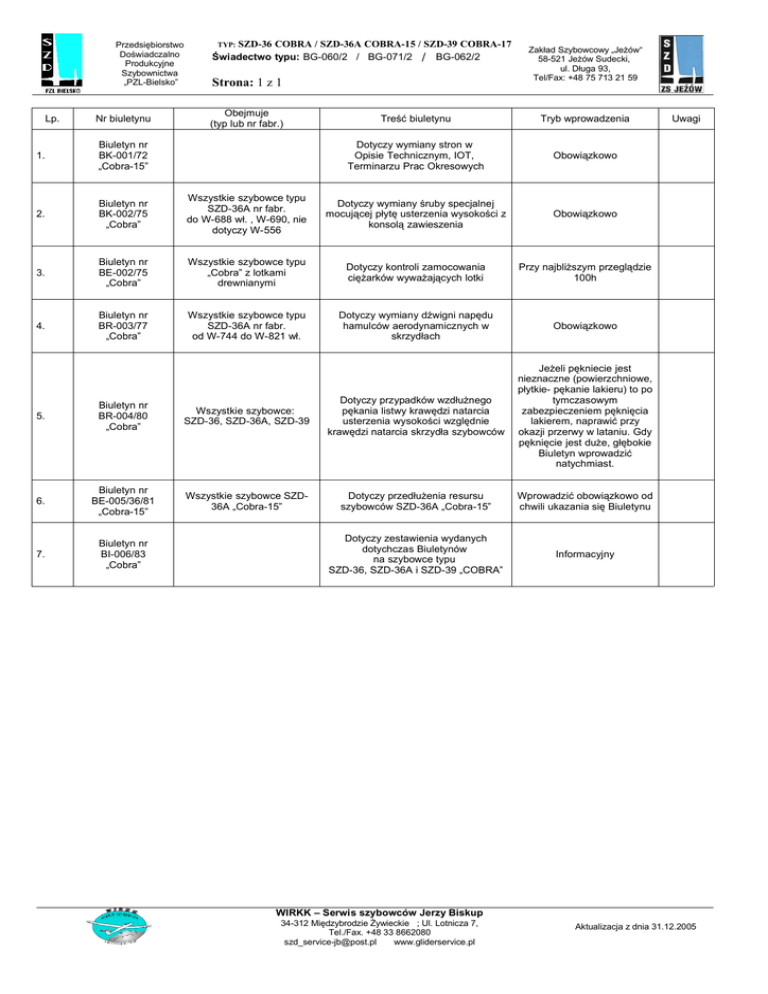 Przedsiębiorstwo Doświadczalno Produkcyjne Szybownictwa „PZL-Bielsko” Lp. Nr biuletynu TYP: SZD-36 COBRA / SZD-36A COBRA-15 / SZD-39 COBRA-17 Świadectwo typu: BG-060/2 / BG-071/2 / BG-062/2 Strona: 1 z 1 Obejmuje (typ lub nr fabr.) Zakład Szybowcowy „Jeżów“ 58-521 Jeżów Sudecki, ul. Długa 93, Tel/Fax: +48 75 713 21 59 Treść biuletynu Tryb wprowadzenia Dotyczy wymiany stron w Opisie Technicznym, IOT, Terminarzu Prac Okresowych Obowiązkowo 1. Biuletyn nr BK-001/72 „Cobra-15” 2. Biuletyn nr BK-002/75 „Cobra” Wszystkie szybowce typu SZD-36A nr fabr. do W-688 wł. , W-690, nie dotyczy W-556 Dotyczy wymiany śruby specjalnej mocującej płytę usterzenia wysokości z konsolą zawieszenia Obowiązkowo 3. Biuletyn nr BE-002/75 „Cobra” Wszystkie szybowce typu „Cobra” z lotkami drewnianymi Dotyczy kontroli zamocowania ciężarków wyważających lotki Przy najbliższym przeglądzie 100h 4. Biuletyn nr BR-003/77 „Cobra” Wszystkie szybowce typu SZD-36A nr fabr. od W-744 do W-821 wł. Dotyczy wymiany dźwigni napędu hamulców aerodynamicznych w skrzydłach Obowiązkowo 5. Biuletyn nr BR-004/80 „Cobra” Wszystkie szybowce: SZD-36, SZD-36A, SZD-39 Dotyczy przypadków wzdłużnego pękania listwy krawędzi natarcia usterzenia wysokości względnie krawędzi natarcia skrzydła szybowców Jeżeli pękniecie jest nieznaczne (powierzchniowe, płytkie- pękanie lakieru) to po tymczasowym zabezpieczeniem pęknięcia lakierem, naprawić przy okazji przerwy w lataniu. Gdy pęknięcie jest duże, głębokie Biuletyn wprowadzić natychmiast. 6. Biuletyn nr BE-005/36/81 „Cobra-15” Wszystkie szybowce SZD36A „Cobra-15” Dotyczy przedłużenia resursu szybowców SZD-36A „Cobra-15” Wprowadzić obowiązkowo od chwili ukazania się Biuletynu 7. Biuletyn nr BI-006/83 „Cobra” Dotyczy zestawienia wydanych dotychczas Biuletynów na szybowce typu SZD-36, SZD-36A i SZD-39 „COBRA” Informacyjny Uwagi WIRKK – Serwis szybowców Jerzy Biskup 34-312 Międzybrodzie Żywieckie ; Ul. Lotnicza 7, Tel./Fax. +48 33 8662080 [email protected] www.gliderservice.pl Aktualizacja z dnia 31.12.2005
