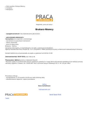 ● ● ● Work position: Brukarz-Niemcy Company: Workplace: Happinate, praca od zaraz ! Brukarz-Niemcy - cotygodniowe wymagane minimum zaliczki4 lata doświadczenia jako brukarz - pełne samodzielność, ubezpieczenie dokładność socjalne -Wymagania: komunikatywna znajomość j.niemieckiego - zatrudnienie na warunkach niemieckich - własny samochód - praca na długi okres Brukarze – Niemcy Uprzejmie informujemy, że skontaktujemy sie tylko z wybranymi kandydatami Agencja Pośrednictwa Pracy Flexjob Sp. z o.o. (Certyfikat nr 4895) poszukuje do pracy w Niemczech doświadczonych brukarzy. Kontakt telefoniczny od poniedziałku do piątku w godzinach od 9.00 do 15.00 Rozpoczęcie pracy:: 18-04-2016 pod numerami 032 746 57 40 lub 032 746 01 46 Przy wysyłaniu Miejsce pracy:: aplikacji Bochum prosimy o dopisanie klauzuli: "Wyrażam zgodę na przetwarzanie danych osobowych zawartych w mojej ofercie dla potrzeb niezbędnych do realizacji procesu rekrutacji (zgodnie z Ustawa z dn. 29.08.1997 roku o Ochronie Danych Osobowych Dz. U. Nr 133 poz. 883)" Pracodawca oferuje: - wynagrodzenie 11,25 brutto/h+24,00 euro netto dziennej diety - zakwaterowanie zapewnia i opłaca pracodawca Aplikuj Dane kontaktowe: [email protected] Send Save Print Tweet