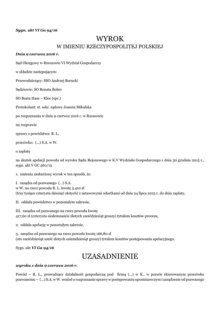 Sygn. akt VI Ga 94/16 WYROK W IMIENIU RZECZYPOSPOLITEJ POLSKIEJ Dnia 9 czerwca 2016 r. Sąd Okręgowy w Rzeszowie VI Wydział Gospodarczy w składzie następującym: Przewodniczący: SSO Andrzej Borucki Sędziowie: SO Renata Bober SO Beata Hass – Kloc (spr.) Protokolant: st. sekr. sądowy Joanna Mikulska po rozpoznaniu w dniu 9 czerwca 2016 r. w Rzeszowie na rozprawie sprawy z powództwa: R. L. przeciwko: (...) S.A. w W. o zapłatę na skutek apelacji powoda od wyroku Sądu Rejonowego w K.V Wydziału Gospodarczego z dnia 30 grudnia 2015 r., sygn. akt V GC 560/15 1. zmienia zaskarżony wyrok w ten sposób, że: I. zasądza od pozwanego (...) S.A. w W. na rzecz powoda R. L. kwotę 3.410 zł (trzy tysiące czterysta dziesięć złotych) z ustawowymi odsetkami od dnia 24 lipca 2015 r. do dnia zapłaty, II. oddala powództwo w pozostałym zakresie, III. zasądza od pozwanego na rzecz powoda kwotę 417,60 zł (czterysta siedemnaście złotych sześćdziesiąt groszy) tytułem kosztów procesu, 2. oddala apelację w pozostałym zakresie, 3. zasądza od pozwanego na rzecz powoda kwotę 166,80 zł (sto sześćdziesiąt sześć złotych osiemdziesiąt groszy) tytułem kosztów postępowania apelacyjnego. Sygn. akt VI Ga 94/16 UZASADNIENIE wyroku z dnia 9 czerwca 2016 r. Powód – R. L., prowadzący działalność gospodarczą pod firmą (...) w K., w pozwie skierowanym przeciwko pozwanemu – (...) S.A. w W. wniósł o rozpoznanie sprawy w postępowaniu upominawczym i zasądzenie od pozwanego na rzecz powoda kwoty 4.870,80 zł z ustawowymi odsetkami od dnia 24 lipca 2015 r. do dnia zapłaty oraz kosztów procesu według załączonego spisu kosztów. Na uzasadnienie wniesionego pozwu podał, że w dniu 7 września 2014 r. w P. doszło do kolizji drogowej, w wyniku której uszkodzeniu uległ samochód osobowy F. (...), właścicielem którego był poszkodowany E. B.. Poszkodowany, z uwagi na uszkodzenia pojazdu uniemożliwiające jego użytkowanie oddał uszkodzony pojazd do naprawy, a następnie wynajął u powoda pojazd zastępczy marki V. (...)!, który był wykorzystywany przez poszkodowanego w takim samym zakresie jak pojazd uszkodzony. Powód zawarł także z poszkodowanym umowę przelewu wierzytelności, na podstawie której nabył od poszkodowanego wierzytelność obejmującą prawo do zwrotu kosztów z tytułu wynajęcia pojazdu zastępczego. Zdaniem powoda, poszkodowanemu pojazd zastępczy był niezbędny do normalnego funkcjonowania, dzienna stawka wynajęcia samochodu zastępczego nie jest zawyżona, zaś poszkodowany nie podjął żadnych czynności, których skutkiem byłoby zwiększenie rozmiarów poniesionej szkody. Dodatkowo poszkodowany doznał wymiernego uszczerbku w swoim majątku w związku z poniesioną szkodą, brakiem możliwości korzystania w czasie jej likwidacji z własnego pojazdu i koniecznością najmu pojazdu zastępczego. W sprzeciwie od wydanego w sprawie nakazu zapłaty pozwany wniósł o oddalenie powództwa oraz zasądzenie od powoda na rzecz pozwanego kosztów postępowania. W uzasadnieniu sprzeciwu pozwany zakwestionował dobową stawkę wynajmu pojazdu zastępczego, uznając jednocześnie, że okres wynajmu tego pojazdu został niezasadnie wydłużony. Zdaniem pozwanego, poszkodowany winien dążyć do minimalizacji skutków szkody i jej rozmiarów, a nie swoim postępowaniem przyczyniać się do jej zwiększenia wynajmując pojazd zastępczy czy też korzystając z innych usług po wyższych cenach. Na rozprawie w dniu 17 grudnia 2015 r. pełnomocnik powoda sprostował omyłkę odnośnie klasy wypożyczonego samochodu i stawki dobowej za jego wypożyczenia podając, że powód wypożyczył pozwanemu samochód klasy A w cenie 110 zł netto, a nie samochód klasy D w cenie 130 zł netto za dobę. Sąd Rejonowy w K.po dokonanej ocenie materiału dowodowego wyrokiem z dnia 30 grudnia 2015 r. sygn. akt V GC 560/15, oddalił powództwo (pkt I) oraz zasądził od powoda na rzecz pozwanego kwotę 617 zł tytułem kosztów procesu (pkt II). Uzasadniając wyrok Sąd I instancji wskazał, że ubezpieczyciel wypłacił odszkodowanie z tytułu szkody całkowitej oraz kosztów wynajęcia auta zastępczego. W tym ostatnim przypadku wypłacona kwota wyniosła 3.763,80 zł, a ubezpieczyciel odmówił wypłaty za wynajęcie auta zastępczego przez okres 12 dni wynajmu pojazdu zastępczego przez poszkodowanego. Sąd zaznaczył, że w świetle dołączonych przez powoda dokumentów, w szczególności umową przelewu wierzytelności z dnia 16 czerwca 2015 r., legitymacja czynna powoda w niniejszej sprawie nie budzi wątpliwości. Sąd Rejonowy wskazał, że wynajęcie pojazdu zastępczego nie było poszkodowanemu E. B. konieczne ze względu na prowadzoną działalność gospodarczą, ale ze względów wyłącznie osobistych, rodzinnych. Poszkodowany jako jeden z powodów wynajęcia samochodu zastępczego wskazał dojazd do szpitala, nie precyzując powodów takiego dojazdu. Powodów takich nie wskazał także we wniesionej sprawie powód, jak również nie przedstawił na te okoliczności żadnych dowodów. Sąd nie mógł zatem zweryfikować zasadności używania samochodu zastępczego przez poszkodowanego powyżej okresu uznanego przez ubezpieczyciela, tj. od 30 października 2014 r. do dnia zwrotu pojazdu zastępczego, tj. 10 listopada 2014 r. Brak jest ponadto po stronie powoda przedstawienia informacji czy uszkodzony w trakcie zdarzenia z dnia 7 września 2014 r. samochód marki F. (...) był dla poszkodowanego jedynym środkiem poruszania się, czy też poszkodowany dysponował innymi pojazdami. Sąd Rejonowy wskazał, że ubezpieczyciel poinformował poszkodowanego pismem z dnia 22 października 2014 r. o szkodzie całkowitej i sposobie jej rozliczenia, a zatem wydaje się zasadne przyjęcie za pozwanym w kontekście powyższych rozważań, okresu wynajęcia pojazdu od momentu zgłoszenia szkody, tj. od dnia 28 września 2014 r. do dnia 29 października 2014 r. Sąd Rej