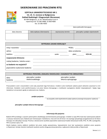 SKIEROWANIE DO PRACOWNI RTG SZPITALA UNIWERSYTECKIEGO NR 1 im. dr. A. Jurasza w Bydgoszczy Zakład Radiologii i Diagnostyki Obrazowej 85-094 Bydgoszcz, ul. M. Skłodowskiej-Curie 9 rejestracja tel. 52 585 4688, 52 858 4685 fax. 52 585 4050 dane jednostki kierującej data zlecenia data wpływu skierowania wyznaczony termin pieczątka i podpis rejestratorki WYPEŁNIA LEKARZ KIERUJĄCY imię i nazwisko: PESEL: adres: data urodzenia: telefon: wiek: płeć: ICD-10: rozpoznanie kliniczne: rodzaj badania / okolica anat.: co badanie ma wyjaśnić? poprzednio wykonane badania: WYPEŁNIA PERSONEL ZAKŁADU RADIOLOGII I DIAGNOSTYKI OBRAZOWEJ data badania pieczątka i podpis elektroradiologa pieczątka i podpis lekarza opisującego Przeczytałem (-am) i zrozumiałem (-am) całą zawartość tego formularza i miałem (-am) możliwość zadania pytań odnośnie zawartych w nim informacji. Zostałem (-am) poinformowany (-a) przez lekarza kierującego o możliwości wystąpienia działań niepożądanych i będąc tego świadomy (-a) wyrażam zgodę na wykonanie ww. badania. podpis pacjenta (w przypadku osób niepełnoletnich podpis opiekuna prawnego lub pacjenta i opiekuna) pieczątka i podpis lekarza kierującego Informacja dla pacjenta Badanie RTG przebiega z użyciem potencjalnie szkodliwego promieniowania jonizującego. U kobiet w ciąży RTG może być wykonywane jedynie w sytuacji ratowania życia. Badanie jest nieinwazyjne i bezbolesne, trwa od 5 do 10 minut i nie wymaga specjalnego przygotowania (o ile lekarz kierujący nie zdecyduje inaczej). Prosimy o dostarczenie wyników poprzednio wykonanych badań obrazowych (USG, RTG, TK, MR, scyntygrafia, PET) w postaci opisu i CD. Wynik badania można odebrać osobiście lub przez osobę upoważnioną. Upoważnienie musi być wystawione osobiście przez pacjenta w Rejestracji. Istnieje również możliwość wysłania wyniku drogą pocztową (prosimy o zgłoszenie takiej prośby w Rejestracji). Strona 1 z 1