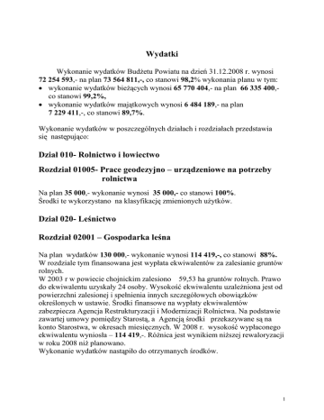 Wydatki Wykonanie wydatków BudŜetu Powiatu na dzień 31.12.2008 r. wynosi 72 254 593,- na plan 73 564 811,-, co stanowi 98,2% wykonania planu w tym: • wykonanie wydatków bieŜących wynosi 65 770 404,- na plan 66 335 400,co stanowi 99,2%, • wykonanie wydatków majątkowych wynosi 6 484 189,- na plan 7 229 411,-, co stanowi 89,7%. Wykonanie wydatków w poszczególnych działach i rozdziałach przedstawia się następująco: Dział 010- Rolnictwo i łowiectwo Rozdział 01005- Prace geodezyjno – urządzeniowe na potrzeby rolnictwa Na plan 35 000,- wykonanie wynosi 35 000,- co stanowi 100%. Środki te wykorzystano na klasyfikację zmienionych uŜytków. Dział 020- Leśnictwo Rozdział 02001 – Gospodarka leśna Na plan wydatków 130 000,- wykonanie wynosi 114 419,-, co stanowi 88%. W rozdziale tym finansowana jest wypłata ekwiwalentów za zalesianie gruntów rolnych. W 2003 r w powiecie chojnickim zalesiono 59,53 ha gruntów rolnych. Prawo do ekwiwalentu uzyskały 24 osoby. Wysokość ekwiwalentu uzaleŜniona jest od powierzchni zalesionej i spełnienia innych szczegółowych obowiązków określonych w ustawie. Środki finansowe na wypłaty ekwiwalentów zabezpiecza Agencja Restrukturyzacji i Modernizacji Rolnictwa. Na podstawie zawartej umowy pomiędzy Starostą, a Agencją środki przekazywane są na konto Starostwa, w okresach miesięcznych. W 2008 r. wysokość wypłaconego ekwiwalentu wyniosła – 114 419,-. RóŜnica jest wynikiem niŜszej rewaloryzacji w roku 2008 niŜ planowano. Wykonanie wydatków nastąpiło do otrzymanych środków. 1 Rozdział 02002- Nadzór nad gospodarką leśną Na plan wydatków 156 730,- wykonanie wynosi 156 730,-, co stanowi 100%. W rozdziale tym finansowany jest nadzór nad gospodarką leśną. W roku 2008 koszt nadzoru za 1 ha powierzchni wynosił – 14,Na mocy zawartych porozumień między Starostą, a Nadleśniczymi sprawy z zakresu gospodarki leśnej zostały powierzone następującym Nadleśnictwom: • Przymuszewo – 3.883 ha • Czersk – 4.635 ha • Rytel – 1.008 ha • Lutówko – 249 ha • Osusznica – 1.420 ha Łączna powierzchnia 11 195 ha Dział O50 – Rybołówstwo i rybactwo Rozdział O5009 – Rybołówstwo i przetwórstwo ryb Na plan wydatków 64 660,- wykonanie wynosi 64 660,- , co stanowi 100%. W rozdziale tym zrealizowano zadanie promocyjne „ Kampania promocyjna Święto pstrąga” w miejscowości Rytel gdzie środki w całej wysokości pozyskano z Agencji Restrukturyzacji i Modernizacji Rolnictwa. Dział 600- Transport i łączność Rozdział 60014- Drogi Publiczne Powiatowe Na plan wydatków 6 268 000,- wykonanie wynosi 6 265 662,-, co stanowi 99,9%. W rozdziale tym finansowany jest Powiatowy Zarząd Dróg. Wydatki poniesiono na: • • • • wynagrodzenia i pochodne w kwocie 588 461,koszty zarządzania siecią drogową w kwocie 207 123,zimowe utrzymanie w kwocie 397 056,bieŜące utrzymanie w tym: - obiekty mostowe 264,- zakup materiałów 434 478,- (w tym masa na zimno, podbudowa, emulsja, grys, kruszywo, farby, znaki i słupki do znaków, polbruk, krawęŜniki, obrzeŜa, kratki wpustowe, Ŝwir, cement, beton, rury, pozostałe ) 2 - zakup usług na kwotę 2 695 820,- w tym: opracowanie projektów i studium wykonalności 54 850,remont dróg, malowanie poziome 254 573,transport materiałów 38 875,profilowanie dróg, regulacja wpustów 52 720,odwodnienie i usuwanie wód opadowych 42 743,koszenie traw i chwastów, ścinka poboczy 176 442,obcinanie gałęzi i usuwanie krzewów 26 518,poziome oczyszczanie ulic 14 394,przepusty 31 154,ułoŜenie chodnika, naprawa chodnika 66 850,stabilizacja gruntu 1 886 109,- na następujących drogach: • Klawkowo – Chojnaty w m. Lipienice 805 mb, • Klawkowo – Chojnaty w m. Klawkowo 380mb, • Kłodawa – Kruszka w m. Kruszka 300mb, • Skoszewo – Przymuszewo 1 800 mb, • Czyczkowy – Chłopowy wm. CzarniŜ 300 mb, • KrzyŜ – Kwieki 2 200 mb, • Ustronie – Kurcze w m. Kurcze 500mb, • Kiełpin – Zielona Chocina odc. Binduga – Nierostowo 2 263 mb. Wykonanie zadań inwestycyjnych przedstawiono w załączniku nr 6 i 7 w tym: inwestycje roczne 1 858 430,-, inwestycje wieloletnie 15 000,Z wydatków niewygasających w 2008 wykonano: • chodnik na ul. Towarowej na kwotę 30 000,• projekt budowlany drogi powiatowej Małe Gliśno – Lubnia 92 800,• chodnik w Nowej Cerkwi 59 987,• projekt budowlany drogi Czersk – Klaskawa 97 900,• chodnik w m. Leśno 105 000,- Dział 700- Gospodarka Mieszkaniowa Rozdział 70005- Gospodarka gruntami i nieruchomościami Na plan wydatków 385 000,- wykonanie wynosi 254 977,-, co stanowi 66,2%. Wydatki związane z realizacją zadań zleconych, których źródłem finansowania była dotacja celowa wynosiły 25 113,- na plan 35 000,-. Wydatki związane z utrzymaniem nieruchomości powiatu, których źródłem finansowania są dochody własne powiatu wynosiły 229 863,- i dotyczyły: 3 wyceny nieruchomości - 3 123,ogłoszenia - 4 360,opisy i mapy - 1 998,opłaty sądowe, notarialne, komornicze – 14 373,podziały geodezyjne - 3 416,zarządzanie lokalami - 89 494,zwrot kaucji mieszkaniowych - 26 710,podatek od nieruchomości - 4 117,wypłacone odszkodowania za działki gruntu wydzielone pod drogi – 51 668,• energia cieplna ( Firma Restal) 30 573,• inne - 30,- • • • • • • • • • Dział 710- Działalność usługowa Rozdział 71013- Prace geodezyjne i kartograficzne Na plan wydatków 100 000,- wykonanie wynosi 100 000,-, co stanowi 100%. Kwotę tą wykorzystano na dofinansowanie prac geodezyjnych związanych z modernizacją ewidencji gruntów i budynków gminy Czersk. Źródłem finansowania jest dotacja celowa. Rozdział 71014- Opracowania geodezyjne i kartograficzne Na plan wydatków 35 000,- wykonanie wynosi 34 998,-, co stanowi 99,9%. Wydatkowana kwota dotyczy dokumentacji związanej z regulacją stanu prawnego nieruchomości Skarbu Państwa. Źródłem finansowania jest dotacja celowa. Rozdzia