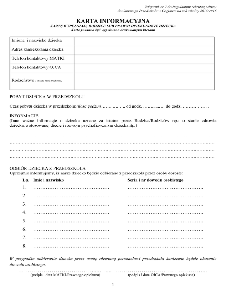 Załącznik nr 7 do Regulaminu rekrutacji dzieci do Gminnego Przedszkola w Cegłowie na rok szkolny 2015/2016 KARTA INFORMACYJNA KARTĘ WYPEŁNIAJĄ RODZICE LUB PRAWNI OPIEKUNOWIE DZIECKA Karta powinna być wypełniona drukowanymi literami Imiona i nazwisko dziecka Adres zamieszkania dziecka Telefon kontaktowy MATKI Telefon kontaktowy OJCA Rodzeństwo ( imiona i rok urodzenia) POBYT DZIECKA W PRZEDSZKOLU Czas pobytu dziecka w przedszkolu:(ilość godzin)……..….…., od godz. ……......…. do godz. ……………. . INFORMACJE (Inne ważne informacje o dziecku uznane za istotne przez Rodzica/Rodziców np.: o stanie zdrowia dziecka, o stosowanej diecie i rozwoju psychofizycznym dziecka itp.) ……………………………………………………………………………………………………………………… ……………………………………………………………………………………………………………………… ……………………………………………………………………………………………………………………… ……………………………………………………………………………………………………………………… ODBIÓR DZIECKA Z PRZEDSZKOLA Uprzejmie informujemy, iż nasze dziecko będzie odbierane z przedszkola przez osoby dorosłe: Lp. Imię i nazwisko Seria i nr dowodu osobistego 1. ……………………………………. ……………………………………. 2. ……………………………………. ……………………………………. 3. ……………………………………. ……………………………………. 4. ……………………………………. ……………………………………. 5. ……………………………………. ……………………………………. 6. ……………………………………. ……………………………………. 7. ……………………………………. ……………………………………. 8. ……………………………………. ……………………………………. W przypadku odbierania dziecka przez osobę nieznaną personelowi przedszkola konieczne będzie okazanie dowodu osobistego. ………………………………......…... …….………………………………... (podpis i data MATKI/Prawnego opiekuna) (podpis i data OJCA/Prawnego opiekuna) 1 Załącznik nr 7 do Regulaminu rekrutacji dzieci do Gminnego Przedszkola w Cegłowie na rok szkolny 2015/2016 Oświadczenia Rodziców o zapoznaniu z poniższymi dokumentami i zobowiązują się do przestrzegania ich założeń: Podpis MATKI Podpis OJCA Zapoznania się ze Statutem Przedszkola i przestrzegania jego postanowień Zapoznanie się z Regulaminem rekrutacji dzieci do Gminnego Przedszkola w Cegłowie na rok szkolny 2015/2016 OŚWIADCZENIE RODZICÓW 1. 2. Świadomi odpowiedzialności karnej za złożenie fałszywych danych oświadczamy, że podane informacje w niniejszej karcie są zgodne ze stanem faktycznym. Wyrażam zgodę na przetwarzanie danych osobowych zawartych w niniejszej karcie dla potrzeb związanych z postępowaniem rekrutacyjnym i pobytem dziecka w przedszkolu zgodnie z ustawą z dnia 29.08.1997 r. o ochronie danych osobowych (Dz.U. z 2002, Nr 101, poz. 926 z późn. zm.) ………………………………......…... …….………………………………... (podpis i data MATKI/Prawnego opiekuna) (podpis i data OJCA/Prawnego opiekuna) 2