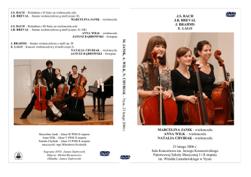 J.S. BACH – Preludium z II Suity na wiolonczelę solo J.B. BREVAL – Sonata wiolonczelowa g-moll (częśc II) MARCELINA JANIK – wiolonczela J.S. BACH J.B. BREVAL J. BRAHMS E. LALO J.S. BACH – Preludium z III Suity na wiolonczelę solo J.B. BREVAL – Sonata wiolonczelowa g-moll (części: II i III) ANNA WILK – wiolonczela JANUSZ DĄBROWSKI – fortepian Marcelina Janik – klasa III PSM II stopnia Anna Wilk – klasa V PSM II stopnia Natalia Chybiak – klasa VI PSM II stopnia nauczyciel: mgr Mirosława Krośniak Nagranie DVD: Janusz Dąbrowski Zdjęcia: Michał Baraniewicz Okładka: Janusz Dąbrowski M. JANIK, A. WILK, N. CHYBIAK – Nysa, 23 lutego 2006 r. J. BRAHMS – Sonata wiolonczelowa e-moll op. 38 E. LALO – Koncert wiolonczelowy d-moll (częśc I) NATALIA CHYBIAK – wiolonczela JANUSZ DĄBROWSKI – fortepian MARCELINA JANIK - wiolonczela ANNA WILK – wiolonczela NATALIA CHYBIAK - wiolonczela 23 lutego 2006 r. Sala Koncertowa im. Jerzego Kozarzewskiego Państwowej Szkoły Muzycznej I i II stopnia im. Witolda Lutosławskiego w Nysie