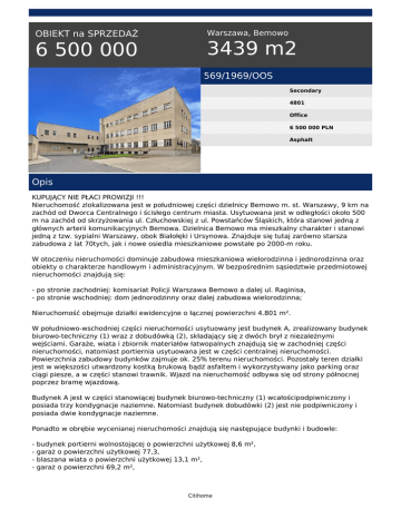 OBIEKT na SPRZEDAŻ 6 500 000 Warszawa, Bemowo 3439 m2 569/1969/OOS Secondary 4801 Office 6 500 000 PLN Asphalt Opis KUPUJĄCY NIE PŁACI PROWIZJI !!! Nieruchomość zlokalizowana jest w południowej części dzielnicy Bemowo m. st. Warszawy, 9 km na zachód od Dworca Centralnego i ścisłego centrum miasta. Usytuowana jest w odległości około 500 m na zachód od skrzyżowania ul. Człuchowskiej z ul. Powstańców Śląskich, która stanowi jedną z głównych arterii komunikacyjnych Bemowa. Dzielnica Bemowo ma mieszkalny charakter i stanowi jedną z tzw. sypialni Warszawy, obok Białołęki i Ursynowa. Znajduje się tutaj zarówno starsza zabudowa z lat 70tych, jak i nowe osiedla mieszkaniowe powstałe po 2000-m roku. W otoczeniu nieruchomości dominuje zabudowa mieszkaniowa wielorodzinna i jednorodzinna oraz obiekty o charakterze handlowym i administracyjnym. W bezpośrednim sąsiedztwie przedmiotowej nieruchomości znajdują się: - po stronie zachodniej: komisariat Policji Warszawa Bemowo a dalej ul. Raginisa, - po stronie wschodniej: dom jednorodzinny oraz dalej zabudowa wielorodzinna; Nieruchomość obejmuje działki ewidencyjne o łącznej powierzchni 4.801 m². W południowo-wschodniej części nieruchomości usytuowany jest budynek A, zrealizowany budynek biurowo-techniczny (1) wraz z dobudówką (2), składający się z dwóch brył z niezależnymi wejściami. Garaże, wiata i zbiornik materiałów łatwopalnych znajdują się w zachodniej części nieruchomości, natomiast portiernia usytuowana jest w części centralnej nieruchomości. Powierzchnia zabudowy budynków zajmuje ok. 25% terenu nieruchomości. Pozostały teren działki jest w większości utwardzony kostką brukową bądź asfaltem i wykorzystywany jako parking oraz ciągi piesze, a w części stanowi trawnik. Wjazd na nieruchomość odbywa się od strony północnej poprzez bramę wjazdową. Budynek A jest w części stanowiącej budynek biurowo-techniczny (1) wcałościpodpiwniczony i posiada trzy kondygnacje naziemne. Natomiast budynek dobudówki (2) jest nie podpiwniczony i posiada dwie kondygnacje naziemne. Ponadto w obrębie wycenianej nieruchomości znajdują się następujące budynki i budowle: - budynek portierni wolnostojącej o powierzchni użytkowej 8,6 m², garaż o powierzchni użytkowej 77,3, blaszana wiata o powierzchni użytkowej 13,1 m², garaż o powierzchni 69,2 m², Citihome - garaż o powierzchni 30,9 m², - zbiornik materiałów łatwopalnycho powierzchni 6,3 m². Budynek A posiada 3.234,4 m² powierzchni użytkowej i 3.267,7 m² powierzchni netto. Warunkiem sprzedaży jest ustanowienie ograniczonych praw rzeczowych służebności przesyłu dla infrastruktury położonej w budynku i gruncie: I wariant - 878,40 m², II wariant - 784,20 m². Teren przedmiotowej nieruchomości nie jest objęty miejscowym planem zagospodarowania przestrzennego. Zgodnie ze studium uwarunkowań i kierunków zagospodarowania przestrzennego miasta Warszawy - Uchwała nr LXXXII/2746/2006 z dnia 10 października 2006 r. z późniejszymi zmianami przedmiotowa działka znajduje się na obszarze o symbolu M1.20 – teren o przewadze zabudowy mieszkaniowej wielorodzinnej do wysokości 20 m. Polecam i zachęcam do oglądania. Kontakt: Marcin Zakrzewski Specjalista ds. sprzedaży Tel: 513-401-901 [email protected] Marcin Zakrzewski tel. 513-401-901 email: [email protected] Citihome Powered by TCPDF (www.tcpdf.org)