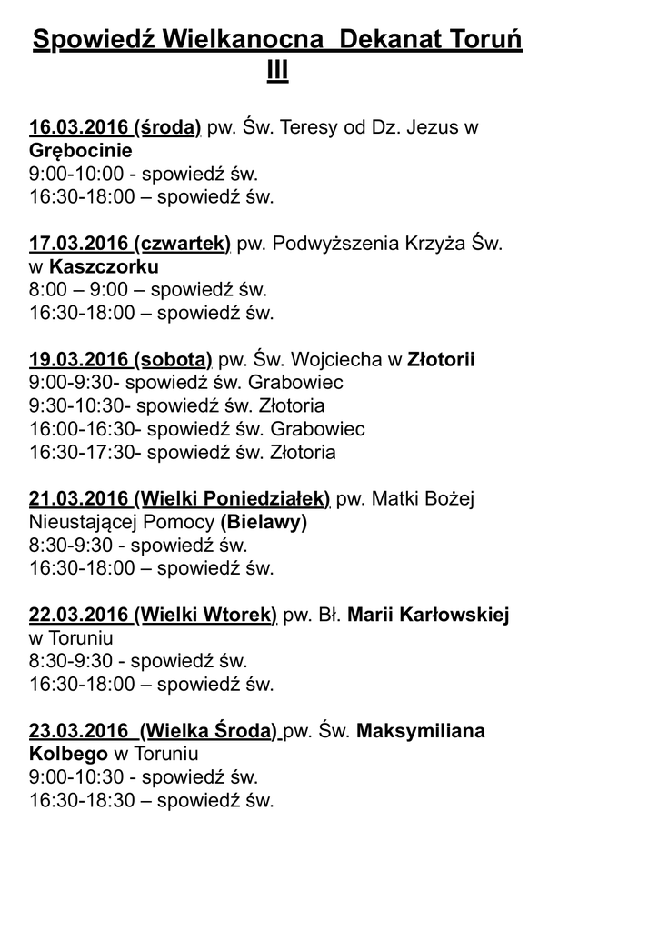 Spowiedź Wielkanocna Dekanat Toruń III 16.03.2016 (środa) pw. Św. Teresy od Dz. Jezus w Grębocinie 9:00-10:00 - spowiedź św. 16:30-18:00 – spowiedź św. 17.03.2016 (czwartek) pw. Podwyższenia Krzyża Św. w Kaszczorku 8:00 – 9:00 – spowiedź św. 16:30-18:00 – spowiedź św. 19.03.2016 (sobota) pw. Św. Wojciecha w Złotorii 9:00-9:30- spowiedź św. Grabowiec 9:30-10:30- spowiedź św. Złotoria 16:00-16:30- spowiedź św. Grabowiec 16:30-17:30- spowiedź św. Złotoria 21.03.2016 (Wielki Poniedziałek) pw. Matki Bożej Nieustającej Pomocy (Bielawy) 8:30-9:30 - spowiedź św. 16:30-18:00 – spowiedź św. 22.03.2016 (Wielki Wtorek) pw. Bł. Marii Karłowskiej w Toruniu 8:30-9:30 - spowiedź św. 16:30-18:00 – spowiedź św. 23.03.2016 (Wielka Środa) pw. Św. Maksymiliana Kolbego w Toruniu 9:00-10:30 - spowiedź św. 16:30-18:30 – spowiedź św.