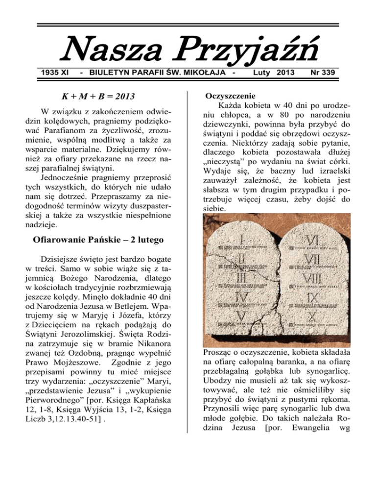 Nasza Przyjaźń 1935 XI - BIULETYN PARAFII ŚW. MIKOŁAJA - K + M + B = 2013 W związku z zakończeniem odwiedzin kolędowych, pragniemy podziękować Parafianom za życzliwość, zrozumienie, wspólną modlitwę a także za wsparcie materialne. Dziękujemy również za ofiary przekazane na rzecz naszej parafialnej świątyni. Jednocześnie pragniemy przeprosić tych wszystkich, do których nie udało nam się dotrzeć. Przepraszamy za niedogodność terminów wizyty duszpasterskiej a także za wszystkie niespełnione nadzieje. Luty 2013 Nr 339 Oczyszczenie Każda kobieta w 40 dni po urodzeniu chłopca, a w 80 po narodzeniu dziewczynki, powinna była przybyć do świątyni i poddać się obrzędowi oczyszczenia. Niektórzy zadają sobie pytanie, dlaczego kobieta pozostawała dłużej „nieczystą” po wydaniu na świat córki. Wydaje się, że baczny lud izraelski zauważył zależność, że kobieta jest słabsza w tym drugim przypadku i potrzebuje więcej czasu, żeby dojść do siebie. Ofiarowanie Pańskie – 2 lutego Dzisiejsze święto jest bardzo bogate w treści. Samo w sobie wiąże się z tajemnicą Bożego Narodzenia, dlatego w kościołach tradycyjnie rozbrzmiewają jeszcze kolędy. Minęło dokładnie 40 dni od Narodzenia Jezusa w Betlejem. Wpatrujemy się w Maryję i Józefa, którzy z Dziecięciem na rękach podążają do Świątyni Jerozolimskiej. Święta Rodzina zatrzymuje się w bramie Nikanora zwanej też Ozdobną, pragnąc wypełnić Prawo Mojżeszowe. Zgodnie z jego przepisami powinny tu mieć miejsce trzy wydarzenia: „oczyszczenie” Maryi, „przedstawienie Jezusa” i „wykupienie Pierworodnego” [por. Księga Kapłańska 12, 1-8, Księga Wyjścia 13, 1-2, Księga Liczb 3,12.13.40-51] . Prosząc o oczyszczenie, kobieta składała na ofiarę całopalną baranka, a na ofiarę przebłagalną gołąbka lub synogarlicę. Ubodzy nie musieli aż tak się wykosztowywać, ale też nie ośmieliliby się przybyć do świątyni z pustymi rękoma. Przynosili więc parę synogarlic lub dwa młode gołębie. Do takich należała Rodzina Jezusa [por. Ewangelia wg św. Łukasza 2,21-24]. Przyjąwszy ofiarę, kapłan udzielał błogosławieństwa i oczyszczał matkę skrapiając ją krwią przyniesionych zwierząt. Jak zauważa Benedykt XVI w wydanej pod koniec zeszłego roku trzeciej części Jezusa z Nazaretu, „Maryja nie potrzebuje oczyszczenia po urodzeniu Jezusa: narodzenie to przynosi oczyszczenie świata. Jest jednak posłuszna Prawu i właśnie w ten sposób służy spełnieniu się obietnic”. w Świątyni, na Jego całkowitą własność.” (Benedykt XVI, Jezus z Nazaretu, Dzieciństwo). W Świątyni ma jeszcze miejsce niecodzienna scena. Oto Święta Rodzina spotyka sędziwego Symeona i prorokinię Annę, którzy pod wpływem Ducha Świętego wyznają, że Jezus jest tak długo wyczekiwanym Mesjaszem. Z ust rozradowanego Symeona padają słowa: Przedstawienie Jezusa i wykupienie Pierworodnego Na kartach Starego Testamentu wielokrotnie pojawia się zapis, że wszystko, co pierworodne w Izraelu, począwszy od człowieka do bydlęcia, należy do Boga. Stąd też każdy pierworodny syn miał być oddany na służbę do świątyni na znak wdzięczności za ocalenie pierworodnych synów izraelskich podczas pierwszej Paschy przed wyjściem z Egiptu. Z czasem Bóg powołał do służby kapłańskiej pokolenie Lewiego. Odtąd można było wykupić pierworodnego za cenę pięciu syklów srebra, co w przybliżeniu równało się miesięcznej płacy robotnika niewykwalifikowanego. Egzegeci zgodnie podkreślają, że nie istniał żaden przepis nakazujący przynieść dziecko do świątyni. Przeciwnie: można było przekazać te pięć syklów jakiemukolwiek kapłanowi na terenie całego kraju. Tymczasem Maryja z Józefem udają się do Jerozolimy, żeby przedstawić Jezusa. Ewangelista natomiast milczy na temat wykupu. „Chce widocznie powiedzieć: to dziecko nie zostaje wykupione i nie zostaje zwrócone rodzicom, ale zupełnie przeciwnie: zostaje osobiście oddane Bogu „moje oczy ujrzały Twoje zbawienie, które przygotowałeś wszystkim narodom. Światłość dla oświecenia pogan i chwałę Izraela, Twego ludu”. W Polsce święto Ofiarowania Pańskiego nabrało charakteru maryjnego i jest zwane Świętem Matki Bożej Gromnicznej. Maryja jest czczona jako ta, która przyniosła światu Światłość. Obrzęd poświęcania świec, których płomień symbolizuje Jezusa, Światłość świata, rozpowszechnił się w całym Kościele w X wieku. Warto przypomnieć, że w tradycji polskiego ludu starano się za wszelką cenę donieść zapaloną świecę z kościoła 2 kiego zła. Modli się także o właściwe korzystanie z daru głosu. do domu, by od jej płomienia na nowo ”rozpalić” domowe ognisko, miłość i zgodę w rodzinie. Wypalano również na belce sufitowej lub odrzwiach znak krzyża, aby ochronić dom przed burzami i wszelkimi niebezpieczeństwami. W niedzielę 3 lutego święcenie jabłek po każdej Mszy św. dla tych, którzy o to poproszą a błogosławieństwo ze świecami po Mszy św. o godz. 13.00. W Święto Ofiarowania Pańskiego Msze św. zostaną odprawione w naszym kościele parafialnym o godz. 6.30, 7.15, 17.00 i 18.00. Błogosławieństwo ku czci św. Agaty 5 lutego Święta Agata (z gr. dobra) żyła w III wieku na Sycylii u stóp Etny, gdzie oddała swoje życie za wiarę. W rok po jej śmierci w czasie wybuchu wulkanu mieszkańcy Katanii wypraszali jej wstawiennictwa i zostali ocaleni. Od tego czasu św. Agata jest czczona jako patronka od pożaru i innych grożących niebezpieczeństw. W dzień jej wspomnienia od wieków święci się chleb, sól i wodę, które mają stać się pomocą od klęski ognia i innych przeciwności. Legenda głosi, że przed blisko czterystu laty również nasze miasto zostało uratowane za przyczyną św. Agaty. Kiedy wybuchł groźny pożar niedaleko Bramy Grodzkiej, pewna żebraczka miała rzucić w pło