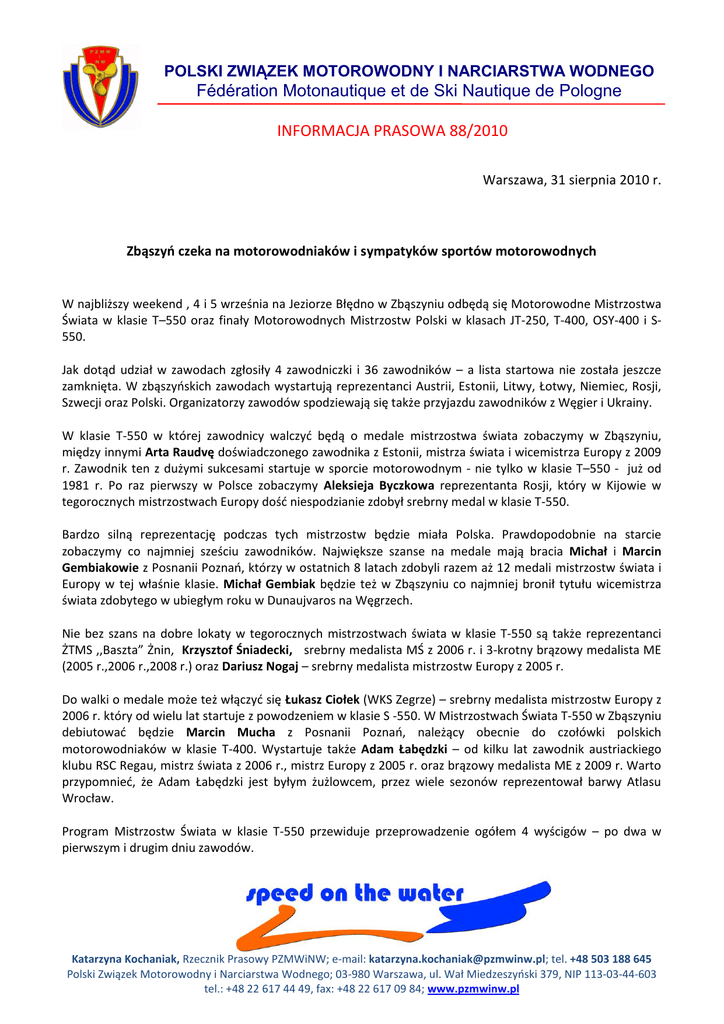 POLSKI ZWIĄZEK MOTOROWODNY I NARCIARSTWA WODNEGO Fédération Motonautique et de Ski Nautique de Pologne INFORMACJA PRASOWA 88/2010 Warszawa, 31 sierpnia 2010 r. Zbąszyo czeka na motorowodniaków i sympatyków sportów motorowodnych W najbliższy weekend , 4 i 5 września na Jeziorze Błędno w Zbąszyniu odbędą się Motorowodne Mistrzostwa Świata w klasie T–550 oraz finały Motorowodnych Mistrzostw Polski w klasach JT-250, T-400, OSY-400 i S550. Jak dotąd udział w zawodach zgłosiły 4 zawodniczki i 36 zawodników – a lista startowa nie została jeszcze zamknięta. W zbąszyoskich zawodach wystartują reprezentanci Austrii, Estonii, Litwy, Łotwy, Niemiec, Rosji, Szwecji oraz Polski. Organizatorzy zawodów spodziewają się także przyjazdu zawodników z Węgier i Ukrainy. W klasie T-550 w której zawodnicy walczyd będą o medale mistrzostwa świata zobaczymy w Zbąszyniu, między innymi Arta Raudvę doświadczonego zawodnika z Estonii, mistrza świata i wicemistrza Europy z 2009 r. Zawodnik ten z dużymi sukcesami startuje w sporcie motorowodnym - nie tylko w klasie T–550 - już od 1981 r. Po raz pierwszy w Polsce zobaczymy Aleksieja Byczkowa reprezentanta Rosji, który w Kijowie w tegorocznych mistrzostwach Europy dośd niespodzianie zdobył srebrny medal w klasie T-550. Bardzo silną reprezentację podczas tych mistrzostw będzie miała Polska. Prawdopodobnie na starcie zobaczymy co najmniej sześciu zawodników. Największe szanse na medale mają bracia Michał i Marcin Gembiakowie z Posnanii Poznao, którzy w ostatnich 8 latach zdobyli razem aż 12 medali mistrzostw świata i Europy w tej właśnie klasie. Michał Gembiak będzie też w Zbąszyniu co najmniej bronił tytułu wicemistrza świata zdobytego w ubiegłym roku w Dunaujvaros na Węgrzech. Nie bez szans na dobre lokaty w tegorocznych mistrzostwach świata w klasie T-550 są także reprezentanci ŻTMS ,,Baszta” Żnin, Krzysztof Śniadecki, srebrny medalista MŚ z 2006 r. i 3-krotny brązowy medalista ME (2005 r.,2006 r.,2008 r.) oraz Dariusz Nogaj – srebrny medalista mistrzostw Europy z 2005 r. Do walki o medale może też włączyd się Łukasz Ciołek (WKS Zegrze) – srebrny medalista mistrzostw Europy z 2006 r. który od wielu lat startuje z powodzeniem w klasie S -550. W Mistrzostwach Świata T-550 w Zbąszyniu debiutowad będzie Marcin Mucha z Posnanii Poznao, należący obecnie do czołówki polskich motorowodniaków w klasie T-400. Wystartuje także Adam Łabędzki – od kilku lat zawodnik austriackiego klubu RSC Regau, mistrz świata z 2006 r., mistrz Europy z 2005 r. oraz brązowy medalista ME z 2009 r. Warto przypomnied, że Adam Łabędzki jest byłym żużlowcem, przez wiele sezonów reprezentował barwy Atlasu Wrocław. Program Mistrzostw Świata w klasie T-550 przewiduje przeprowadzenie ogółem 4 wyścigów – po dwa w pierwszym i drugim dniu zawodów. Katarzyna Kochaniak, Rzecznik Prasowy PZMWiNW; e-mail: [email protected]; tel. +48 503 188 645 Polski Związek Motorowodny i Narciarstwa Wodnego; 03-980 Warszawa, ul. Wał Miedzeszyoski 379, NIP 113-03-44-603 tel.: +48 22 617 44 49, fax: +48 22 617 09 84; www.pzmwinw.pl POLSKI ZWIĄZEK MOTOROWODNY I NARCIARSTWA WODNEGO Fédération Motonautique et de Ski Nautique de Pologne INFORMACJA PRASOWA 88/2010 Równie ciekawie zapowiadają się finały Motorowodnych Mistrzostw Polski 2010. Po eliminacjach przeprowadzonych zgodnie z terminarzem Polskiego Związku Motorowodnego i Narciarstwa Wodnego - w Szczecinie, Myśliborzu, Żninie i Śremie, zawody w Zbąszyniu decydowad będą w większości klas o ostatecznej kolejności i o kolorach medali tegorocznych MP. Dotyczy to głównie klasy S-550 i T-400 oraz OSY–400 w których różnice punktowe między czołowymi zawodnikami przed finałową eliminacją w Zbąszyniu nie są duże. Finały Motorowodnych Mistrzostw Polski w Zbąszyniu składad się będą z trzech wyścigów w każdej klasie. Organizatorem zbąszyoskich zawodów motorowodnych – z upoważnienia Międzynarodowej Federacji Motorowodnej oraz Polskiego Związku Motorowodnego i Narciarstwa Wodnego w Warszawie jest gmina Zbąszyn, Starostwo Powiatowe w Nowym Tomyślu, Zbąszyoskie Centrum Sportu, Turystyki i Rekreacji, Zbąszyoskie Centrum Kultury, WOPR Zbąszyo i KS Posnania Poznao przy współpracy z Urzędem Marszałkowskim Województwa Wielkopolskiego. Wstęp na plażę miejską ,,Łazienki” w Zbąszyniu nad Jezioro Błędno – skąd będzie można najlepiej obserwowad przebieg Motorowodnych Mistrzostw Świata w kl. T-550 i finałów Motorowodnych Mistrzostw Polski w klasach JT –250, T - 400, OSY – 400 oraz S - 550 i gdzie odbywad się będą imprezy towarzyszące będzie bezpłatny. Katarzyna Kochaniak, Rzecznik Prasowy PZMWiNW; e-mail: [email protected]; tel. +48 503 188 645 Polski Związek Motorowodny i Narciarstwa Wodnego; 03-980 Warszawa, ul. Wał Miedzeszyoski 379, NIP 113-03-44-603 tel.: +48 22 617 44 49, fax: +48 22 617 09 84; www.pzmwinw.pl