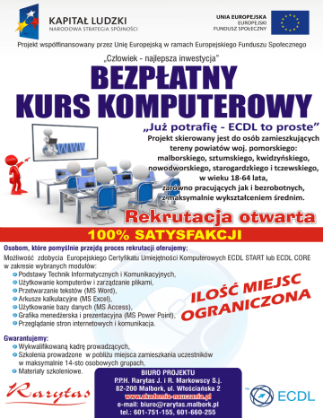 Projekt współfinansowany przez Unię Europejską w ramach Europejskiego Funduszu Społecznego „Człowiek - najlepsza inwestycja” BEZPŁATNY KURS KOMPUTEROWY „Już potrafię - ECDL to proste” Projekt skierowany jest do osób zamieszkujących tereny powiatów woj. pomorskiego: malborskiego, sztumskiego, kwidzyńskiego, nowodworskiego, starogardzkiego i tczewskiego, w wieku 18-64 lata, zarówno pracujących jak i bezrobotnych, z maksymalnie wykształceniem średnim. Rekrutacja otwarta 100% SATYSFAKCJI Osobom, które pomyślnie przejdą proces rekrutacji oferujemy: Możliwość zdobycia Europejskiego Certyfikatu Umiejętności Komputerowych ECDL START lub ECDL CORE w zakresie wybranych modułów: Podstawy Technik Informatycznych i Komunikacyjnych, Użytkowanie komputerów i zarządzanie plikami, Przetwarzanie tekstów (MS Word), Arkusze kalkulacyjne (MS Excel), Użytkowanie bazy danych (MS Access), Grafika menedżerska i prezentacyjna (MS Power Point), Przeglądanie stron internetowych i komunikacja. C S J E I M Æ Œ A O N IL O Z C I N A R OG Gwarantujemy: Wykwalifikowaną kadrę prowadzących, Szkolenia prowadzone w pobliżu miejsca zamieszkania uczestników w maksymalnie 14-sto osobowych grupach, Materiały szkoleniowe. BIURO PROJEKTU P.P.H. Rarytas J. i R. Markowscy S.j. 82-200 Malbork, ul. Włościańska 2 www.akademia-nauczania.pl e-mail: [email protected] tel.: 601-751-155, 601-660-255