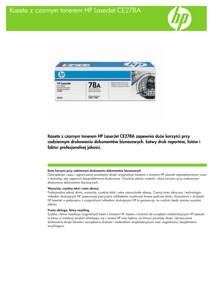 Kaseta z czarnym tonerem HP LaserJet CE278A Kaseta z czarnym tonerem HP LaserJet CE278A zapewnia duże korzyści przy codziennym drukowaniu dokumentów biznesowych. Łatwy druk raportów, listów i faktur profesjonalnej jakości. Duże korzyści przy codziennym drukowaniu dokumentów biznesowych Oszczędność czasu i ograniczenie przestojów dzięki oryginalnym kasetom z tonerem HP LaserJet zaprojektowanym wraz z drukarką, aby zapewnić bezproblemowe drukowanie. Wysokiej jakości wydruki i duże korzyści przy codziennym drukowaniu dokumentów biznesowych. Wyrazisty, czytelny tekst i ostre obrazy Profesjonalna jakość druku, wyrazisty, czytelny tekst i ostre czarno-białe obrazy. Czarny toner sferyczny i technologia wkładów drukujących HP zapewniają precyzyjne nakładanie cząsteczek tonera podczas druku. Korzystanie z drukarek HP LaserJet w połączeniu z oryginalnymi wkładami drukującymi HP to gwarancja, że wydruki będą zawsze wysokiej jakości. Prosta obsługa, łatwy recykling Szybka i łatwa instalacja oryginalnych kaset z tonerem HP. Kaseta z tonerem do urządzeń wielofunkcyjnych HP LaserJet to łatwy w instalacji produkt składający się z tonera HP oraz bębna, na którym powstaje obraz. Uproszczenie drukowania dzięki łatwemu zarządzaniu drukiem i materiałami eksploatacyjnymi oraz wygodnemu, bezpłatnemu recyklingowi. Kaseta z czarnym tonerem HP LaserJet CE278A Dane techniczne produktu P/N Opis Kod UPC Wymiary (dł x szer x gł) Waga Średnia wydajność kasety z tonerem CE278A Kaseta z czarnym tonerem HP LaserJet CE278A 884420588702 375 x 113 x 125 mm Średnia wydajność kasety: 2100 str. standardowych. Deklarowana wydajność zgodna z normą ISO/IEC 19752. 0,79 kg *Rzeczywista wydajność może się znacznie różnić zależnie od drukowanych obrazów i innych czynników. Więcej informacji można znaleźć pod adresem http://www.hp.com/go/learnaboutsupplies. © Copyright 2010 Hewlett-Packard Development Company, L.P. Informacje zawarte w tym dokumencie mogą bez uprzedzenia ulec zmianie. Jedyne gwarancje, jakich HP udziela na produkty i usługi, są określone w oświadczeniach gwarancyjnych dostarczanych wraz z takimi produktami i usługami. Żaden zapis niniejszego dokumentu nie może być uważany za dodatkową gwarancję. HP nie ponosi odpowiedzialności za błędy techniczne lub redakcyjne oraz braki występujące w niniejszym dokumencie. Aby uzyskać więcej informacji na temat materiałów konsumpcyjnych HP, odwiedź http://www.hp.com Publikacja na region EMEA 02/10 4AA0-1860 PLE