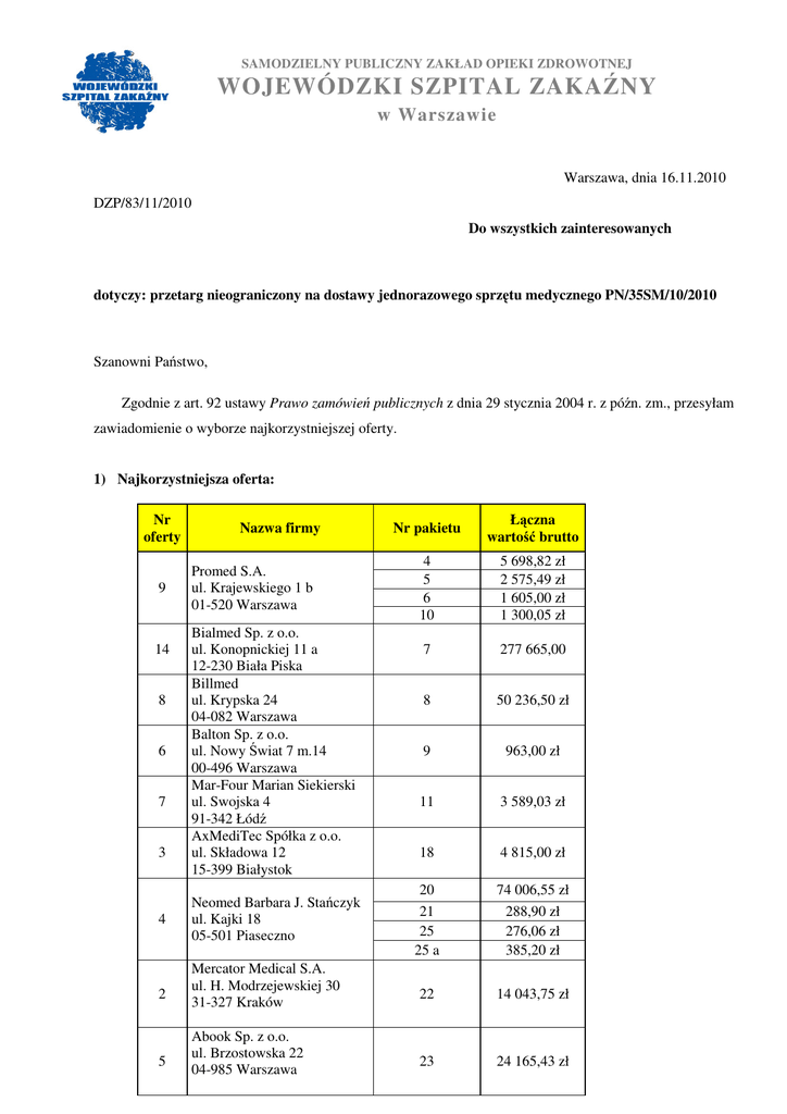 SAMODZIELNY PUBLICZNY ZAKŁAD OPIEKI ZDROWOTNEJ WOJEWÓDZKI SZPITAL ZAKAŹNY w Warszawie Warszawa, dnia 16.11.2010 DZP/83/11/2010 Do wszystkich zainteresowanych dotyczy: przetarg nieograniczony na dostawy jednorazowego sprzętu medycznego PN/35SM/10/2010 Szanowni Państwo, Zgodnie z art. 92 ustawy Prawo zamówień publicznych z dnia 29 stycznia 2004 r. z późn. zm., przesyłam zawiadomienie o wyborze najkorzystniejszej oferty. 1) Najkorzystniejsza oferta: Nr oferty 9 14 8 6 7 3 4 2 5 Nazwa firmy Promed S.A. ul. Krajewskiego 1 b 01-520 Warszawa Bialmed Sp. z o.o. ul. Konopnickiej 11 a 12-230 Biała Piska Billmed ul. Krypska 24 04-082 Warszawa Balton Sp. z o.o. ul. Nowy Świat 7 m.14 00-496 Warszawa Mar-Four Marian Siekierski ul. Swojska 4 91-342 Łódź AxMediTec Spółka z o.o. ul. Składowa 12 15-399 Białystok Neomed Barbara J. Stańczyk ul. Kajki 18 05-501 Piaseczno Mercator Medical S.A. ul. H. Modrzejewskiej 30 31-327 Kraków Abook Sp. z o.o. ul. Brzostowska 22 04-985 Warszawa Nr pakietu Łączna wartość brutto 4 5 6 10 5 698,82 zł 2 575,49 zł 1 605,00 zł 1 300,05 zł 7 277 665,00 8 50 236,50 zł 9 963,00 zł 11 3 589,03 zł 18 4 815,00 zł 20 21 25 25 a 74 006,55 zł 288,90 zł 276,06 zł 385,20 zł 22 14 043,75 zł 23 24 165,43 zł 11 Trident Med. S.C. ul. Nowy Świat 60/13 00-357 Warszawa 24 7 752,15 zł Uzasadnienie wyboru: najniŜsza cena. 2) W toku analizy i badania ofert wykluczono następujące firmy: a) Neomed Barbara J. Stańczyk, ul. Kajki 18, 05-501 Piaseczno w zakresie pakietu nr 2, gdyŜ nie złoŜyła próbek w ilościach wymaganych w załączniku nr 5 „Wymagania bezwzględne” - art. 24 ust. 2 pkt. 4 ustawy Prawo zamówień publicznych z dnia 29 stycznia 2004 roku z poźn. zm. b) Beryl Med. Ltd. 72 New Bond Street, Mayfair, London W1S 1RR, UK w zakresie pakietu nr 20, gdyŜ nie złoŜyła próbek w ilościach wymaganych w załączniku nr 5 „Wymagania bezwzględne ” - art. 24 ust. 2 pkt. 4 ustawy Prawo zamówień publicznych z dnia 29 stycznia 2004 roku z poźn. zm. 3) W toku analizy i badania ofert odrzucono następujące oferty: a) AxMediTec Spółka z o.o., ul. Składowa 12, 15-399 Białystok w zakresie pakietów 21, 24 – jej treść nie odpowiada treści specyfikacji istotnych warunków zamówienia. W pakiecie 21 - maska tlenowa dla dzieci wykonana jest z bardzo sztywnego materiału. W pakiecie 24 – w jednorazowym układzie oddechowym brak kapturka zabezpieczającego układ (art. 89 ust. 1 pkt 2 ustawy Prawo zamówień publicznych z dnia 29 stycznia 2004 roku z późn. zm.); b) Neomed Barbara J. Stańczyk, ul. Kajki 18, 05-501 Piaseczno w zakresie pakietów nr 1, 12 – jej treść nie odpowiada treści specyfikacji istotnych warunków zamówienia. W pakiecie nr 1 poz. 2 - Ŝel do EKG wypływa spod elektrod, spływa po skórze. W pakiecie nr 12 – słoje do dobowej zbiórki moczu słabo widoczna jest podziałka umoŜliwiająca odczytywanie poziomu moczu (art. 89 ust. 1 pkt 2 ustawy Prawo zamówień publicznych z dnia 29 stycznia 2004 roku z późn. zm.) w zakresie pakietu nr 2, gdyŜ ofertę Wykonawcy wykluczonego uznaje się za odrzuconą - art. 24 ust. 4 ustawy Prawo zamówień publicznych z dnia 29 stycznia 2004 roku z poźn. zm. c) Balton Sp. z o.o., ul. Nowy Świat 7 m 14, 00-496 Warszawa w zakresie pakietu nr 2 - jej treść nie odpowiada treści specyfikacji istotnych warunków zamówienia. W pakiecie nr 2 zgłębniki nie posiadają zamkniętego końca (art. 89 ust. 1 pkt 2 ustawy Prawo zamówień publicznych z dnia 29 stycznia 2004 roku z późn. zm.). d) Skamex Spółka z ograniczoną odpowiedzialnością Sp.k., ul. Częstochowska 38/52 w zakresie pakietu nr 3 - jej treść nie odpowiada treści specyfikacji istotnych warunków zamówienia. W pakiecie nr 3 kaniula pobierająca ma długość poniŜej 3 cm (art. 89 ust. 1 pkt 2 ustawy Prawo zamówień publicznych z dnia 29 stycznia 2004 roku z późn. zm.) e) Centrum Zaopatrzenia Medycznego Cezal S.A Wrocław, ul. Widna 4, 50-453 Wrocław w zakresie pakietów 1, 2, 12, 13 - jej treść nie odpowiada treści specyfikacji istotnych warunków zamówienia. W pakiecie nr 1 poz. 2 Ŝel do EKG wycieka spod elektrod, poz. 1 Ŝel do USG rozlewa się spod sondy do USG. W pakiecie nr 2 poz. 1-3 zgłębniki Ŝołądkowe mają 4 otwory, poz. 4 –zgłębniki dwunastnicze nie posiadają zatyczki do zamknięcia końcówki. W pakiecie nr 12 – słoje do dobowej zbiórki moczu słabo widoczna jest podziałka umoŜliwiająca odczytywanie poziomu moczu. W pakiecie nr 13 brakuje osobnego pojemnika na próbkę moczu (art. 89 ust. 1 pkt 2 ustawy Prawo zamówień publicznych z dnia 29 stycznia 2004 roku z późn. zm.). f) Horn Wellness Group, ul. śonkilowa 11, 60-175 Poznań w zakresie pakietu nr 15 – jej treść nie odpowiada treści specyfikacji istotnych warunków zamówienia. W pakiecie nr 15 – jednorazowe ustniki do spirometru posiadają za małą średnicę wewnętrzną ustnika (art. 89 ust. 1 pkt 2 ustawy Prawo zamówień publicznych z dnia 29 stycznia 2004 roku z późn. zm.). g) Vygon Polska Sp. zo.o., ul. Francuska 39/6,03-905 Warszawa w zakresie pakietu nr 3 - jej treść nie odpowiada treści specyfikacji istotnych warunków zamówienia. W pakiecie nr 3 kaniula pobierająca ma długość poniŜej 3 cm (art. 89 ust. 1 pkt 2 ustawy Prawo zamówień publicznych z dnia 29 stycznia 2004 roku z późn. zm.) h) Beryl Med. Ltd. 72 New Bond Street, Mayfair, London W1S 1RR, UK w zakresie pakietu nr 20, gdyŜ ofertę Wykonawcy wykluczonego uznaje się za odrzuconą - art. 24 ust. 4 ustawy Prawo zamówień publicznych z dnia 29 stycznia 2004 roku z poźn. zm. 4) Postępowanie o udzielenie zamówienia w zakresie: a) pakietu nr 1,2,3,12,13,15,16,17,19 zostało uniewaŜnione, gdyŜ nie złoŜono Ŝadnej oferty nie podlegającej odrzuceniu (art. 93 ust. 1 pkt. 1 ustawy Prawo zamówień publicznych z dnia 29 stycznia 2004 roku z późn. zm.); b) pakietu nr 14 zostało uniewaŜnione, gdyŜ cena najkorzystniejszej