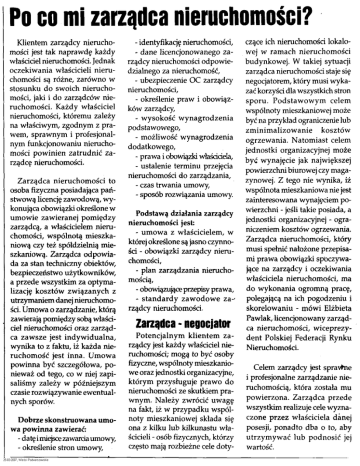Po co mi zarządca nieruchomości? Klientem zarządcy nieruchomości jest tak naprawdę każdy właściciel nieruchomości. Jednak oczekiwania właścicieli nieruchomości są różne, zarówno w stosunku do swoich nieruchomości, jaki i do zarządców nieruchomości. Każdy właściciel nieruchomości, któremu zależy na właściwym, zgodnym z prawem, sprawnym i profesjonalnym funkcjonowaniu nieruchomości powinien zatrudnić zarządcę nieruchomości. Zarządca nieruchomości to osoba fizyczna posiadająca państwową licencję zawodową, wykonująca obowiązki określone w umowie zawieranej pomiędzy zarządcą, a właścicielem nieruchomości, wspólnotą mieszkaniową czy też spółdzielnią mieszkaniową. Zarządca odpowiada za stan techniczny obiektów, bezpieczeństwo użytkowników, a przede wszystkim za optymalizację kosztów związanych z utrzymaniem danej nieruchomości. Umowa o zarządzanie, którą zawierają pomiędzy sobą właściciel nieruchomości oraz zarządca zawsze jest indywidualna, wynika to z faktu, iż każda nieruchomość jest inna. Umowa powinna być szczegółowa, ponieważ od tego, co w niej zapisaliśmy zależy w późniejszym czasie rozwiązywanie ewentualnych sporów. Dobrze skonstruowana umowa powinna zawierać: - datę i miejsce zawarcia umowy, - określenie stron umowy, - identyfikację nieruchomości, - dane licencjonowanego zarządcy nieruchomości odpowiedzialnego za nieruchomość, - ubezpieczenie OC zarządcy nieruchomości, - określenie praw i obowiązków zarządcy, - wysokość wynagrodzenia podstawowego, - możliwość wynagrodzenia dodatkowego, - prawa i obowiązki właściciela, - ustalenie terminu przejęcia nieruchomości do zarządzania, - czas trwania umowy, - sposób rozwiązania umowy. Podstawą działania zarządcy nieruchomości jest: - umowa z właścicielem, w której określone są jasno czynności - obowiązki zarządcy nieruchomości, - plan zarządzania nieruchomością, - obowiązujące przepisy prawa, - standardy zawodowe za-' rządcy nieruchomości. Zarządca - negocjator Potencjalnym klientem zarządcy jest każdy właściciel nieruchomości; mogą to być osoby fizyczne, wspólnoty mieszkaniowe oraz jednostki organizacyjne, którym przysługuje prawo do nieruchomości ze skutkiem prawnym. Należy zwrócić uwagę na fakt, iż w przypadku wspólnoty mieszkaniowej składa się ona z kilku lub kilkunastu właścicieli - osób fizycznych, którzy często mają rozbieżne cele doty- czące ich nieruchomości lokalowej w ramach nieruchomości budynkowej. W takiej sytuacji zarządca nieruchomości staje się negocjatorem, który musi wykazać korzyści dla wszystkich stron sporu. Podstawowym celem wspólnoty mieszkaniowej może być na przykład ograniczenie lub zminimalizowanie kosztów ogrzewania. Natomiast celem jednostki organizacyjnej może być wynajęcie jak największej powierzchni biurowej czy magazynowej. Z tego nie wynika, iż wspólnota mieszkaniowa nie jest zainteresowana wynajęciem powierzchni - jeśli takie posiada, a jednostki organizacyjnej - ograniczeniem kosztów ogrzewania. Zarządca nieruchomości, który musi spełnić nałożone przepisami prawa obowiązki spoczywające na zarządcy i oczekiwania właściciela nieruchomości, ma do wykonania ogromną pracę, polegającą na ich pogodzeniu i skorelowaniu - mówi Elżbieta Pawlak, licencjonowany zarządca nieruchomości, wiceprezydent Polskiej Federacji Rynku Nieruchomości. Celem zarządcy jest sprav>ne i profesjonalne zarządzanie nieruchomością, która została mu powierzona. Zarządca przede wszystkim realizuje cele wyznaczone przez właściciela danej posesji, ponadto dba o to, aby utrzymywać lub podnosić jej wartość.