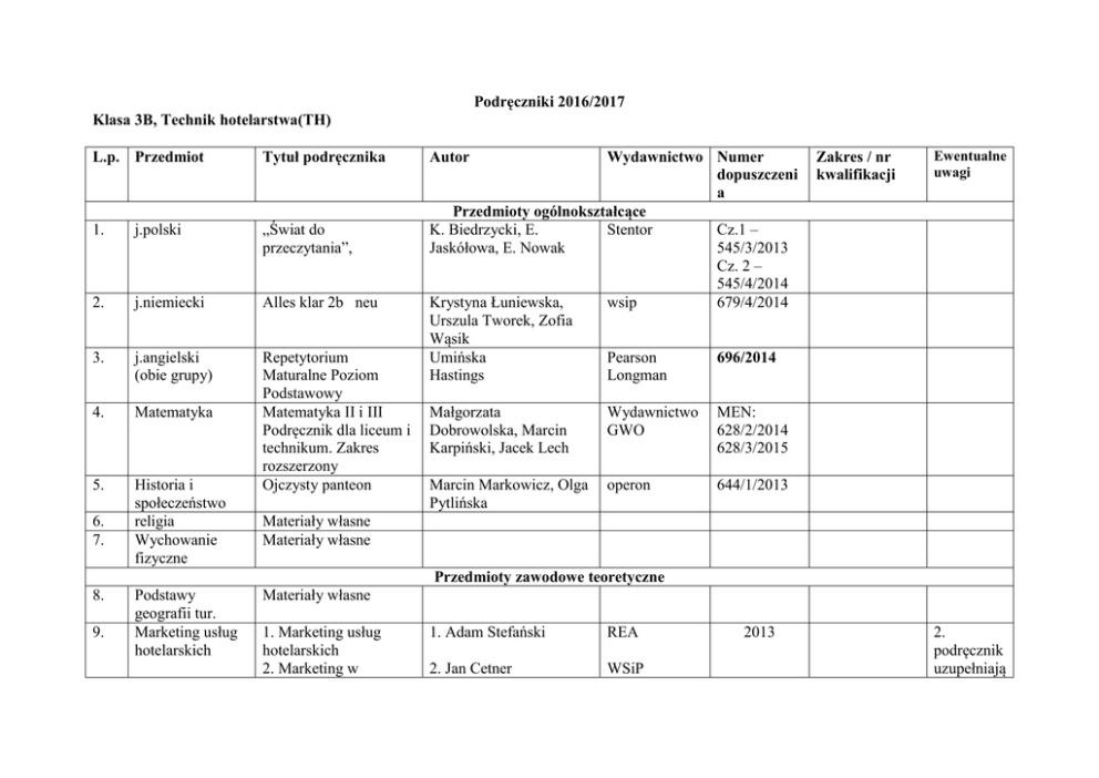 Podręczniki 2016/2017 Klasa 3B, Technik hotelarstwa(TH) L.p. Przedmiot Tytuł podręcznika 1. j.polski „Świat do przeczytania”, 2. j.niemiecki Alles klar 2b neu 3. j.angielski (obie grupy) 4. Matematyka 5. Historia i społeczeństwo religia Wychowanie fizyczne Repetytorium Maturalne Poziom Podstawowy Matematyka II i III Podręcznik dla liceum i technikum. Zakres rozszerzony Ojczysty panteon 6. 7. Autor Wydawnictwo Numer dopuszczeni a Przedmioty ogólnokształcące K. Biedrzycki, E. Stentor Cz.1 – Jaskółowa, E. Nowak 545/3/2013 Cz. 2 – 545/4/2014 Krystyna Łuniewska, wsip 679/4/2014 Urszula Tworek, Zofia Wąsik Umińska Pearson 696/2014 Hastings Longman Małgorzata Dobrowolska, Marcin Karpiński, Jacek Lech Wydawnictwo GWO MEN: 628/2/2014 628/3/2015 Marcin Markowicz, Olga Pytlińska operon 644/1/2013 Zakres / nr kwalifikacji Ewentualne uwagi Materiały własne Materiały własne Przedmioty zawodowe teoretyczne 8. 9. Podstawy geografii tur. Marketing usług hotelarskich Materiały własne 1. Marketing usług hotelarskich 2. Marketing w 1. Adam Stefański REA 2. Jan Cetner WSiP 2013 2. podręcznik uzupełniają 10. 11. 12 13. 14. Podstawy działalności przedsiębiorstwa hotelarskiego Usługi żywieniowe w hotelarstwie hotelarstwie Materiały własne Usługi żywieniowe w hotelarstwie Obsługa informatyczna w hotelarstwie Organizacja pracy w hotelarstwie "OBSŁUGA INFORMATYCZNA W HOTELARSTWIE Organizacja pracy w hotelarstwie Podręcznik część 2 Obsługa konsumenta Obsługa konsumentzeszyt ćwiczeń Obsługiwanie gości cz.2 – zeszyt ćwiczeń 15. 16. 17. Usługi żywieniowe w hotelarstwie Język angielski w hotelarstwie Techniki pracy w hotelarstwie Usługi żywieniowe w hotelarstwie cy Joanna Duda, Sebastian Krzywda Rea Przedmioty zawodowe praktyczne Mariola Milewska, Andrzej Stasiak Barbara Cymańska Garbowska Danuta Witrykus Grzegorz Wolak Joanna Duda Sebastian Krzywda Wsip rea T.12 wsip T.12 T.9 Podręcznik uzupełniający Danuta Ławniczak Renata Szajna Joanna Duda Sebastian Krzywda wsip T.12 Wsip Rea T.12 Materiały własne 1.Techniki pracy w hotelarstwie Zeszyt ćwiczeń część 2 2. Obsługa gości w obiekcie świadczącym 1.Aleksandra Lewandowska 2. Marek Halama usługi hotelarskie Zbiór zadań 18 j.rosyjski 19. Podstawy technologii gastronomicznej z zasadami żywienia Podrecznik do nauki j.rosyjskiego dla szkół ponadgimnazjalnych Materiały własne Przedmioty dodatkowe Mirosław Zybert wsip 684/2/2014