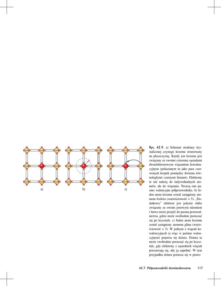 Rys. 42.9. a) Schemat struktury krystalicznej czystego krzemu zrzutowany na płaszczyznę. Każdy jon krzemu jest związany ze swoimi czterema sąsiadami dwuelektronowym wiązaniem kowalencyjnym (pokazanym tu jako para czerwonych kropek pomiędzy dwiema równoległymi czarnymi liniami). Elektrony te nie należą do indywidualnych atomów, ale do wiązania. Tworzą one pasmo walencyjne półprzewodnika. b) Jeden atom krzemu został zastąpiony atomem fosforu (wartościowość = 5). „Dodatkowy” elektron jest jedynie słabo związany ze swoim jonowym rdzeniem i łatwo może przejść do pasma przewodnictwa, gdzie może swobodnie poruszać się po krysztale. c) Jeden atom krzemu został zastąpiony atomem glinu (wartościowość = 3). W jednym z wiązań kowalencyjnych (a więc w paśmie walencyjnym) pojawia się dziura. Dziura ta może swobodnie poruszać się po krysztale, gdy elektrony z sąsiednich wiązań przesuwają się, aby ją zapełnić. W tym przypadku dziura porusza się w prawo 42.7. Półprzewodniki domieszkowane 117