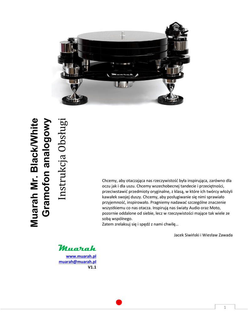 Instrukcja Obsługi Muarah Mr. Black/White Gramofon analogowy Chcemy, aby otaczająca nas rzeczywistość była inspirująca, zarówno dla oczu jak i dla uszu. Chcemy wszechobecnej tandecie i przeciętności, przeciwstawić przedmioty oryginalne, z klasą, w które ich twórcy włożyli kawałek swojej duszy. Chcemy, aby posługiwanie się nimi sprawiało przyjemność, inspirowało. Pragniemy nadawać szczególne znaczenie wszystkiemu co nas otacza. Inspirują nas światy Audio oraz Moto, pozornie oddalone od siebie, lecz w rzeczywistości mające tak wiele ze sobą wspólnego. Zatem zrelaksuj się i spędź z nami chwilę… Jacek Siwiński i Wiesław Zawada Muarah www.muarah.pl [email protected] V1.1 1 Muarah MUARAH MR. BLACK/WHITE GRAMOFON ANALOGOWY INSTRUKCJA OBSŁUGI Muarah Mr. Black / White – gramofon analogowy Wyjątkowa konstrukcja gramofonu marki Muarah gwarantuje odtwarzanie płyt analogowych z najwyższą jakością. Natomiast jego nowoczesne wzornictwo powinno zadowolić nawet najbardziej wymagających koneserów sprzętu klasy Hi-End, to prawdziwa ozdoba salonów. Konstrukcja gramofonu marki Muarah sprawia, że łączy on w sobie zalety gramofonów o dużej masie (mocny, kontrolowany bas, wysoka stabilność obrotów) oraz konstrukcji z tłumiącym zawieszeniem (dobre tłumienie drgań pochodzących z otoczenia, brak efektu sprzężenia zwrotnego przy wysokich poziomach głośności). Unikalnym rozwiązaniem w naszym gramofonie jest zastosowanie olejowego tłumika o wysokiej efektywności, stabilizującego ciężki talerz wraz z ramieniem. Gramofon współpracuje z najbardziej popularnymi na rynku ramionami 9-calowymi. Występuje w dwóch odmianach kolorystycznych: czarnej (Mr. Black) oraz białej (Mr. White). Rysunek 1: Opis i nazewnictwo elementów gramofonu. 2 Muarah MUARAH MR. BLACK/WHITE GRAMOFON ANALOGOWY INSTRUKCJA OBSŁUGI Cechy gramofonu Mr. Black/White Ciężka konstrukcja z talerzem o masie ok. 8 kg, zapewnia dobrą kontrolę basu, niskie zniekształcenia i wysoką stabilność obrotów. Sprężyste zawieszenie z unikalnym tłumikiem olejowym. Akrylowa podstawa gramofonu w układzie „sandwitch” - dodatkowa izolacja od drgań silnika i otoczenia. Silnik synchroniczny wysokiej klasy. Popularne prędkości obrotowe talerza: 33 1/3 lub 45 obr/min, zmiana poprzez przełożenia paska. Podwójny system poziomowania: poziomowanie talerza względem podstawy gramofonu (kompensacja masy ramienia) oraz niezależne poziomowanie całego gramofonu względem podłoża. Precyzyjne poziomowanie względem podłoża przy użyciu dwóch wygodnych pokręteł. Zaawansowane łożysko ślizgowe dostosowane do wysokich obciążeń: magnetyczne z ceramiczną kulką, teflonowym osadzeniem i powierzchniami ślizgowymi. Łożysko może działać długo i bezawaryjnie bez konieczności smarowania. Możliwość smarowania łożyska bez konieczności zdejmowania talerza, co dodatkowo poprawia działanie łożyska i zwiększa jego trwałość. System start/stop bez przełącznika z ruchomymi częściami, sterowany dotykiem dłoni. Sygnalizacja działania napędu – podświetlenie logo „Muarah”. Możliwość włączenia funkcji auto-stop – napęd wyłącza się automatycznie po czasie 60 minut. Możliwość łatwej korekty odległości płyty montażowej (a co za tym idzie osi obrotu ramienia) od osi łożyska gramofonu w zakresie +/- 5mm, zapewnia doskonałą współpracę z wieloma ramionami o efektywnej długości ok. 9 cali. Szeroki wybór ramion tego typu daje ogromne możliwości eksperymentowania z wkładkami i brzemieniem całego systemu audio. 3 Muarah MUARAH MR. BLACK/WHITE GRAMOFON ANALOGOWY INSTRUKCJA OBSŁUGI Dobór ramion gramofonowych Standardowo gramofon oferowany jest bez ramienia i bez wkładki gramofonowej. Wymienna płyta montażowa ramienia w przypadku gramofonu Muarah powoduje, że praktycznie jedynym ograniczeniem w doborze ramion jest jego efektywna długość – powinna wynosić ok. 9 cali. W standardowej konfiguracji gramofon dostarczany jest z płytą do montażu ramion typu Rega i Jelco. Na życzenie klienta oferujemy bezpłatne dopasowanie płyty montażowej do wybranego ramienia. Zalecamy stosowanie ramion takich producentów jak Jelco, SME, Morch lub wyższe modele Regi. Preferujemy ramiona o niezbyt dużej masie całkowitej, aczkolwiek podwójny mechanizm poziomowania sprawia, że masa ramienia nie jest poważnym ograniczeniem. Ponieważ nie testowaliśmy gramofonu z wszystkimi ramionami dostępnymi na rynku, w razie wystąpienia problemów z wypoziomowaniem gramofonu przy użyciu ciężkiego ramienia, prosimy o kontakt pod adresem: [email protected] Montaż i podłączenie UWAGA: zaleca się, żeby przy montażu i podłączeniu gramofonu uczestniczyły dwie osoby. W zestawie znajdują się lateksowe rękawiczki, które warto stosować aby zapewnić pewny chwyt i nie pozostawiać śladów palców na wypolerowanych elementach gramofonu. 1. W pierwszym kroku należy wyjąć z pudełka 3 akrylowe krążki z chromowanymi stożkowymi podstawkami pod nogi gramofonu. Ustawić podstawki w miejscu w którym gramofon ma stać, w odpowiednich odległościach od siebie – patrz rysunek 2. Rysunek 2: Rozmieszczenie podstawek pod nogi gramofonu. 4 Muarah MUARAH MR. BLACK/WHITE GRAMOFON ANALOGOWY INSTRUKCJA OBSŁUGI 2. Należy zadbać, żeby gramofon stał w odpowiednim oddaleniu od innych urządzeń elektronicznych np.: przedwzmacniacza (ze względu na zakłócenia). Zalecana jest odległość minimum 20 cm. 3. Należy wyjąć talerz gramofonu, zapakowany w pokrowiec z miękkiego materiału. Po wyjęciu z pokrowca, położyć go ostrożnie na tafli pianki wyjętej wcześniej z opakowania, w takiej pozycji w jakiej będzie nakładany na łożysko gramofonowe. 4. Wyjąć silnik gramofonu i odłożyć go w bezpieczne miejsce (można również wykorzystać taflę pianki). 5. Ostrożnie wyjąć główną część gramofonu z opakowania (podstawa, rama, łożysko). Nie c