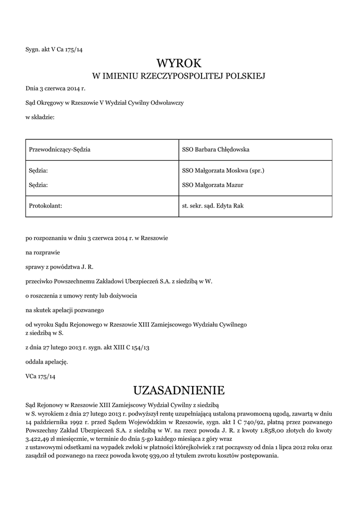 Sygn. akt V Ca 175/14 WYROK W IMIENIU RZECZYPOSPOLITEJ POLSKIEJ Dnia 3 czerwca 2014 r. Sąd Okręgowy w Rzeszowie V Wydział Cywilny Odwoławczy w składzie: Przewodniczący-Sędzia SSO Barbara Chłędowska Sędzia: SSO Małgorzata Moskwa (spr.) Sędzia: SSO Małgorzata Mazur Protokolant: st. sekr. sąd. Edyta Rak po rozpoznaniu w dniu 3 czerwca 2014 r. w Rzeszowie na rozprawie sprawy z powództwa J. R. przeciwko Powszechnemu Zakładowi Ubezpieczeń S.A. z siedzibą w W. o roszczenia z umowy renty lub dożywocia na skutek apelacji pozwanego od wyroku Sądu Rejonowego w Rzeszowie XIII Zamiejscowego Wydziału Cywilnego z siedzibą w S. z dnia 27 lutego 2013 r. sygn. akt XIII C 154/13 oddala apelację. VCa 175/14 UZASADNIENIE Sąd Rejonowy w Rzeszowie XIII Zamiejscowy Wydział Cywilny z siedzibą w S. wyrokiem z dnia 27 lutego 2013 r. podwyższył rentę uzupełniającą ustaloną prawomocną ugodą, zawartą w dniu 14 października 1992 r. przed Sądem Wojewódzkim w Rzeszowie, sygn. akt I C 740/92, płatną przez pozwanego Powszechny Zakład Ubezpieczeń S.A. z siedzibą w W. na rzecz powoda J. R. z kwoty 1.858,00 złotych do kwoty 3.422,49 zł miesięcznie, w terminie do dnia 5-go każdego miesiąca z góry wraz z ustawowymi odsetkami na wypadek zwłoki w płatności którejkolwiek z rat począwszy od dnia 1 lipca 2012 roku oraz zasądził od pozwanego na rzecz powoda kwotę 939,00 zł tytułem zwrotu kosztów postępowania. Rozstrzygnięcie powyższe sąd oparł na ustaleniach faktycznych, przytoczonych w uzasadnieniu zaskarżonego wyroku. Od powyższego wyroku apelację wniósł pozwany Powszechny Zakład Ubezpieczeń S.A. w W., domagając się jego uchylenia i oddalenia powództwa oraz zasądzenia na swoją rzecz kosztów postępowania. Apelujący zarzucił naruszenie art. 444 § 2 k.c. w zw. z art. 907 § 2 k.c. poprzez przyjęcie, iż powód w przypadku wykonywania dotychczasowego zawodu uzyskiwałby miesięcznie wynagrodzenie w kwocie netto 4 tys. zł, a skutkiem czego jest uprawniony do uzyskiwania zwiększonej miesięcznie renty z tytułu ograniczonych możliwości zarobkowych w wysokości 3 422,49 zł. Podniósł w apelacji naruszenie art. 233 k.p.c. poprzez przekroczenie granic swobodnej oceny dowodów i oparcie wyroku na wyjaśnieniach powoda i jednym zaświadczeniu. Zdaniem apelującego przyznana powodowi dniu 11 czerwca 2012 roku podwyższona renta wyrównawcza w kwocie 1 858 zł naliczona w odniesieniu do przeciętnego wynagrodzenia w kraju ogłoszonego przez Główny Urząd Statystyczny za ostatni rok, jest odpowiednia. Skarżący zakwestionował zasadność przyjęcia, że możliwości zarobkowania powodem zamykają się w kwocie wskazanej w zaświadczeniu przedłożonym przez powoda z firmy (...) sp. z o.o. w D.. Sąd Okręgowy rozważył co następuje: Wbrew zarzutom apelującego, Sąd I Instancji nie naruszył zasad swobodnej oceny dowodów i przy uwzględnieniu zasad doświadczenia życiowego i logicznie rozumując, wszechstronnie rozważył dowody zebrane w sprawie. W szczególności trafnie Sąd ocenił zeznania powoda korespondujące z zaświadczeniem wystawionym przez firmę (...) sp. z o.o. w D.. Nie doszło zatem do naruszenia przepisu art. 233 k.p.c. Zgodnie z treścią art. 444 § 2 k.c. powód jako osoba, która częściowo utraciła zdolność do pracy zarobkowej może żądać od pozwanego jako zobowiązanego do naprawienia szkody odpowiedniej renty, a w myśl art. 907 § 2 k.c. w razie zmiany stosunków każda ze stron może żądać zmiany wysokości renty. Zmiana wysokości renty wypłacanej powodowi jest uzasadniona w świetle powołanych przepisów, w sytuacji, gdy w postępowaniu dowodowym przeprowadzonym w sprawie Sąd ustalił, iż powód z zawodu spawacz stali nierdzewnych w chwili obecnej jest częściowo niezdolny do pracy i jego jedynym źródłem utrzymania jest renta inwalidzka otrzymywana z ZUS w kwocie 577,51 zł miesięcznie, a w firmy (...) Sp. z o.o. w D., zatrudniającej spawaczy posiadających uprawnienia do spawania stali nierdzewnych i innych stopów, jako spawacz z 30 letnim stażem pracy w tym zawodzie mógłby zarobić do 4.000,00 złotych netto Podzielić należy stanowisko Sądu I instancji, że brak podstaw w niniejszej sprawie do przyjęcia naliczenia wysokości renty uzupełniającej w odniesieniu do przeciętnego wynagrodzenia miesięcznego z pominięciem hipotetycznego wynagrodzenia jakie powód uzyskiwałby pracując w swoim dotychczasowym zawodzie (por. wyrok Sądu Najwyższego z dnia 27 stycznia 2011 r. sygn. I PK 165/10). Mając powyższe na uwadze Sąd Okręgowy oddalił apelację pozwanego na podstawie 385 k.p.c.