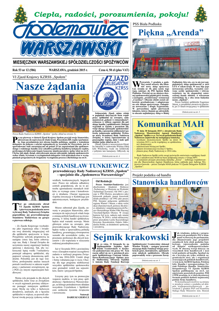 Ciepła, radości, porozumienia, pokoju! PSS Biała Podlaska Piękna „Arenda” MIESIĘCZNIK WARSZAWSKIEJ SPÓŁDZIELCZOŚCI SPOŻYWCÓW Rok 53 nr 12 (586) WARSZAWA, grudzień 2015 r. Cena 4, 50 zł (plus VAT) VI Zjazd Krajowy KZRSS „Społem” W Nasze żądania Nowa Rada Nadzorcza KZRSS „Społem” (pełny skład na stronie 5). P o raz pierwszy w historii Zjazd Krajowy Społem przyjął swoje Stanowisko, adresowane do najwyższych władz kraju, Prezydenta RP, rządu i parlamentu. Jego przedmiotem jest obrona handlu polskiego, zgodnie z wnioskiem delegatów na jednym z zebrań regionalnych we wrześniu br. Oczywiście, jest to spowodowane stale narastającymi od ponad 25 lat zagrożeniami dla społemowskiego i rodzimego handlu oraz szkodliwą polityką handlową kolejnych rządów, preferujących faktycznie bogate koncerny międzynarodowe /pełny tekst na str.5/. Chyba, jak nigdy dotąd, zdecydowanie mocno zabrzmiały żądania społemowców wobec władz, wyrażane w wystąpieniach delegatów i ich uchwałach oraz w wystąpieniach programowych /fragmenty wystąpienia prezesa J.Rybickiego na str.4/. Jednocześnie Zjazd, mimo różnic w poglądach dotyczących form współpracy spółdzielni na zewnątrz, zademonstrował „jedność w różnorodności”, zwłaszcza w obliczu zagrożeń dla polskiego handlu i spółdzielczości. Delegaci wyjechali ze Zjazdu z poczuciem siły, wciąż dużego potencjału społemowskiego handlu, z poczuciem solidarności i potrzeby jednoczenia spółdzielni. Wybrano nową 16-osobową Radę Nadzorczą Związku, w której reprezentowane są poszczególne regiony, duże i małe spółdzielnie /pełny skład na str. 5/. Obrady Zjazdu w nowoczesnym Ośrodku Jutrzenka w uzdrowisku Wieniec-Zdrój koło Włocławka, wcale nie kolidowały z pobytem tam kuracjuszy. Odbywały się Dokończenie na str. 4 Stanisław Tunkiewicz przewodniczący Rady Nadzorczej KZRSS „Społem” – specjalnie dla „Społemowca Warszawskiego” T uż po zakończeniu obrad VI Zjazdu KZRSS Społem i pierwszym posiedzeniu nowo wybranej Rady Nadzorczej Związku poprosiliśmy jej przewodniczącego Stanisława Tunkiewicza na gorąco o pierwsze refleksje. – Ze Zjazdu Krajowego wychodzimy jako organizacja silna i świadoma swej doniosłej integracyjnej roli dla spółdzielni spożywców w kraju. Przyjęliśmy uchwałę programową na następne cztery lata, która zobowiązuje nas, Radę i Zarząd Związku do uczynienia naszej organizacji bardziej sprawnej i skutecznej. Tak, aby wykorzystać lepiej wielki 7-miliardowy potencjał zakupowy spółdzielni, aby poprawić sytuację ekonomiczną spółdzielni. Potrzebna jest do tego wnikliwa, profesjonalna analiza naszych potrzeb i możliwości w zakresie współpracy z partnerami zewnętrznymi, np. z PGS czy innymi organizacjami handlowymi. Ważna rola przypada tu dla dużych spółdzielni, które wraz ze Związkiem w swych regionach powinny efektywnie pomagać mniejszym spółdzielniom. Myślę nie tylko o fachowym doradztwie, analizach, ale o łączeniu spółdzielni w większe, co pozwoli zdobywać trwałą pozycję rynkową wobec wielkich, konkurencyjnych, bogatych sieci. Prawo nie zabrania odbudowy centrali gospodarczej, ale na to potrzeba zgromadzenia niemałych środków, co wymaga czasu i konsekwencji w działaniu. Chociaż tegoroczna wspólna inwestycja w Kołobrzegu jest optymistycznym, budującym przykładem. Mocno zabrzmiał głos Zjazdu, zawarty w przyjętym Stanowisku, adresowanym do najwyższych władz kraju o zmianę polityki handlowej na równoprawną, w której handel spółdzielczy będzie miał warunki rozwoju. Moim głównym celem na zewnątrz, jako przewodniczącego Rady Nadzorczej, będzie walka o sprawiedliwą politykę handlową, gwarantującą równoprawne warunki dla uczestników rynku, zaprzestanie preferencji dla obcych koncernów i ich wspierania w niszczeniu rodzimej przedsiębiorczości. Już w I kwartale 2016 r. powinniśmy wraz z Zarządem rozpisać szczegółowe zadania w realizacji programu Związku na lata 2016-2020. Ustalić drogi i formy wdrażania jego w życie. Chcemy dla tego programu mobilizować wszystkie spółdzielnie społemowskie oraz gromadzić wokół nas sojuszników, fanów i przyjaciół Społem. Liczymy przy tym na promocyjne wsparcie mediów, w tym prasy spółdzielczej i Społemowca Warszawskiego, za którego pośrednictwem składam wszystkim Czytelnikom i Spółdzielcom serdeczne życzenia świąteczne i noworoczne. Notował: DARIUSZ GIERYCZ Od Redakcji: Prezes StanisławTunkiewicz jest absolwentem Akademii Rolniczo -Technicznej w Olsztynie na Wydziale Technologii Żywności. Od 1981 r. pracuje w PSS Olsztyn, początkowo jako kierownik piekarni, potem kierownik działu produkcji i od 1992 jako prezes PSS. Inicjator połączenia spółdzielni regionu Warmii i Mazur, a także wielu akcji charytatywnych, pomocy dla dzieci, młodzieży i niepełnosprawnych.Prezes Olsztyńskiego Klubu Piłki Ręcznej Traveland-Społem Olsztyn. W swojej karierze był m.in. radnym rady miasta Olsztyna. W 2010 r. został odznaczony przez prezydenta Lecha Kaczyńskiego Krzyżem Kawalerskim Orderu Odrodzenia Polski, za działalność społeczną i zawodową. czwartek, 3 grudnia o godz. 9tej został otwarty dla klientów nowy sklep spożywczy Lux Arenda nr 10, jako szósty tego typu, należący do PSS Społem Biała Podlaska. Powstał on na miejscu dawnej społemowskiej pijalni piwa Arenda, a następnie „arendowanej” restauracji „Czardasz”. Obecnie obiekt został całkowicie przebudowany i adaptowany na cele sklepu spożywczego. Zakupiono nowoczesne i drogie wyposażenie. W powszechnej opinii pierwszych klientów, którzy tłumnie go odwiedzili, to obecnie najładniejszy sklep w Białej Podlaskiej. Kto wie, czy to nie jest najpiękniejszy sklep społemowski w sieci LUX w całym kraju. W oczy bije jego nowoczesna sylwetka, wyraziste czerwone szyldy społemowskie i witryny wejściowe na tle eleganckiej szaroc