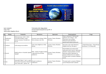 Język: niemiecki Grupy: NG2 Opracował(a): Magdalena Macoń Lp. Miesiąc Tytuł podręcznika: Prima A2 kl.2 Poziom kompetencji językowej wg CEF: A1 Konsultanci: Gramatyka Słownictwo Sprawności Funcje językowe Październik / 1. Listopad Zdania przeczące "nicht" i "kein"; Czasowniki modalne: wollen, muessen, koennen: Przyimki: am, im, um Czynności czasu wolnego; Hobby; Czytanie, Pisanie, Słuchanie, Nazwy miesięcy i pór roku Mówienie Pisanie wiadomości E-Mail (sposób spędzania czasu wolnego - opis), Planowanie czasu wolnego, Selekcjonowanie informacji z autentycznych tekstów prasowych 2. Grudzień Liczba mnoga rzeczowników; Części ciała; dolegliwości; Moda - Czytanie, Pisanie, Słuchanie, ubrania; Mówienie Nazywanie części ciała; Mówienie o dolegliwościach np. bóle głowy 3. Styczeń Moda - ubrania; Wygląd; Urodziny Zaimki osobowe w bierniku; Spójnik Czytanie, Pisanie, Słuchanie, - zaproszenia oraz życzenia "deshalb" Mówienie urodzinowe Wypowiadanie się na temat mody; Opisywanie siebie i innych, Opisywanie obrazków; Przeprowadzanie wywiadu; Kupowanie ubrań; Zapraszanie na przyjęcie telefonicznie oraz osobiście; Wyrażanie opinii o przyjęciu; Składanie życzeń; 4. Luty Czasowniki "haben" i "sein" w czasie Przyjęcie urodzinowe; przeszczłym Praeteritum; Określenia Codzienność czasu "letztes Jahr", "gestern" itd.. Wyrażanie opinii o przyjęciu; Składanie życzeń; Relacjonowanie wydarzeń; Czytanie, Pisanie, Słuchanie, Mówienie Uwagi * Projekt Kleine Pause - Święta Bożego Narodzenia S. 39 (Podręcznik) 5. Marzec Przyimki: seit, bei, aus, nach, mit, zu: Klamra zdaniowa: Czas przeszły Miasto - obiekty i inne budynki; Perfekt z czasownikiem posiłkowym Opis drogi; "haben" 6. Kwiecień Czas przeszły Perfekt z czasownikami posiłkowymi "haben" i Podróż - bagaż, cele podróży, plan Czytanie, Pisanie, Słuchanie, "sein"; formy nieregularne podróży, pocztówki Mówienie czasowników w czasie przeszłym Mówienie o planach, opowiadanie o planach wakacyjnych; formułowanie argumentów za i przeciw, relacjonowanie wydarzeń z przeszłości, pisanie pocztówki z wakacji 7. Maj Zdania podrzędnie złożone ze spójnikiem "weil", "dass" Czytanie, Pisanie, Słuchanie, Mówienie Wyrażanie nadzieji i życzeń; formułowanie przypuszczeń; rozmawianie o zawodach; uzasadnianie swojej opinii; 8. Czerwiec Powtórzenie materiału rozdziałów 1Stres, Plany, Cele 7 Mówienie, Czytanie Dawanie rad; Opisywanie swoich uczuć Moje plany - zawody, marzenia, życzenia, Czytanie, Pisanie, Słuchanie, Mówienie Opowiadanie o swoim mieście; opisywanie swojej drogi do szkoły; relacjonowanie wydarzeń przeszłości *Kleine Pause - Powtórzenie rozdziałów 1-4