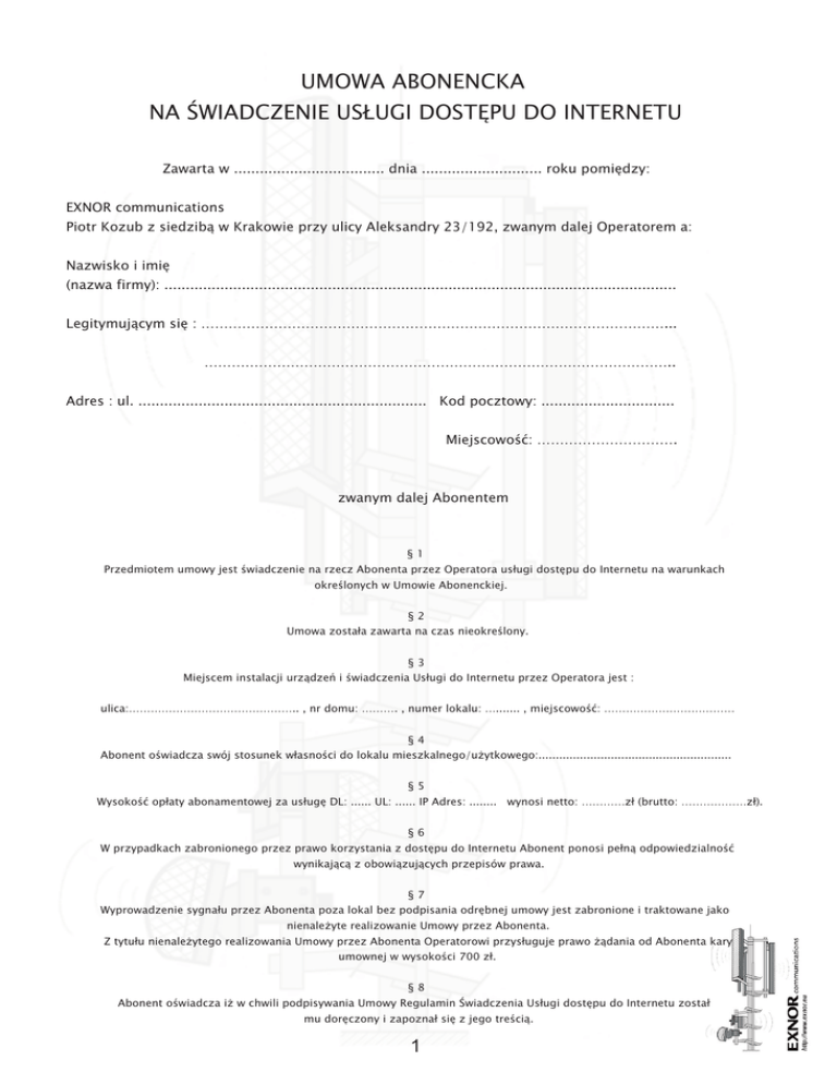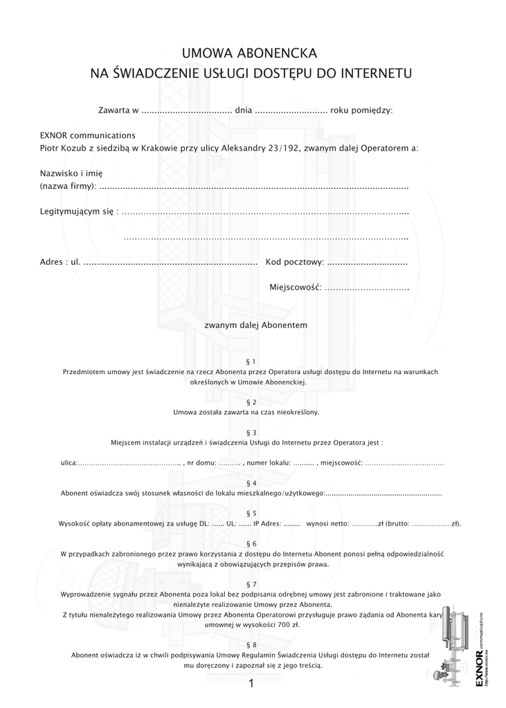 UMOWA ABONENCKA NA ŒWIADCZENIE US£UGI DOSTÊPU DO INTERNETU Zawarta w ................................... dnia ............................ roku pomiêdzy: EXNOR communications Piotr Kozub z siedzib¹ w Krakowie przy ulicy Aleksandry 23/192, zwanym dalej Operatorem a: Nazwisko i imiê (nazwa firmy): ....................................................................................................................... Legitymuj¹cym siê : …………………………………………………………………………………………... ………………………………………………………………………………………….. Adres : ul. ................................................................... Kod pocztowy: ............................... Miejscowoœæ: …………………………. zwanym dalej Abonentem §1 Przedmiotem umowy jest œwiadczenie na rzecz Abonenta przez Operatora us³ugi dostêpu do Internetu na warunkach okreœlonych w Umowie Abonenckiej. §2 Umowa zosta³a zawarta na czas nieokreœlony. §3 Miejscem instalacji urz¹dzeñ i œwiadczenia Us³ugi do Internetu przez Operatora jest : ulica:……………………………………….. , nr domu: ………. , numer lokalu: …....... , miejscowoœæ: ……………………………… §4 Abonent oœwiadcza swój stosunek w³asnoœci do lokalu mieszkalnego/u¿ytkowego:........................................................ §5 Wysokoœæ op³aty abonamentowej za us³ugê DL: ...... UL: ...... IP Adres: ........ wynosi netto: …………z³ (brutto: ………………z³). §6 W przypadkach zabronionego przez prawo korzystania z dostêpu do Internetu Abonent ponosi pe³n¹ odpowiedzialnoœæ wynikaj¹c¹ z obowi¹zuj¹cych przepisów prawa. §7 Wyprowadzenie sygna³u przez Abonenta poza lokal bez podpisania odrêbnej umowy jest zabronione i traktowane jako nienale¿yte realizowanie Umowy przez Abonenta. Z tytu³u nienale¿ytego realizowania Umowy przez Abonenta Operatorowi przys³uguje prawo ¿¹dania od Abonenta kary umownej w wysokoœci 700 z³. §8 Abonent oœwiadcza i¿ w chwili podpisywania Umowy Regulamin Œwiadczenia Us³ugi dostêpu do Internetu zosta³ mu dorêczony i zapozna³ siê z jego treœci¹. 1 §9 Umowa mo¿e byæ wypowiedziana przez Abonenta ze skutkiem na koniec okresu rozliczeniowego z jednomiesiêcznym terminem jej wypowiedzenia . § 10 Wszelkie zmiany dokonywane s¹ w formie pisemnego aneksu pod rygorem niewa¿noœci. § 11 W przedmiotach nieuregulowanych w Umowie zastosowanie maj¹ przepisy Kodeksu Cywilnego oraz Ustawy Prawo Telekomunikacyjne. § 12 Wszelkie spory wynikaj¹ce ze stosowania Umowy bêd¹ rozstrzygane przez s¹d w³aœciwy dla miejsca zamieszkania lub siedziby Abonenta. § 13 Umowê sporz¹dzono w dwóch jednobrzmi¹cych egzemplarzach, po jednym dla ka¿dej ze stron. EXNOR communications 30-837 Kraków, ul. Aleksandry 23/192 NIP: 679-276-27-91 REGON: 120457005 Telefon: 0 503 800 440 E-mail: [email protected] ........................................... ........................................... Abonent Operator Model Numer fabryczny sprzêtu MAC: APC PC Numer wewnêtrzny : : : : : : : : (Wype³nia Operator ) 2 : :