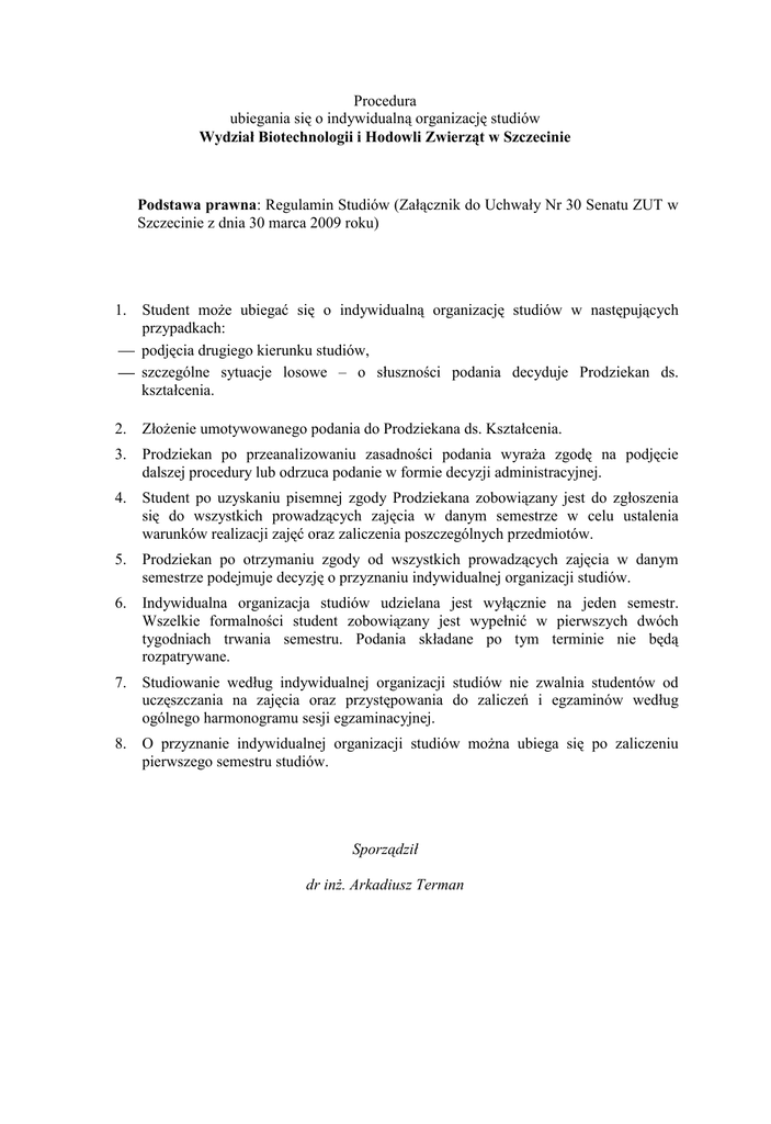 Procedura ubiegania się o indywidualną organizację studiów Wydział Biotechnologii i Hodowli Zwierząt w Szczecinie Podstawa prawna: Regulamin Studiów (Załącznik do Uchwały Nr 30 Senatu ZUT w Szczecinie z dnia 30 marca 2009 roku) 1. Student może ubiegać się o indywidualną organizację studiów w następujących przypadkach: podjęcia drugiego kierunku studiów, szczególne sytuacje losowe – o słuszności podania decyduje Prodziekan ds. kształcenia. 2. Złożenie umotywowanego podania do Prodziekana ds. Kształcenia. 3. Prodziekan po przeanalizowaniu zasadności podania wyraża zgodę na podjęcie dalszej procedury lub odrzuca podanie w formie decyzji administracyjnej. 4. Student po uzyskaniu pisemnej zgody Prodziekana zobowiązany jest do zgłoszenia się do wszystkich prowadzących zajęcia w danym semestrze w celu ustalenia warunków realizacji zajęć oraz zaliczenia poszczególnych przedmiotów. 5. Prodziekan po otrzymaniu zgody od wszystkich prowadzących zajęcia w danym semestrze podejmuje decyzję o przyznaniu indywidualnej organizacji studiów. 6. Indywidualna organizacja studiów udzielana jest wyłącznie na jeden semestr. Wszelkie formalności student zobowiązany jest wypełnić w pierwszych dwóch tygodniach trwania semestru. Podania składane po tym terminie nie będą rozpatrywane. 7. Studiowanie według indywidualnej organizacji studiów nie zwalnia studentów od uczęszczania na zajęcia oraz przystępowania do zaliczeń i egzaminów według ogólnego harmonogramu sesji egzaminacyjnej. 8. O przyznanie indywidualnej organizacji studiów można ubiega się po zaliczeniu pierwszego semestru studiów. Sporządził dr inż. Arkadiusz Terman