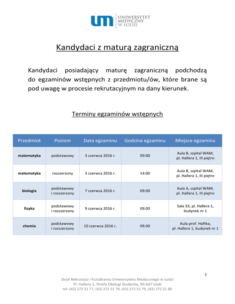 Kandydaci z maturą zagraniczną Kandydaci posiadający maturę zagraniczną podchodzą do egzaminów wstępnych z przedmiotu/ów, które brane są pod uwagę w procesie rekrutacyjnym na dany kierunek. Terminy egzaminów wstępnych Przedmiot Poziom Data egzaminu Godzina egzaminu Miejsce egzaminu matematyka podstawowy 3 czerwca 2016 r. 09:00 Aula B, szpital WAM, pl. Hallera 1, III piętro matematyka rozszerzony 3 czerwca 2016 r. 14:00 Aula B, szpital WAM, pl. Hallera 1, III piętro biologia podstawowy i rozszerzony 7 czerwca 2016 r. 09:00 Aula A, szpital WAM, pl. Hallera 1, III piętro fizyka podstawowy i rozszerzony 9 czerwca 2016 r. 09.00 Sala 33, pl. Hallera 1, budynek nr 1 chemia podstawowy i rozszerzony 10 czerwca 2016 r. 09.00 Aula prof. Haftka, pl. Hallera 1, budynek nr 1 1 Dział Rekrutacji i Kształcenia Uniwersytetu Medycznego w Łodzi Pl. Hallera 1, Strefa Obsługi Studenta, 90-647 Łódź tel: (42) 272 51 77, (42) 272 51 78, (42) 272 51 79, (42) 272 51 80 UWAGA! Wybór uczelni wyższej (innej niż Uniwersytet Medyczny w Łodzi), na której kandydaci chcą podejść do egzaminu wstępnego, nie jest jednoznaczny z zapisaniem się na ten egzamin. Kandydaci muszą poinformować daną uczelnię o swoim wyborze. Pamiętaj! Po otrzymaniu wyników egzaminów wstępnych uzupełnij wyniki na swoim koncie rekrutacyjnym. Listę uczelni, która podpisała porozumienie o wzajemnym honorowaniu wyników egzaminów wstępnych, zdawanych przez kandydatów ze „starą maturą/maturą zagraniczną” na innej Uczelni Medycznej w Polsce znajdziesz – tutaj. 2 Dział Rekrutacji i Kształcenia Uniwersytetu Medycznego w Łodzi Pl. Hallera 1, Strefa Obsługi Studenta, 90-647 Łódź tel: (42) 272 51 77, (42) 272 51 78, (42) 272 51 79, (42) 272 51 80